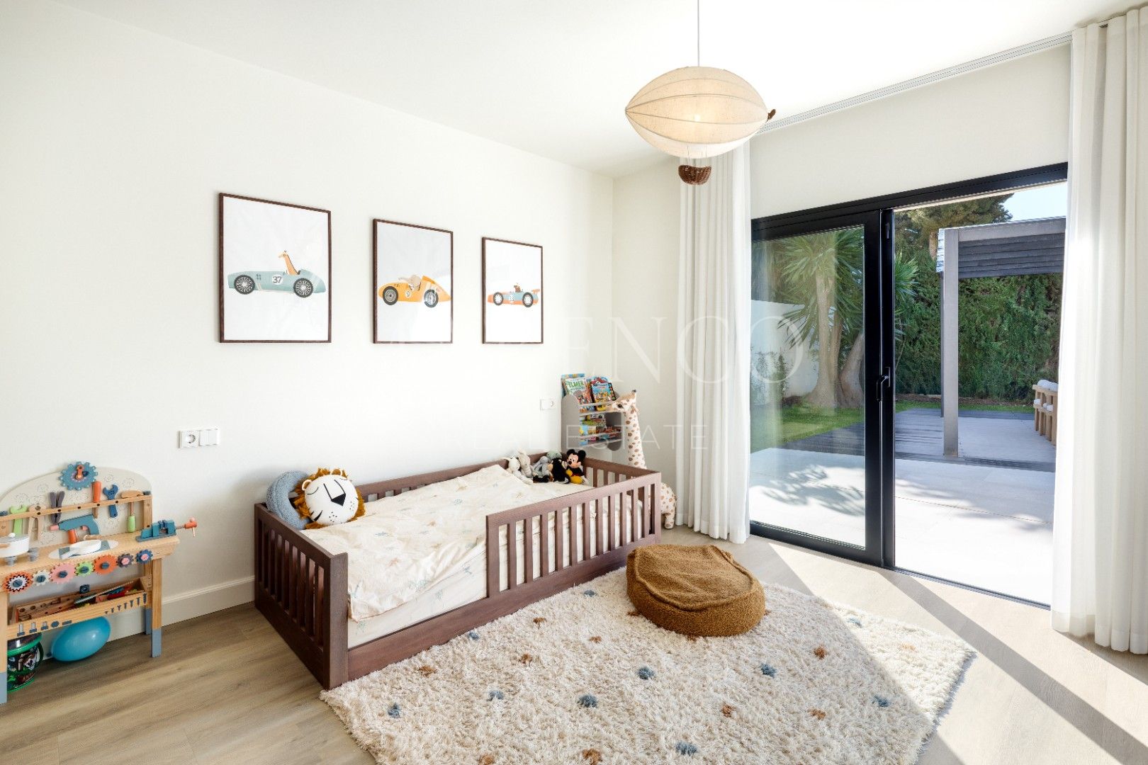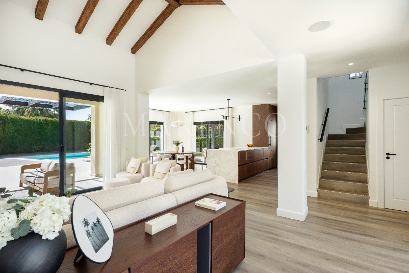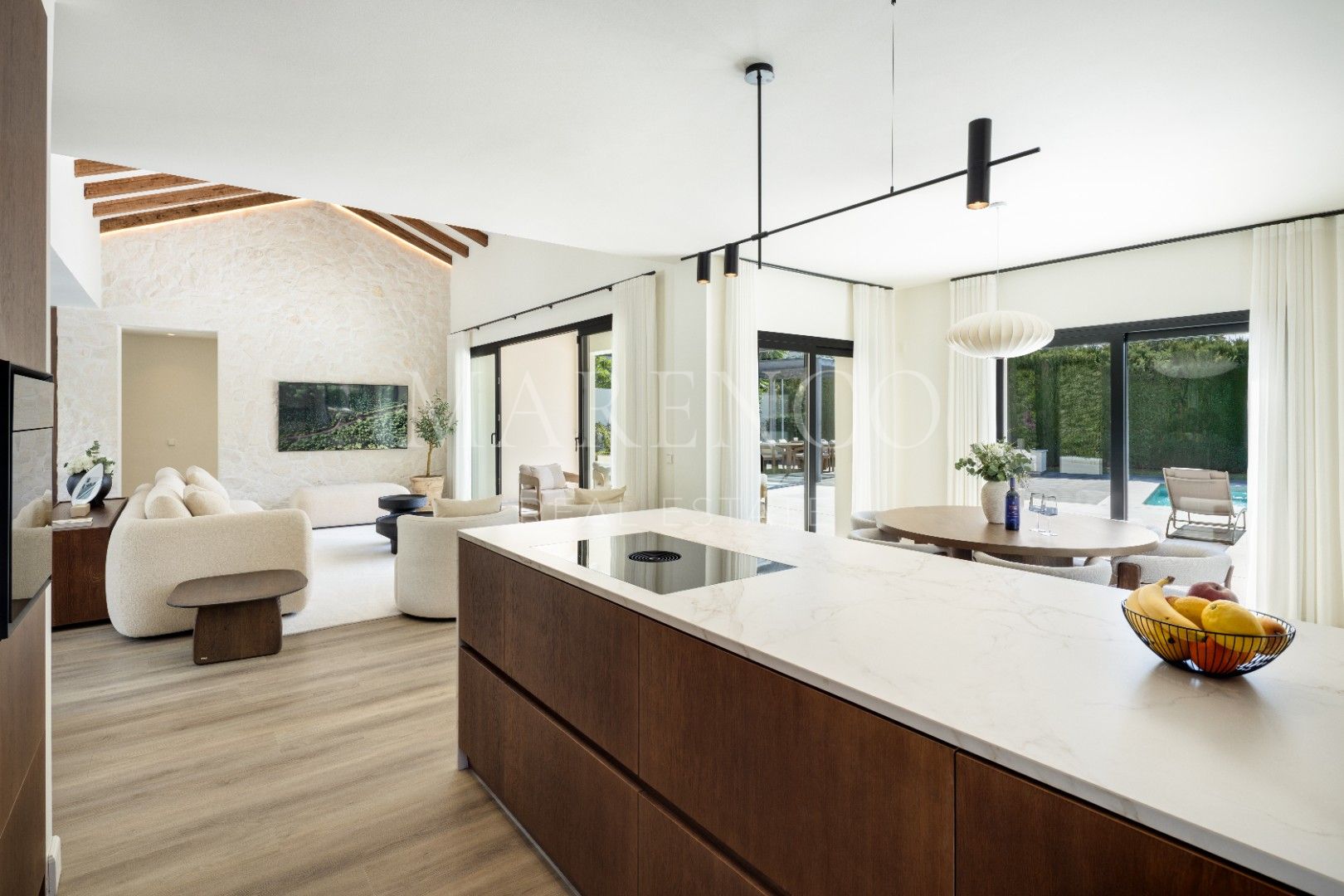 In dieser zeitgenössischen Villa in Cortijo Blanco, San Pedro de Alcántara wurde jedes Detail sorgfältig durchdacht, um ein komfortables und anspruchsvolles Wohngefühl zu schaffen. Die lichtdurchfluteten Innenräume mit Materialien wie Holz und Stein spiegeln eine moderne mediterrane Ästhetik wider, während große Fensterflächen die Verbindung zwischen Innen- und Außenbereich verstärken. Zur Ausstattung gehören außerdem eine hochwertige Küche, ein Alarmsystem, automatische Bewässerung und ein beheizter Swimmingpool.