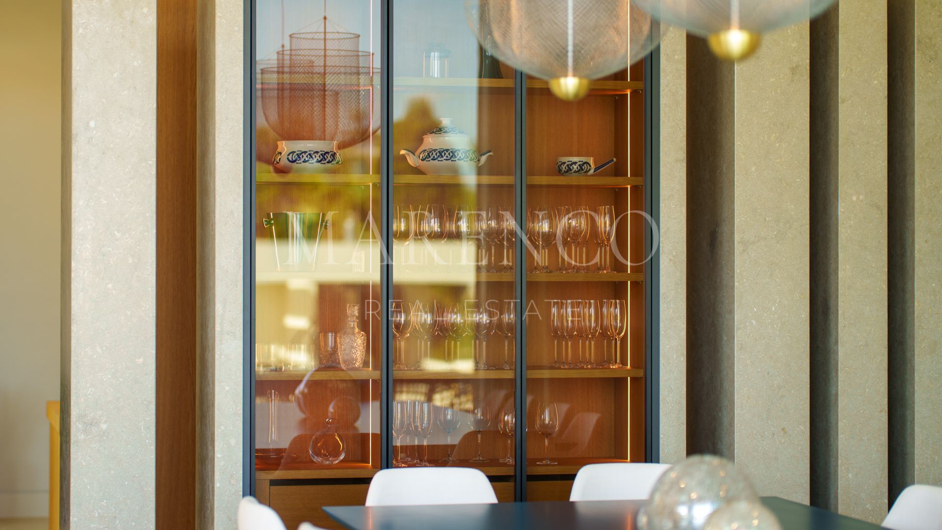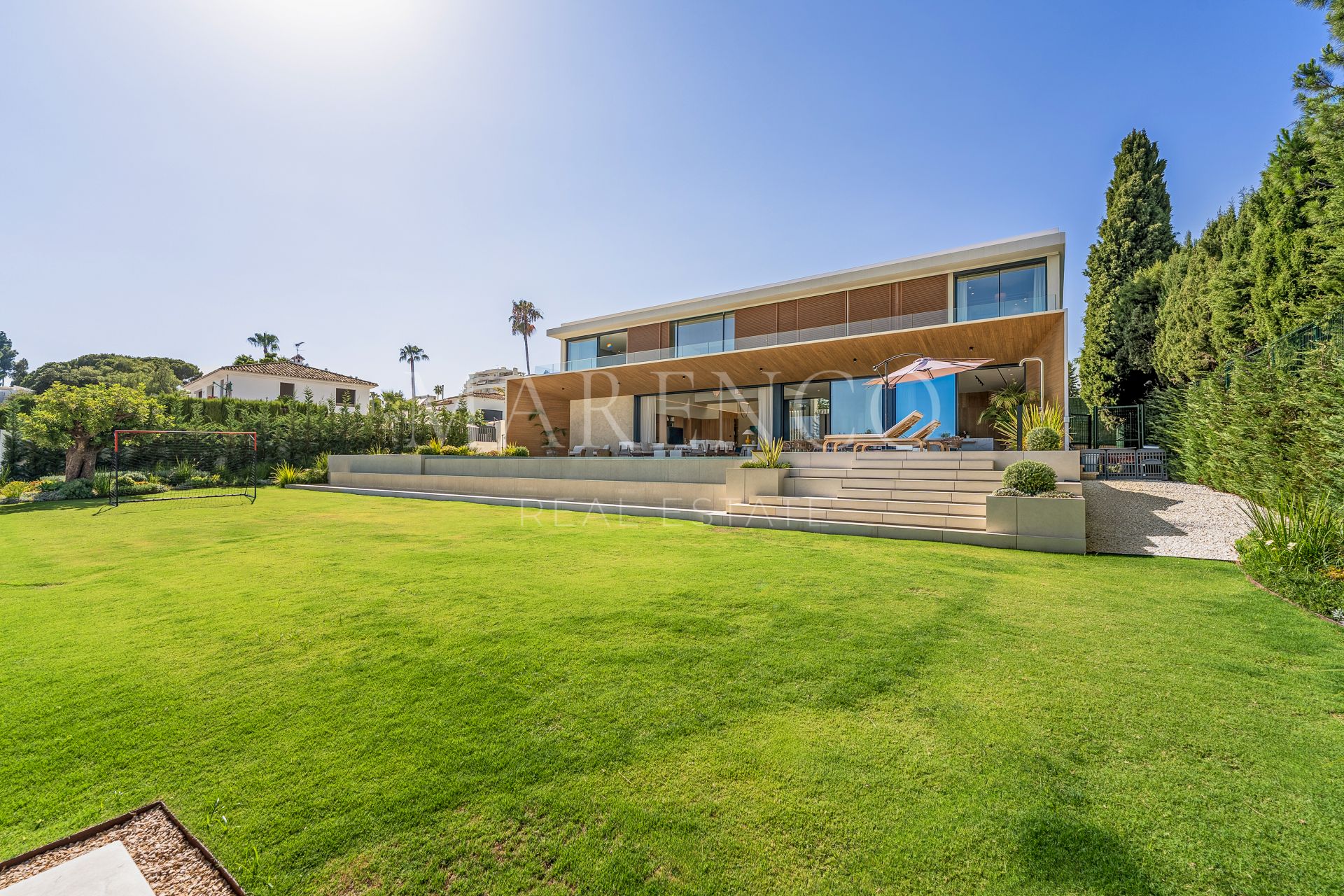 Im Inneren bietet die Villa 1.057 m² bebaute Fläche und 382 m² Terrassen, konzipiert, um Innen- und Außenbereiche nahtlos miteinander zu verbinden. Das großzügige, offene Wohn- und Esszimmer geht durch raumhohe Fenster in die Terrassen- und Poolbereiche über und vermittelt ein Gefühl von Weite und Wohlbefinden. Die voll ausgestattete Designerküche, doppelte Deckenhöhe und fließende Raumaufteilung machen diese Villa ideal für Familienleben und stilvolle Gästeempfänge.