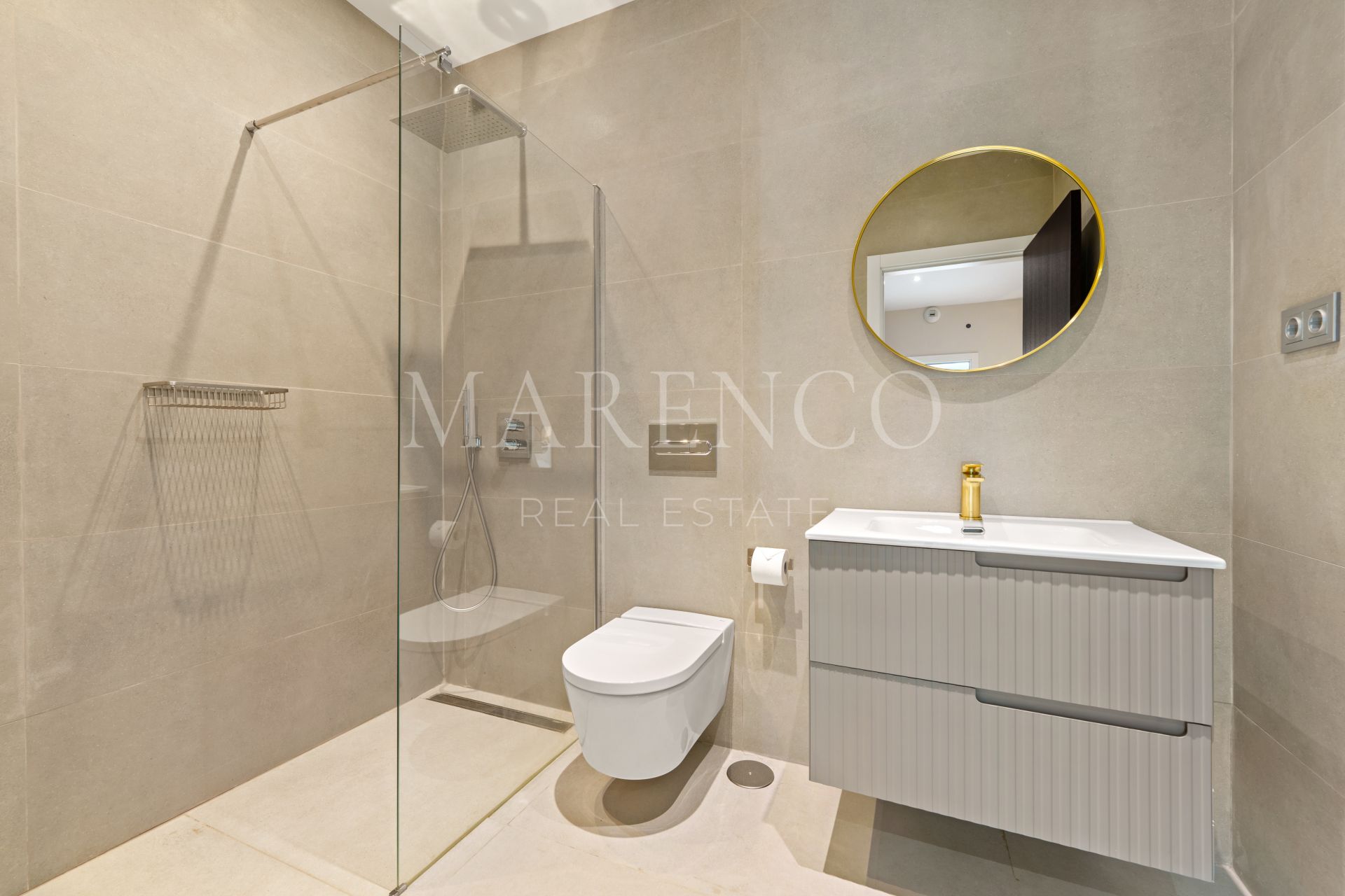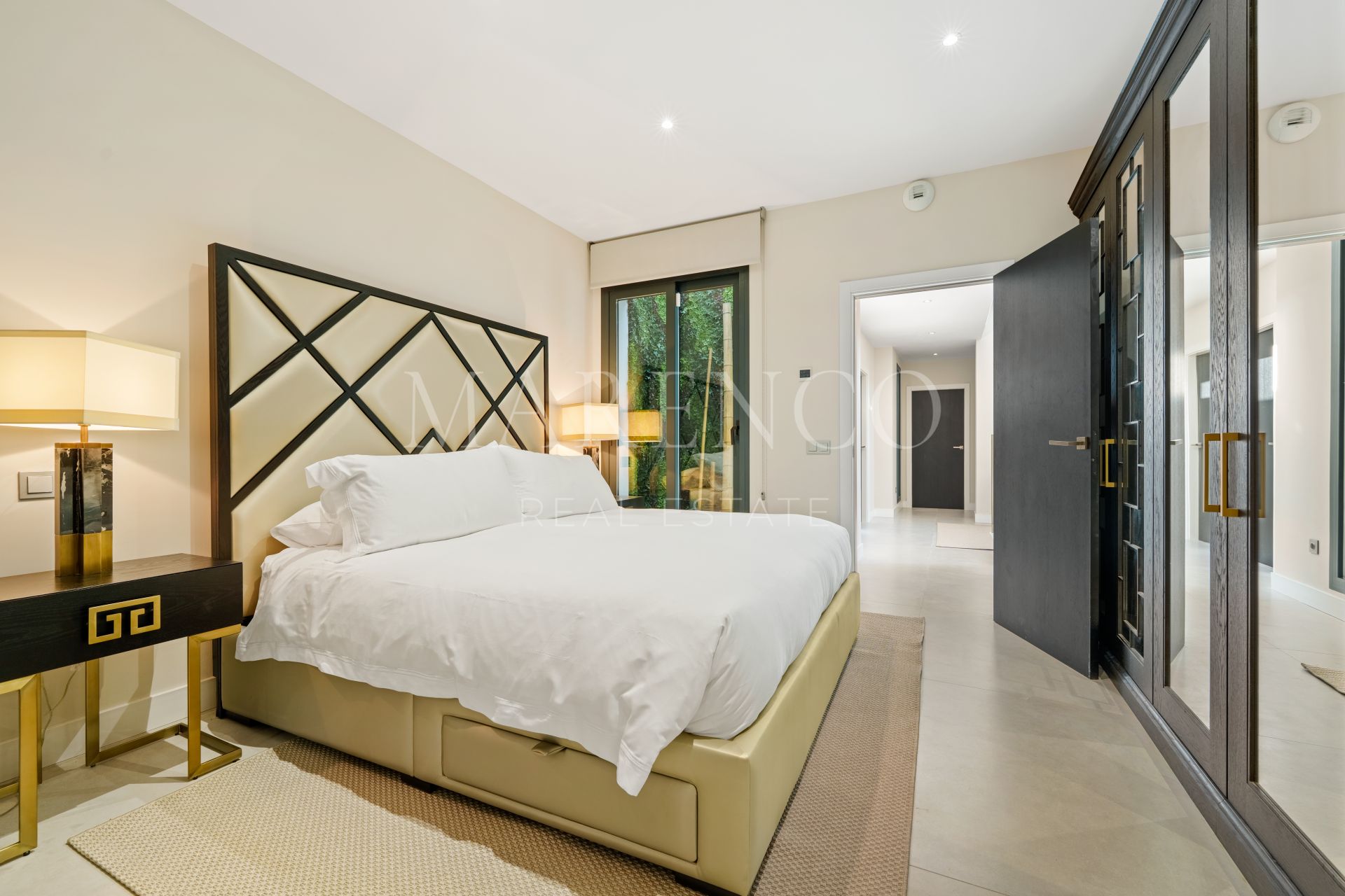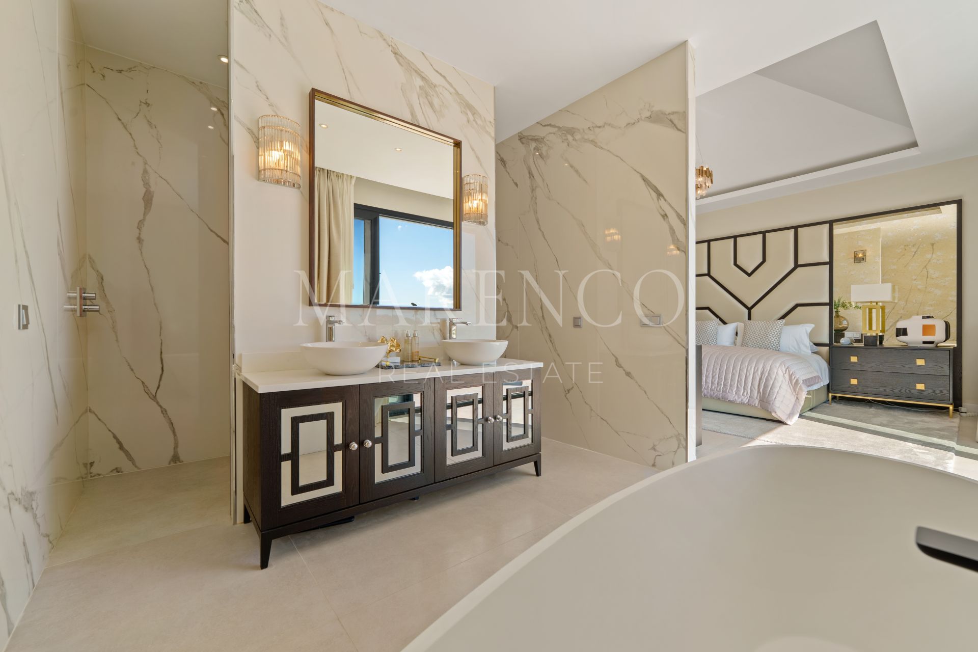Mit 581 m² bebauter Fläche auf einem 1.231 m² großen Grundstück verfügt die Villa über eine großzügige und durchdachte Raumaufteilung. Das Hauptgeschoss umfasst einen offenen Wohnbereich, einen Essbereich und eine vollständig ausgestattete Küche, verbunden durch raumhohe Glasfronten, die direkt zu den Terrassen und in den Garten führen. Die Immobilie bietet 6 Schlafzimmer und 5 Badezimmer, ergänzt durch zwei Gäste-WCs. Die Räume überzeugen mit modernen Interiors, eleganten Details und viel natürlichem Licht. Viele Schlafzimmer verfügen über private Terrassen, die zusätzlichen Komfort und Privatsphäre bieten.