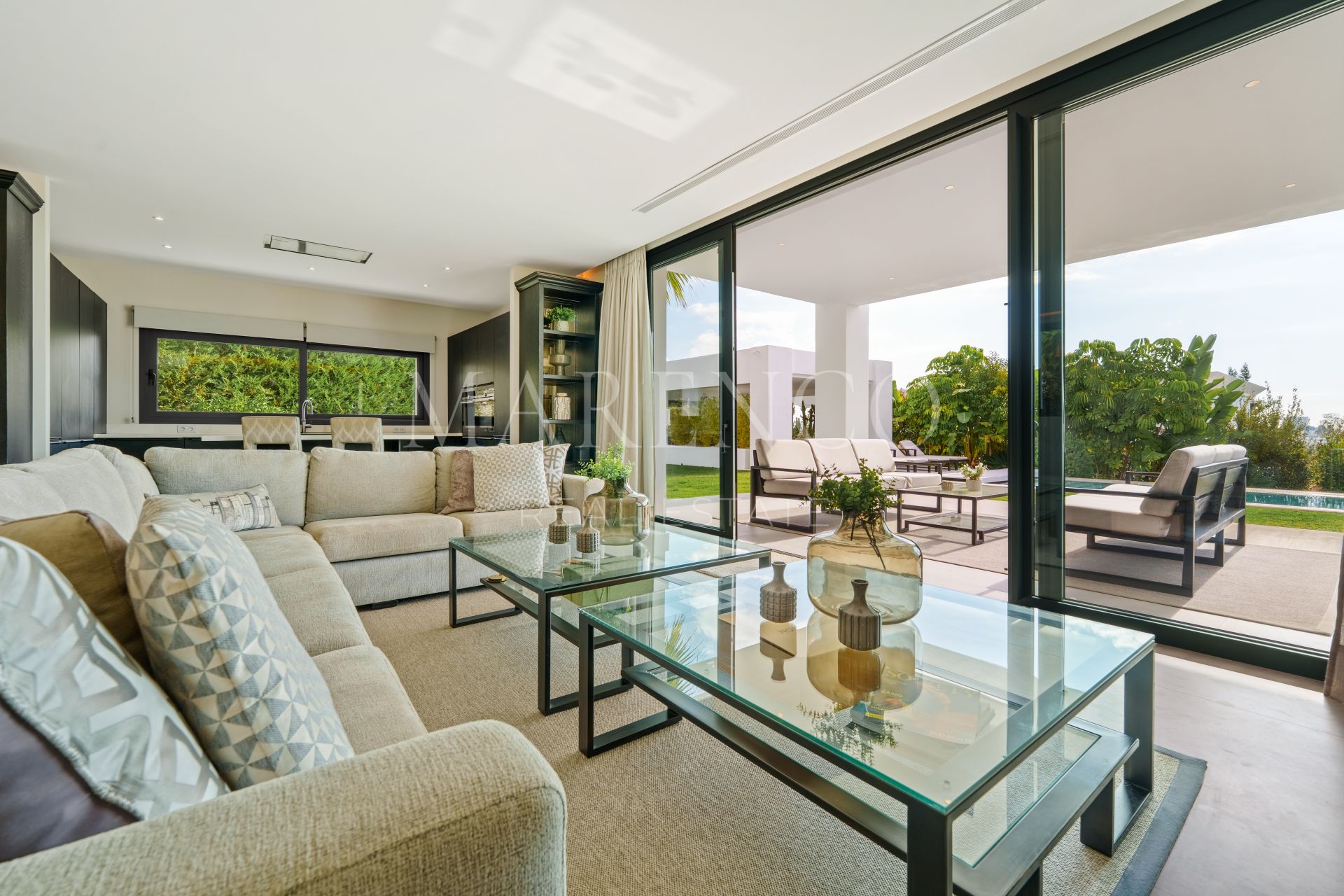 In einer erhöhten und ruhigen Umgebung, umgeben von Natur, bietet diese elegante zeitgenössische Villa in La Quinta einen Lebensstil voller Licht, Ruhe und Ausgeglichenheit. Die moderne Architektur, klaren Linien und großzügigen Fensterfronten schaffen sofort ein Gefühl von Wohlbefinden. Der Tag beginnt mit Blick auf den gepflegten Garten und endet auf Terrassen, die nahtlos in den Außenbereich übergehen.