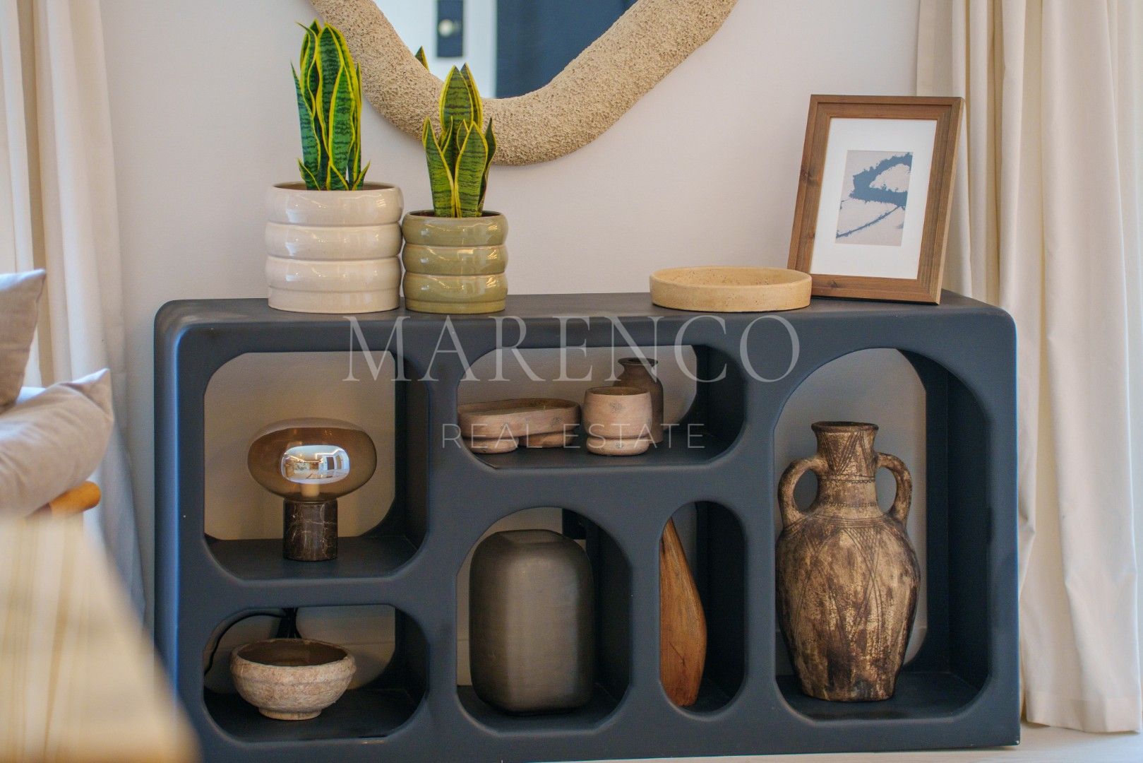Jeder Raum strahlt ein perfektes Gleichgewicht zwischen Komfort und Eleganz aus. Neutrale Farbtöne, natürliche Texturen und handwerkliche Oberflächen schaffen eine warme, raffinierte Atmosphäre. Maßgefertigte Möbel, skulpturale Beleuchtung und sorgfältig ausgewählte Dekorelemente verleihen Charakter und Stil, während das natürliche Licht die mediterrane Landschaft eindrucksvoll in Szene setzt.