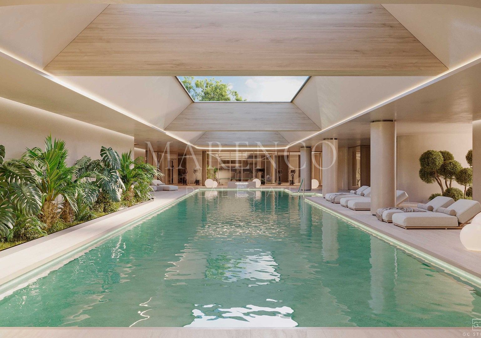 Le niveau inférieur est entièrement dédié au bien-être : piscine intérieure chauffée, spa avec sauna et hammam, salle de massage, cinéma privé, salle de sport, vestiaires et garage pour trois voitures. La résidence propose également des espaces communs exceptionnels : piscine extérieure, jardins paysagers, salle de sport entièrement équipée, spa baigné de lumière naturelle, court de padel et zones sociales conçues comme le cœur du projet.