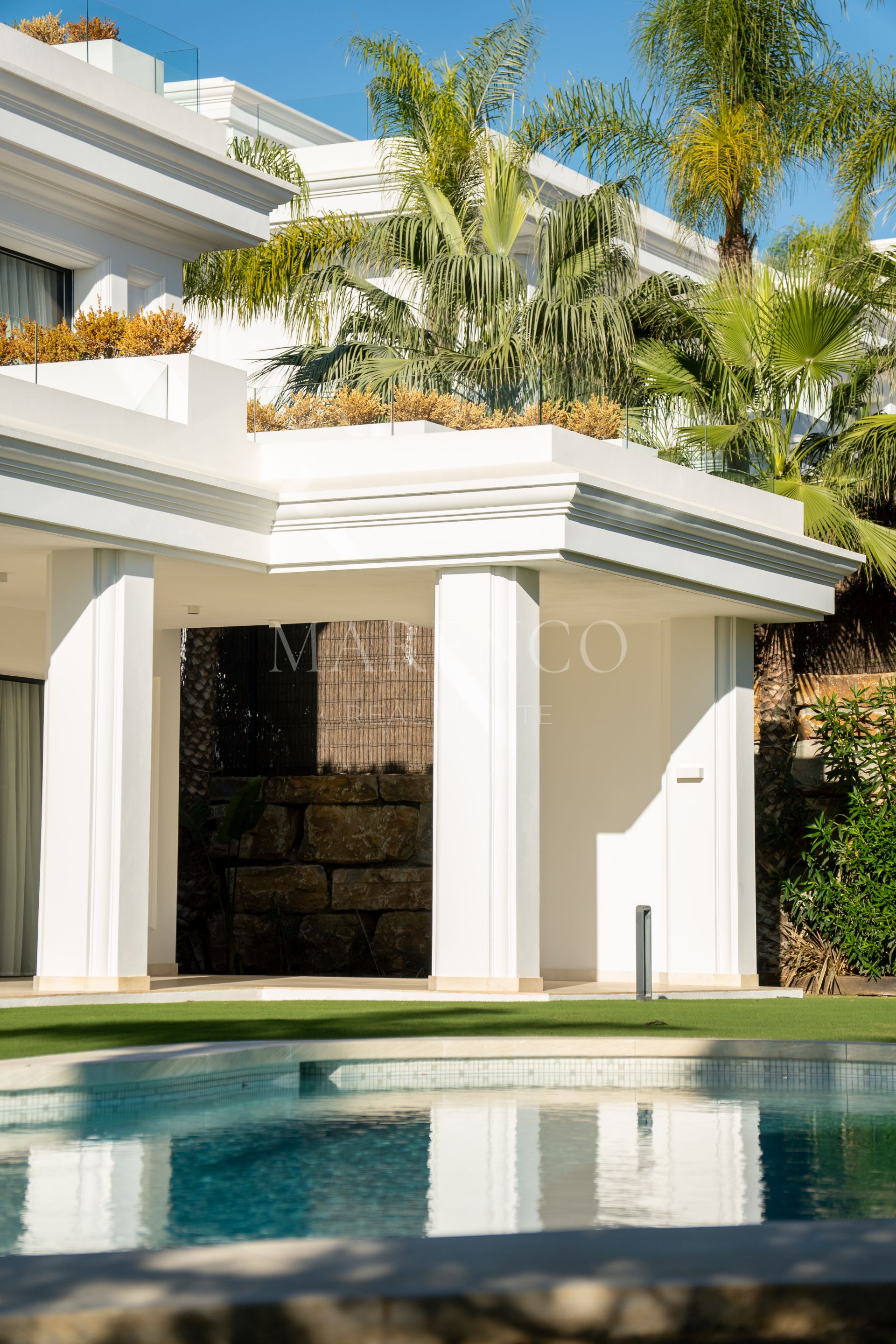 Cada villa ha sido concebida para ofrecer una experiencia de vida completa, incorporando piscina privada de agua salada, amplias terrazas, solárium con vistas panorámicas y gimnasio privado. Además, incluyen garaje, zona de lavandería y una cocina secundaria, pensada para un uso más funcional. La calidad de los materiales y los acabados refleja un estándar superior, con una atención al detalle que se percibe en cada estancia.