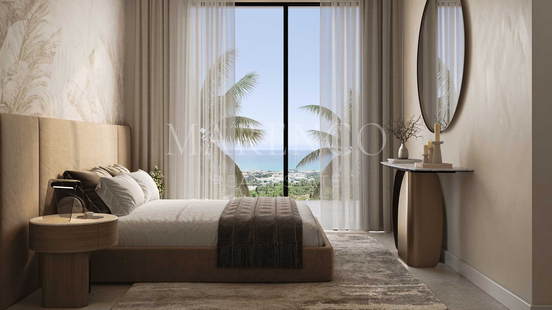 El complejo residencial se compone de 105 apartamentos, 14 garden villas y 14 sky villas, todos con un diseño moderno, sostenible y lleno de luz natural. Cada vivienda ofrece una distribución fluida, amplias terrazas panorámicas con vistas al mar y al valle, y acabados personalizables de alta gama. Con superficies generosas y materiales de primera calidad, cada detalle de Emerald View ha sido pensado para el confort y la sofisticación. Entre sus características más destacadas se incluyen suelos radiantes, sistema de aerotermia, aislamiento acústico y térmico de alta eficiencia, y grandes ventanales que maximizan la luminosidad natural.