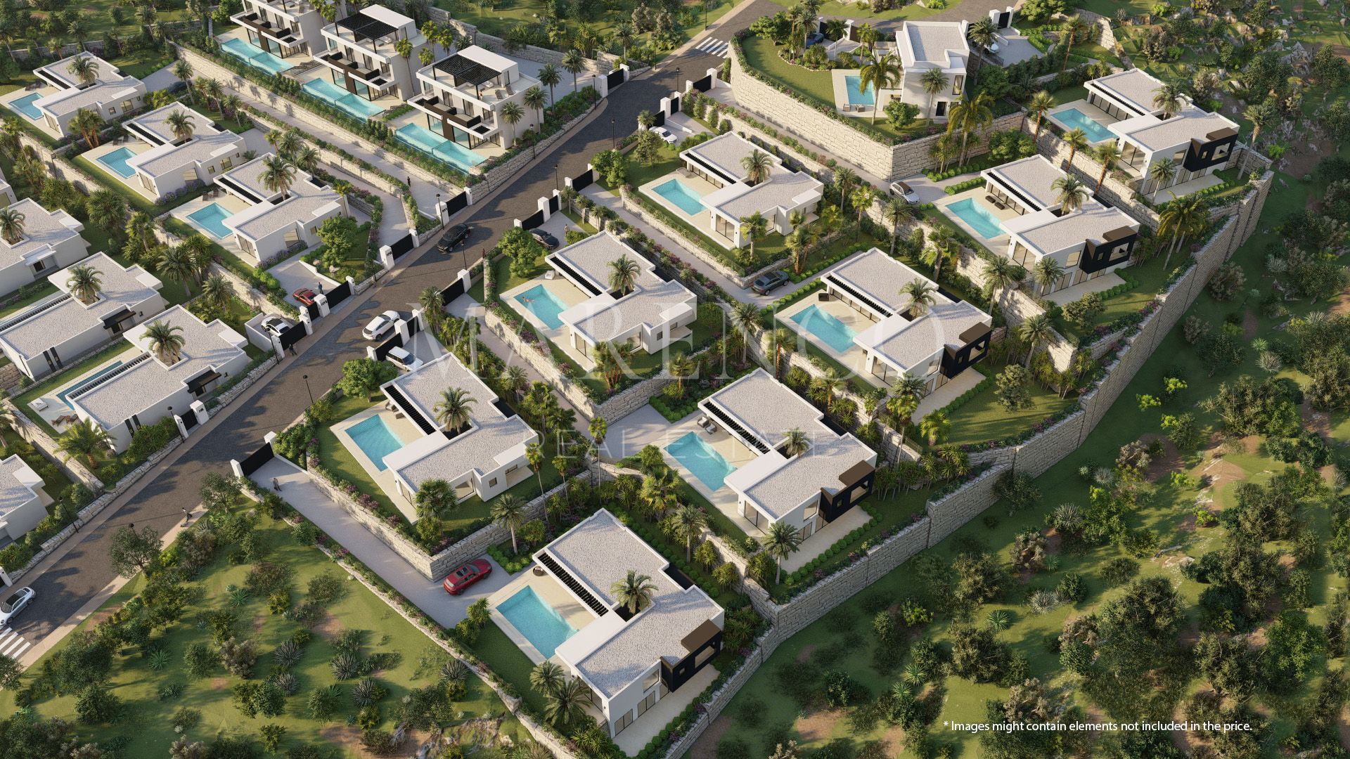 Dentro de este concepto, el proyecto destaca por sus líneas limpias, su diseño eficiente y su cuidada relación entre interior y exterior. Según el brochure, una de las tipologías de villa ofrece 137,19 m² interiores, 158 m² construidos y 80 m² de terraza, reflejando la atención al espacio, la luz natural y el confort que define el conjunto. Las amplias terrazas, los jardines y las zonas exteriores refuerzan esa sensación de amplitud, bienestar y conexión con el paisaje.