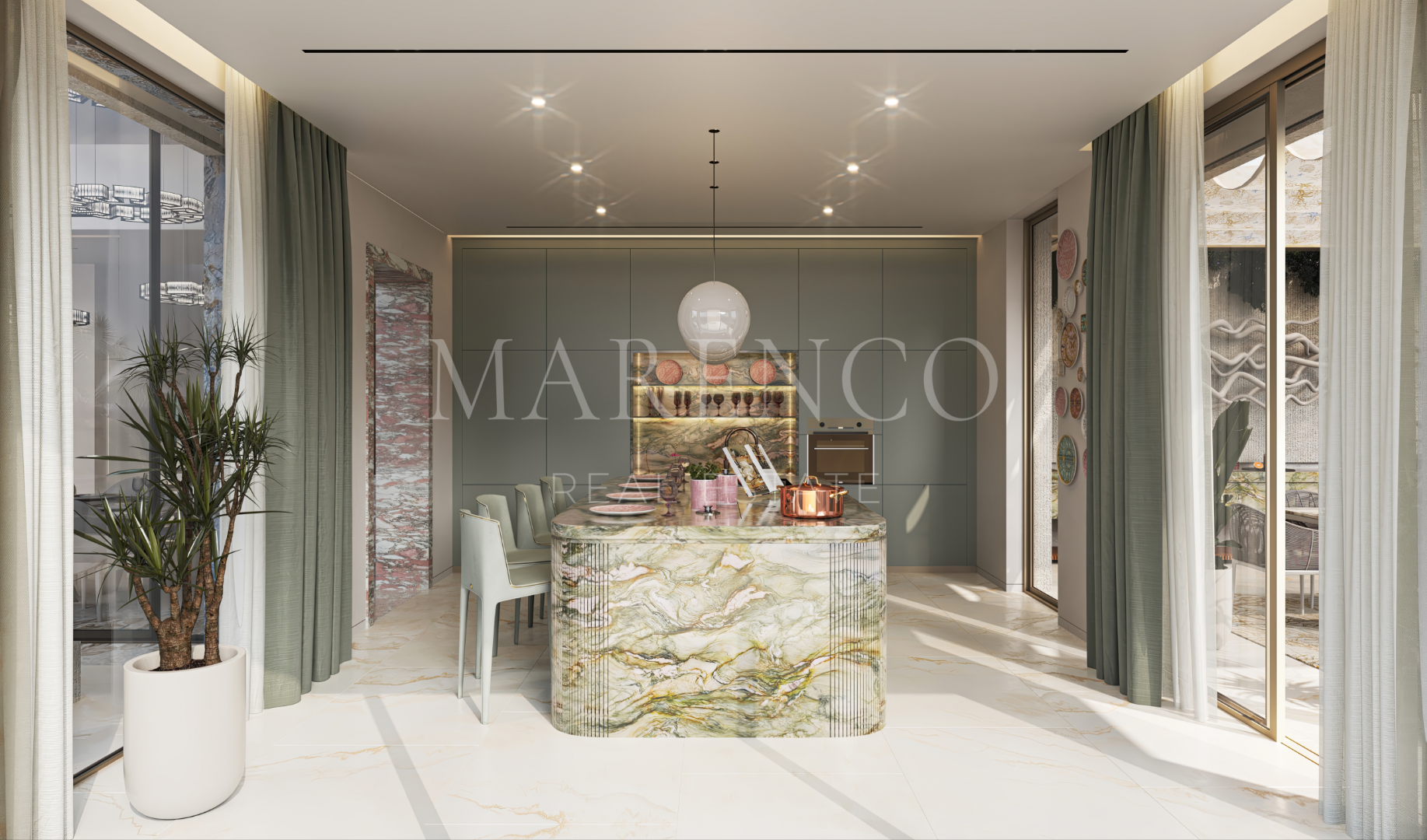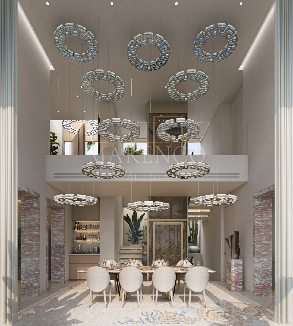 Cada villa se sitúa sobre amplias parcelas de aproximadamente 2.000 m² y ofrece una superficie total construida cercana a los 1.639 m², distribuidos en varias plantas conectadas mediante ascensor privado. La planta principal alberga espacios de vida de más de 200 m² que se abren hacia terrazas cubiertas y descubiertas, creando una transición natural entre interior y exterior. El proyecto contempla cinco dormitorios en suite por vivienda, incluyendo una espectacular suite principal con vestidor y baño de diseño. Mármol italiano, mosaicos personalizados y detalles emblemáticos como la Greca y la Medusa de Versace definen el carácter de los interiores.