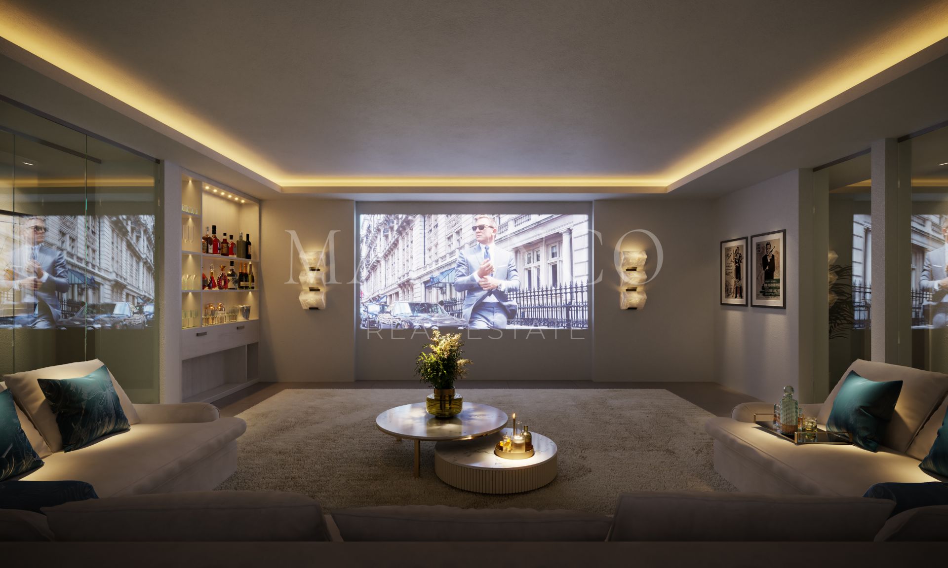 Distributed over 3 levels, it welcomes us with a magnificent entrance, surrounded by water and illuminated by mood lighting with direct views of the infinity pool. Next, a spacious living room where natural light enters, thanks to its large windows that allow access to the outdoor area. There is also an open-plan kitchen with a separate dining room.