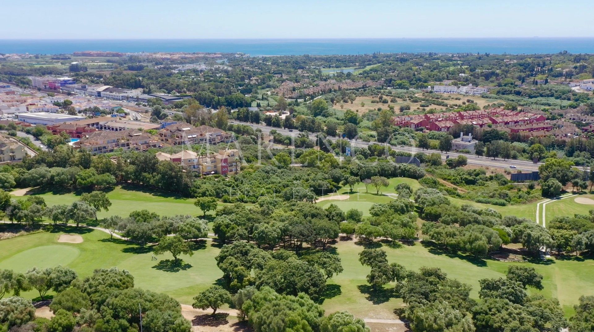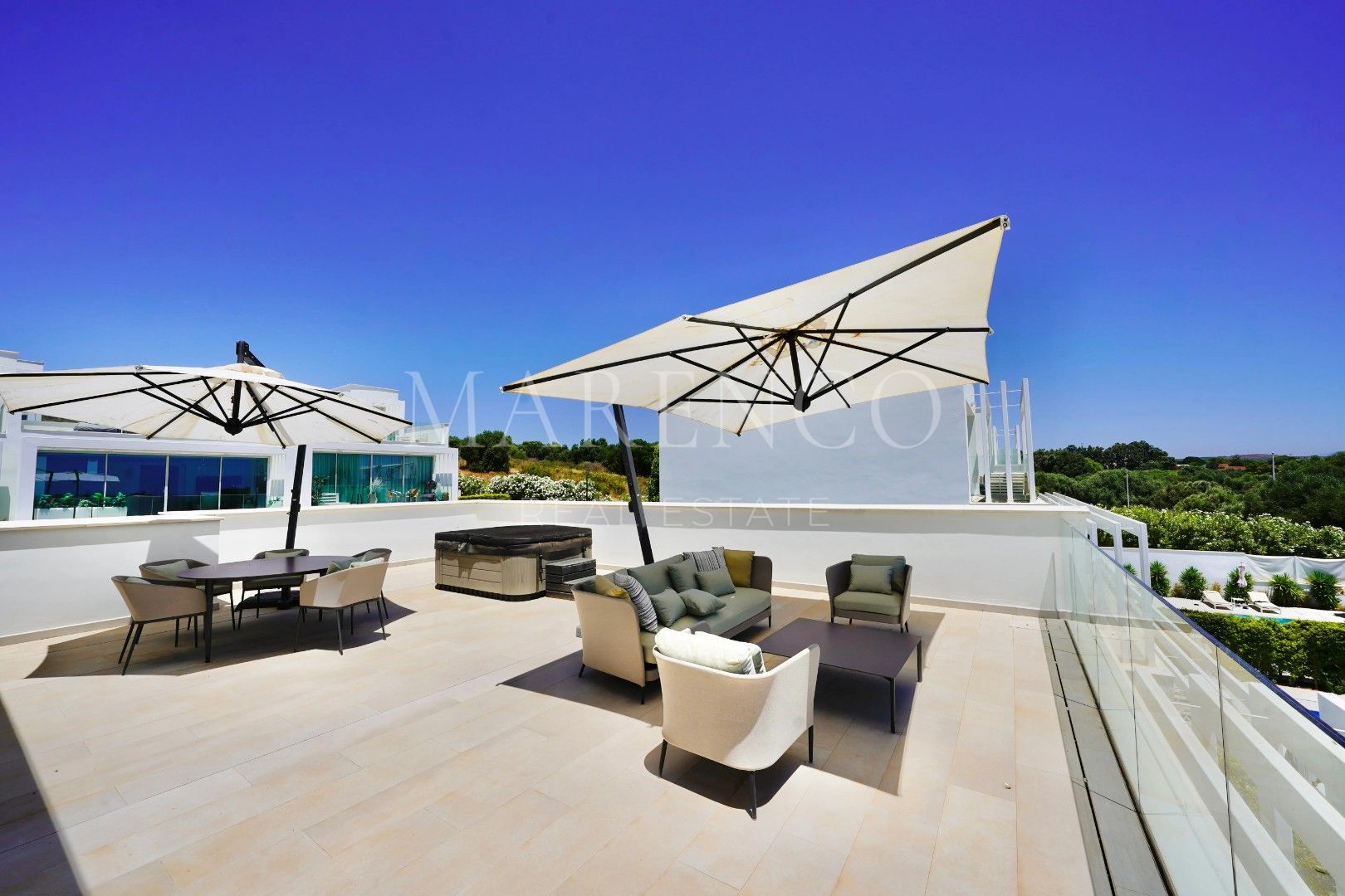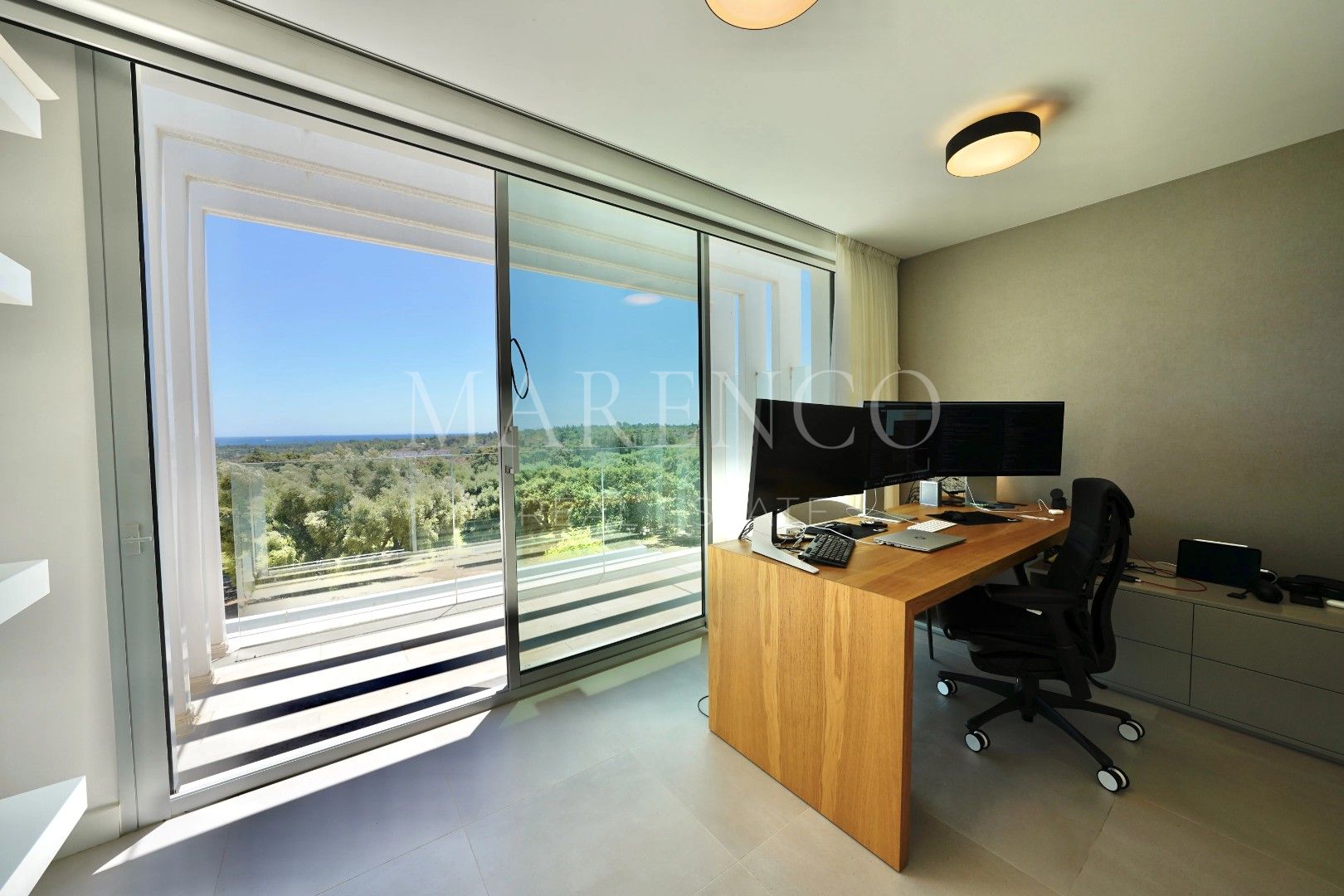 The top floor features a bright and spacious bedroom currently used as an office, a separate bathroom, and access to a large rooftop terrace—an exceptional space for al fresco dining, lounging, or adding a private spa, all while enjoying breathtaking views of the golf course and the sea.
