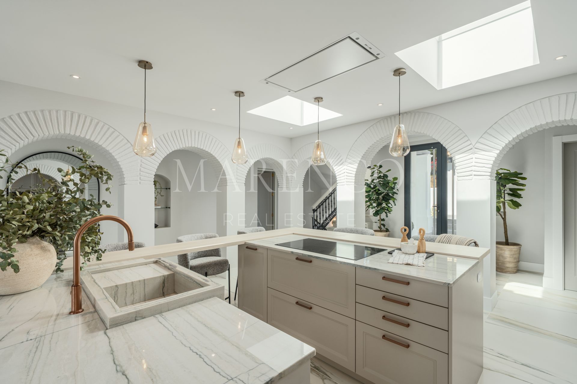 El interior de Villa Zafira es un ejemplo de diseño impecable, con una paleta de colores neutros que transmite serenidad desde el primer momento. Elementos arquitectónicos mediterráneos destacan en toda la vivienda, como los elegantes arcos que separan con gracia los espacios sin romper la fluidez del concepto abierto. El salón desprende sofisticación, con techos altos adornados con vigas de madera pintadas de blanco que evocan el legado andaluz de la villa. La cocina, tanto estilosa como funcional, está equipada con electrodomésticos de alta gama y se organiza alrededor de una isla central que funciona como espacio de cocina y comedor íntimo a la vez.