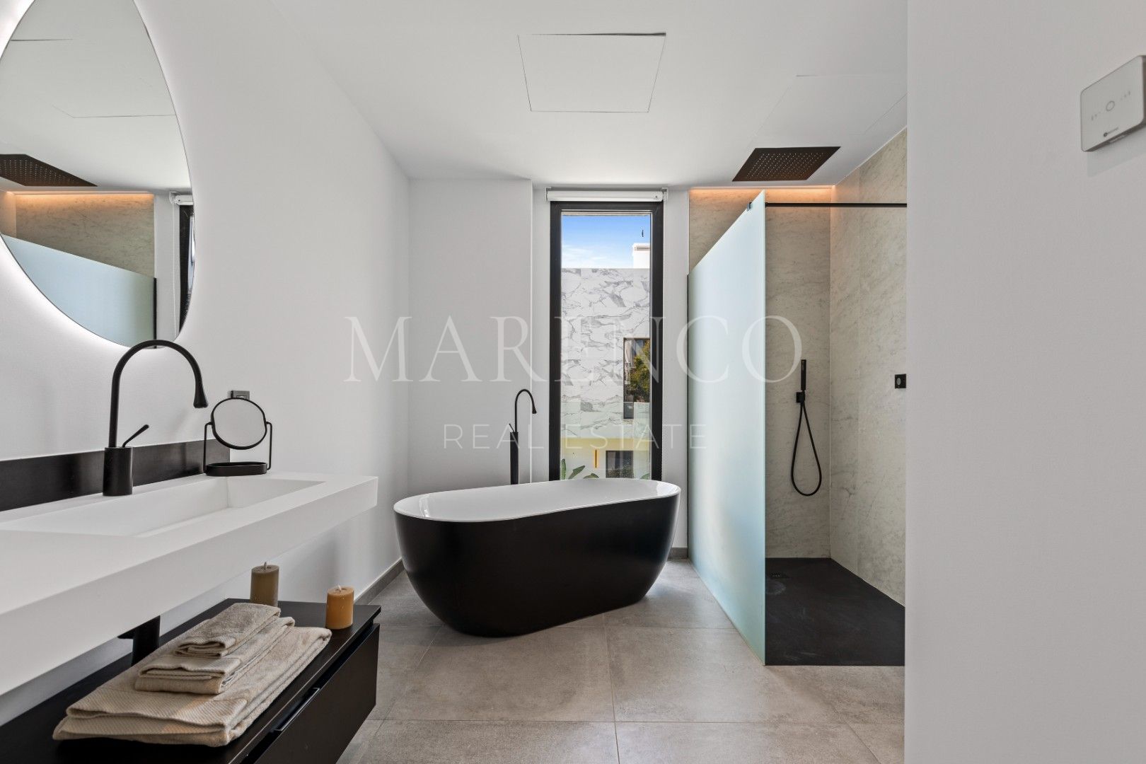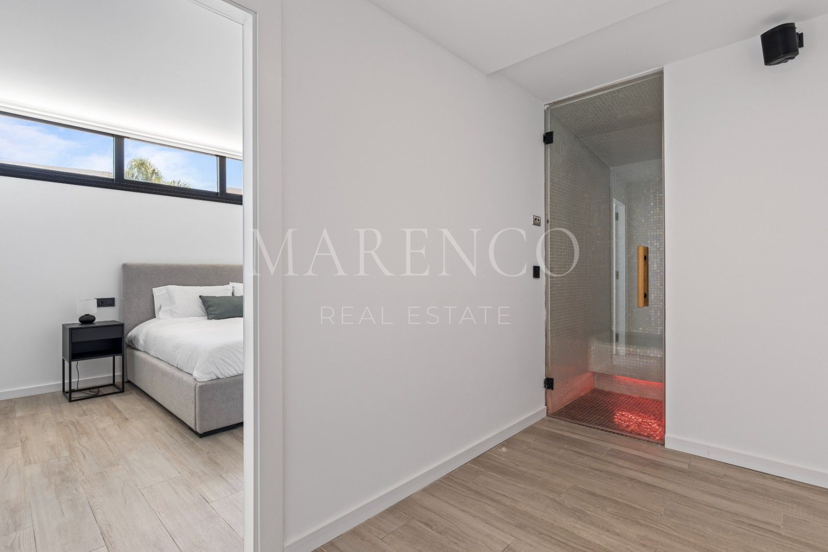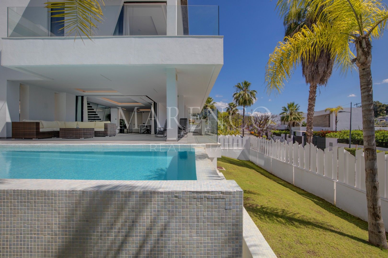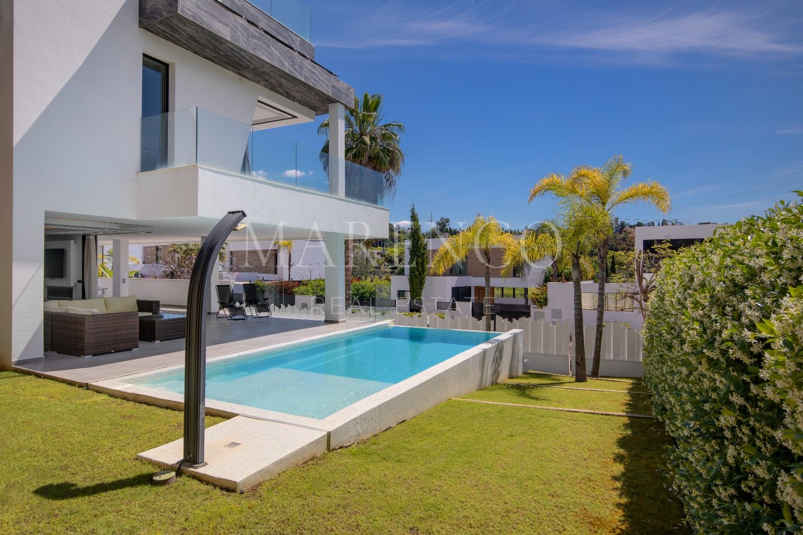 Esta excepcional villa de nueva construcción, finalizada en 2022, se encuentra en la codiciada zona de El Campanario, en Estepona, a poca distancia a pie del prestigioso El Campanario Golf & Country Club. Ofrece un entorno tranquilo a solo minutos de la playa, San Pedro de Alcántara y Puerto Banús, logrando el equilibrio perfecto entre una vida serena y un acceso cómodo a todos los servicios locales. Diseñada con elegancia moderna y minimalismo, la villa se distribuye en cuatro niveles —sótano (112 m²), planta baja (150 m²), primera planta (143 m²) y un amplio solárium en la azotea (132 m²)—, lo que la convierte en una vivienda de generosas dimensiones que ofrece una excelente relación calidad-precio en una ubicación privilegiada.