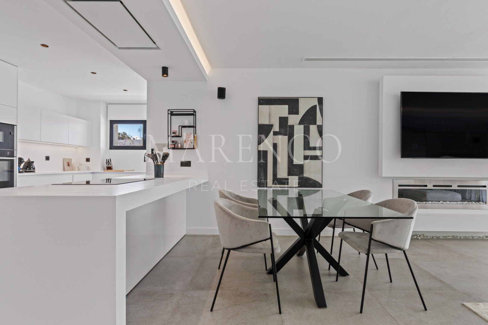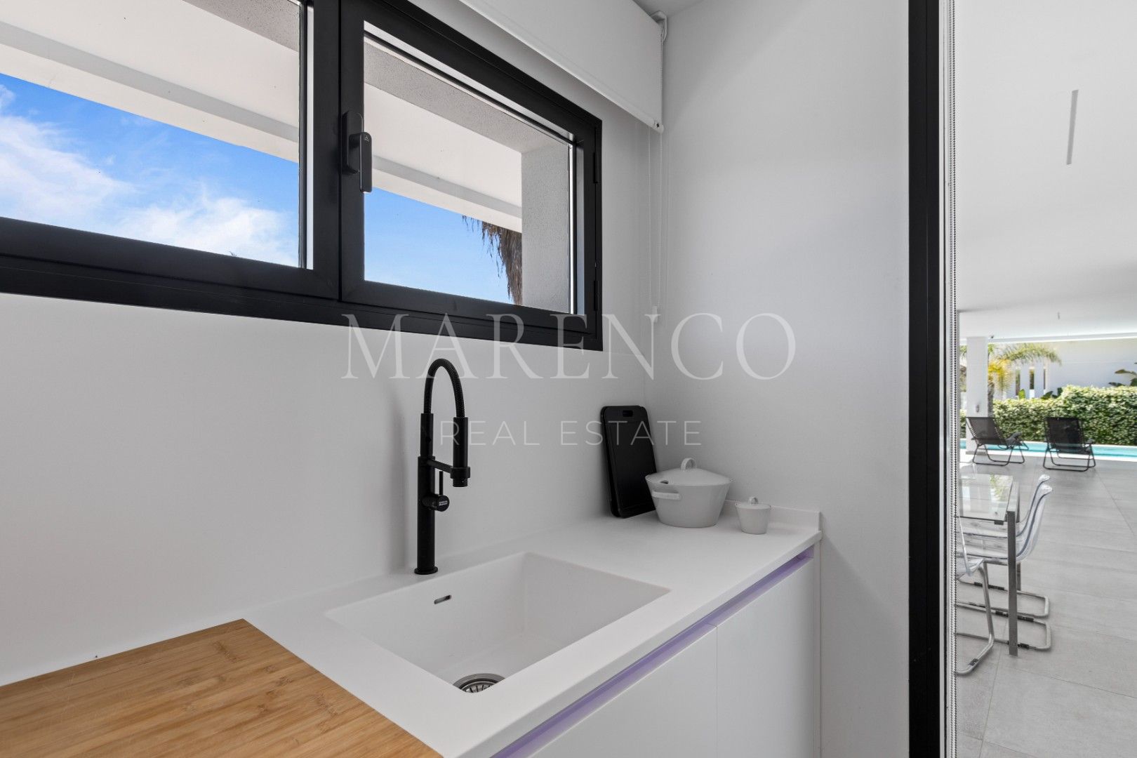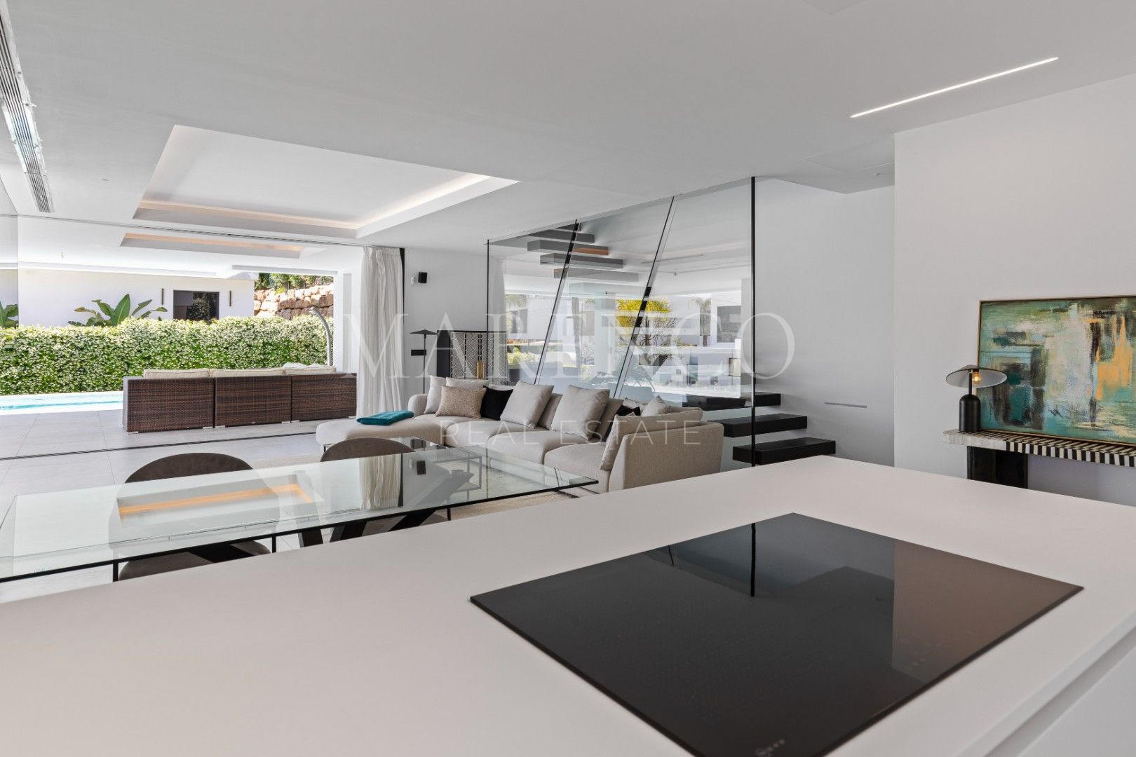 Al entrar por una gran puerta pivotante de madera, se accede a unos interiores luminosos y de planta abierta, enmarcados por puertas correderas de cristal de suelo a techo que se ocultan en las paredes, creando una transición fluida entre interior y exterior. La planta baja incluye un espacioso salón, una cocina de última generación y un aseo de invitados, mientras que en el exterior un hermoso jardín paisajístico con piscina infinita y sistema de riego automático ofrece el escenario perfecto para relajarse.