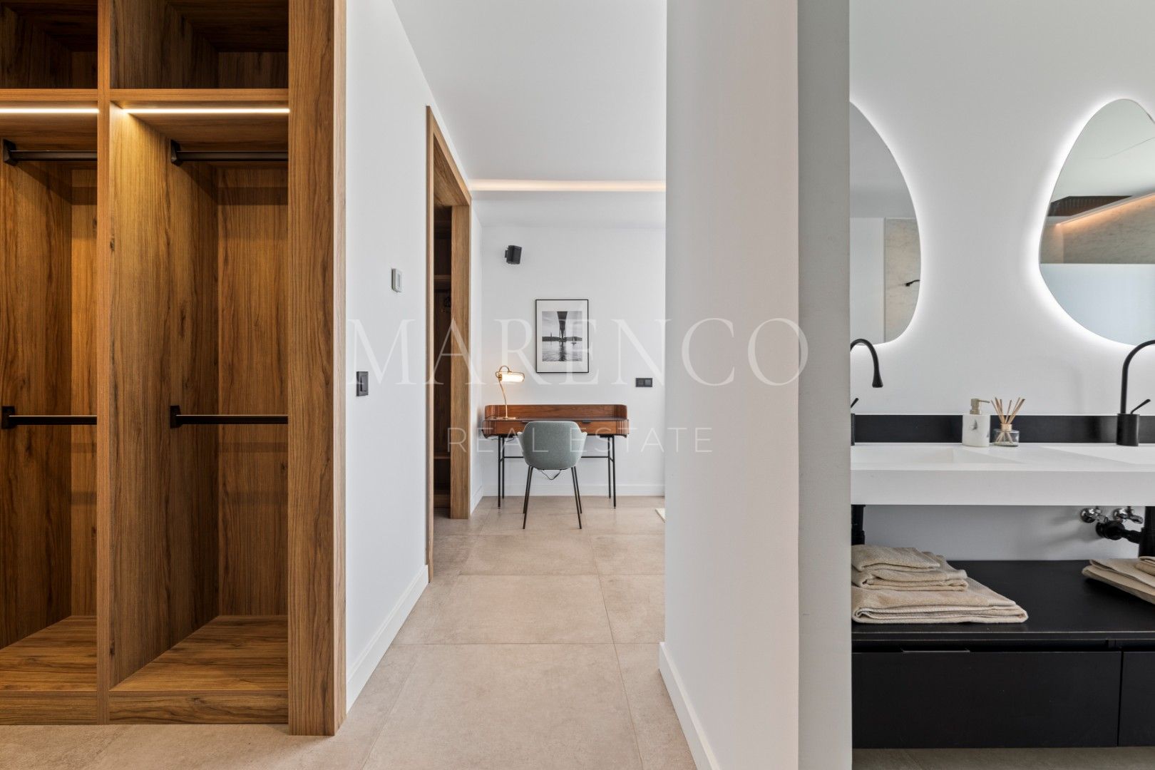 La primera planta alberga tres dormitorios en suite, incluido un amplio dormitorio principal con dos vestidores. Todas las habitaciones cuentan con acceso a terrazas a través de puertas correderas de cristal de alta gama que se ocultan en las paredes para lograr la máxima amplitud. La planta dispone de calefacción por suelo radiante en toda su superficie para un confort durante todo el año.