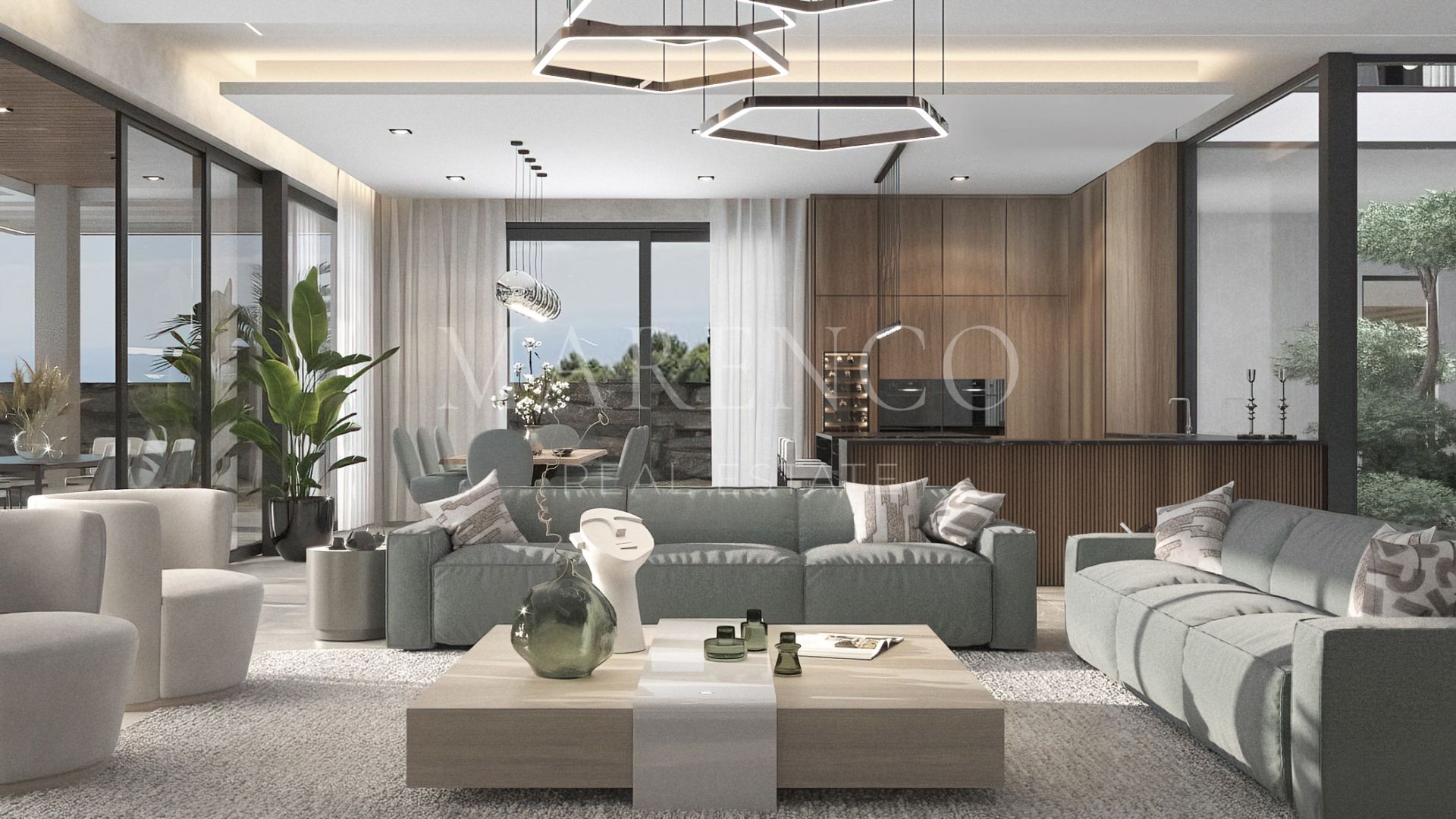 El exterior invita a disfrutar del clima mediterráneo durante todo el año. Una espectacular piscina infinita revestida en piedra indonesia domina el paisaje con vistas panorámicas al mar, acompañada de amplias terrazas, zona chill-out y comedor exterior ideal para momentos de relax y entretenimiento. La vivienda incluye además un garaje privado para cuatro vehículos y tecnología de última generación: sistema domótico avanzado, televisor OLED con sonido integrado y sistema de audio BOSE con inteligencia artificial.