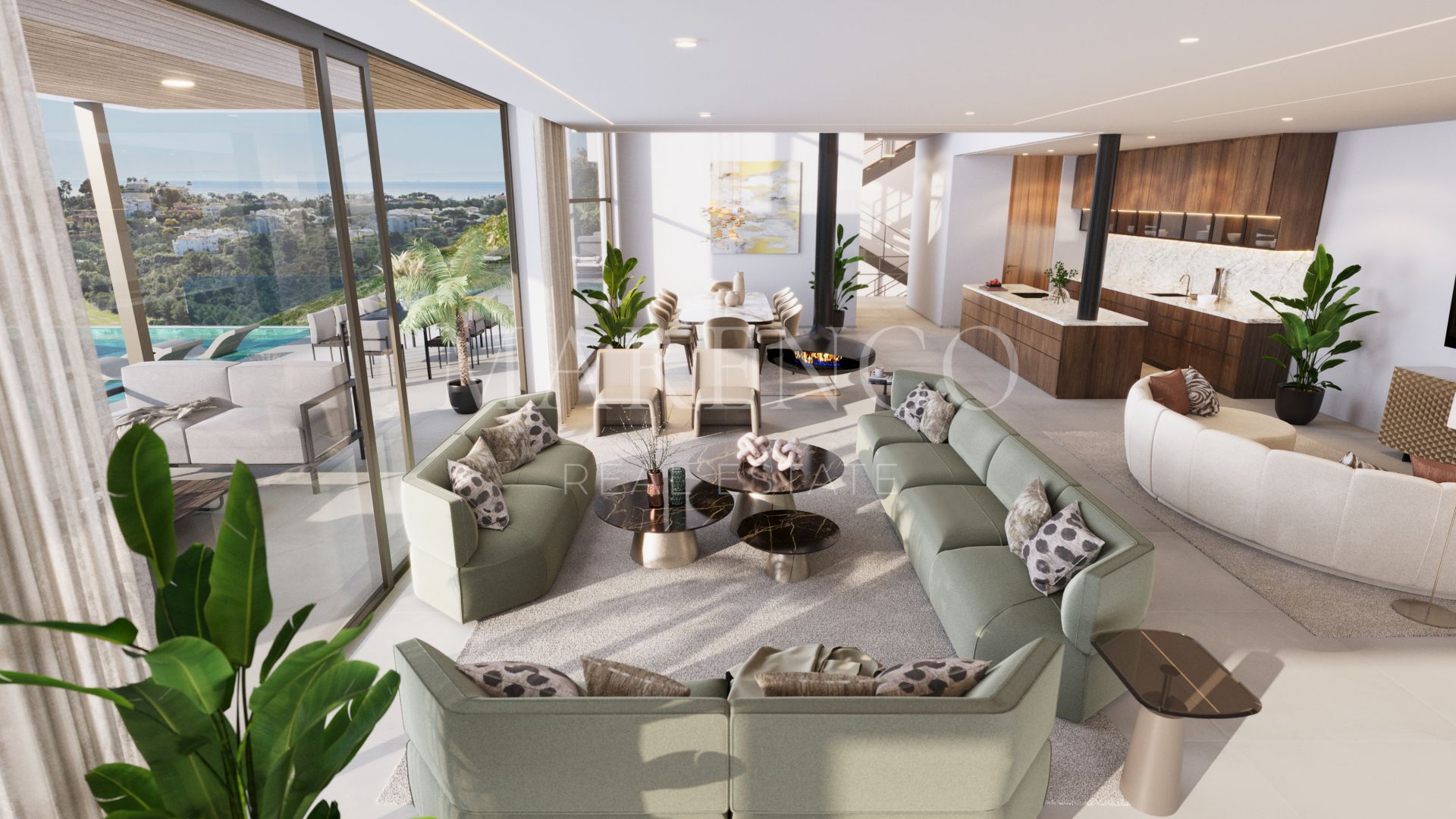 Con una superficie construida de 1.259 m² sobre una parcela de 3.757 m², la villa se distribuye en tres niveles e incluye seis dormitorios, siete baños y tres aseos, además de cuatro cocinas — principal, de servicio, para el personal y exterior. Cada dormitorio cuenta con baño en suite y terraza privada con vistas al mar y al golf. La planta baja está dedicada al ocio y al bienestar, con una zona SPA, piscina interior climatizada, sauna finlandesa, baño turco, gimnasio panorámico, bodega climatizada, cine privado y sala de juegos con bar y billar.