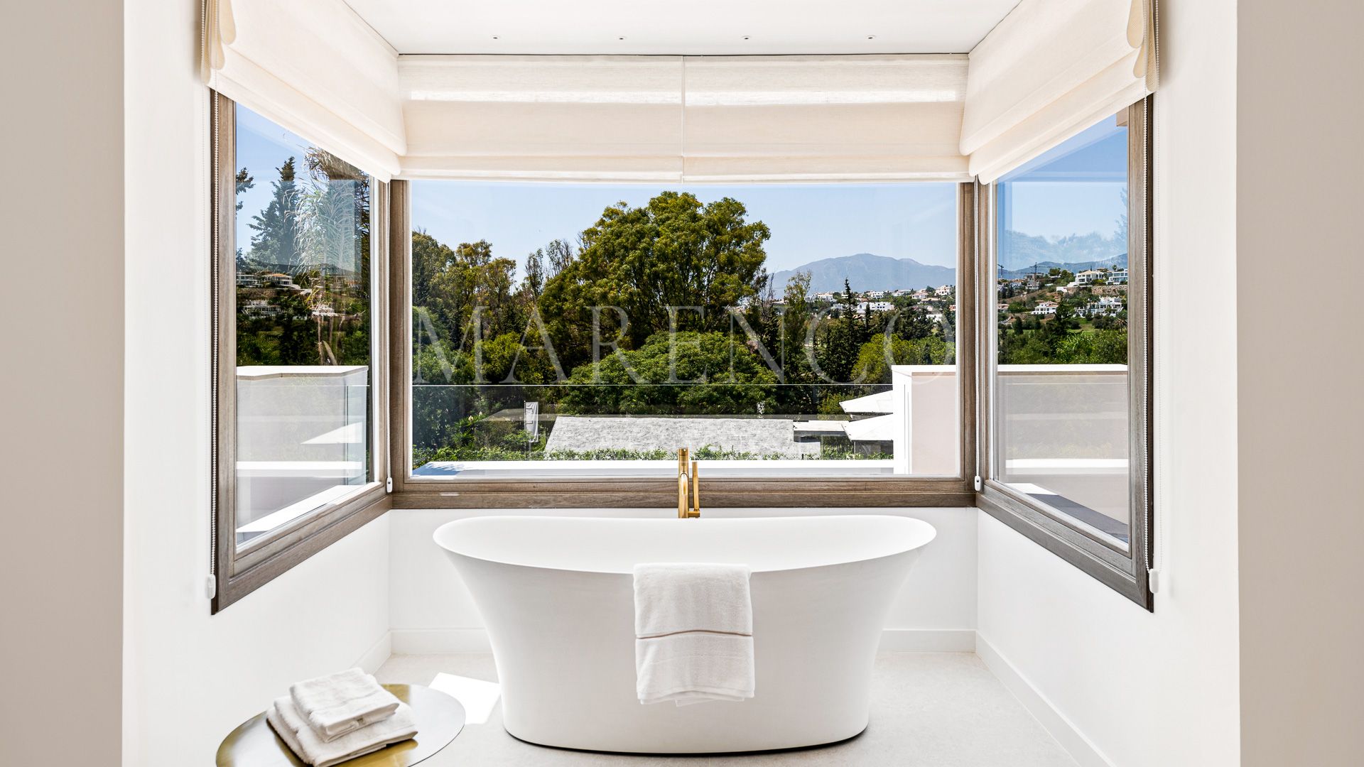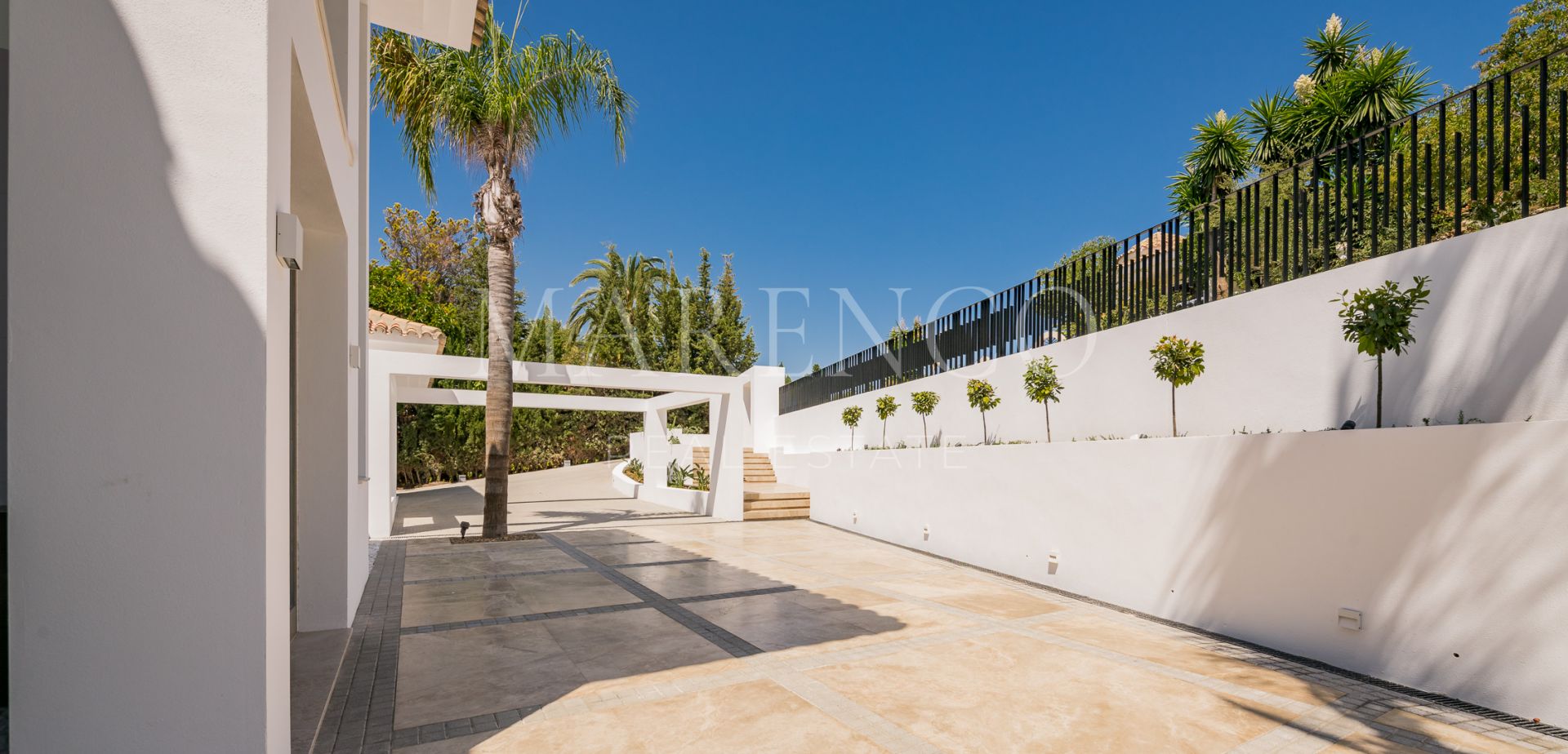 La elevación de la parcela ofrece mucha privacidad y preciosas vistas. Las zonas exteriores ofrecen una gran piscina con áreas de hamacas.