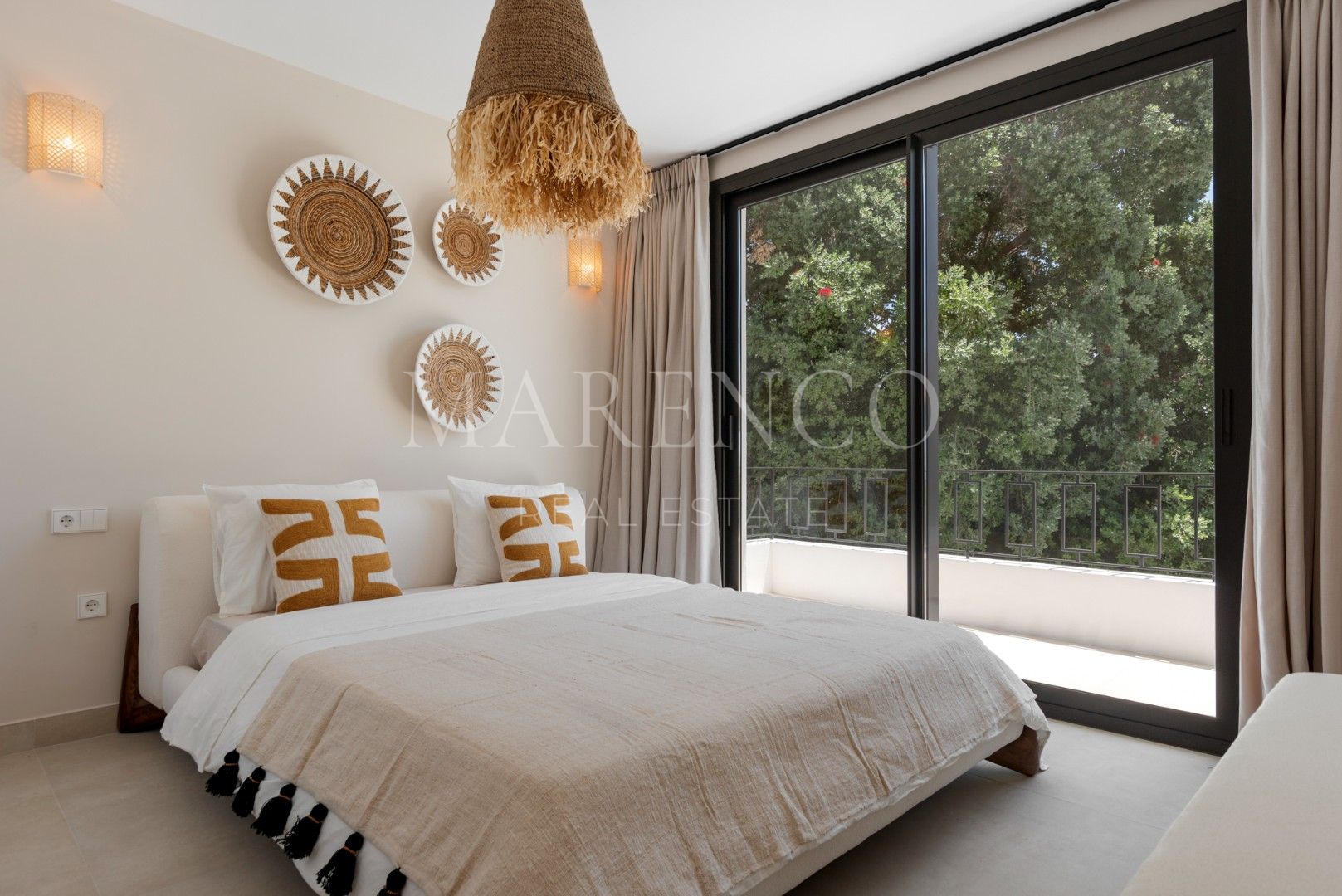 La villa ha sido renovada bajo una arquitectura exquisita y cuenta con seis dormitorios dobles y seis baños. Incluye un apartamento separado en suite para huéspedes o personal. La cocina de planta abierta está totalmente equipada con electrodomésticos Siemens y está ubicada en el centro de la sala de estar y comedor con chimenea transparente. La casa está diseñada para maximizar las vistas al jardín, el campo de golf y el mar Mediterráneo, y cuenta con calefacción por suelo radiante en las áreas de estar y baños, aire acondicionado en toda la casa, ventanas de doble acristalamiento y baños de diseño.