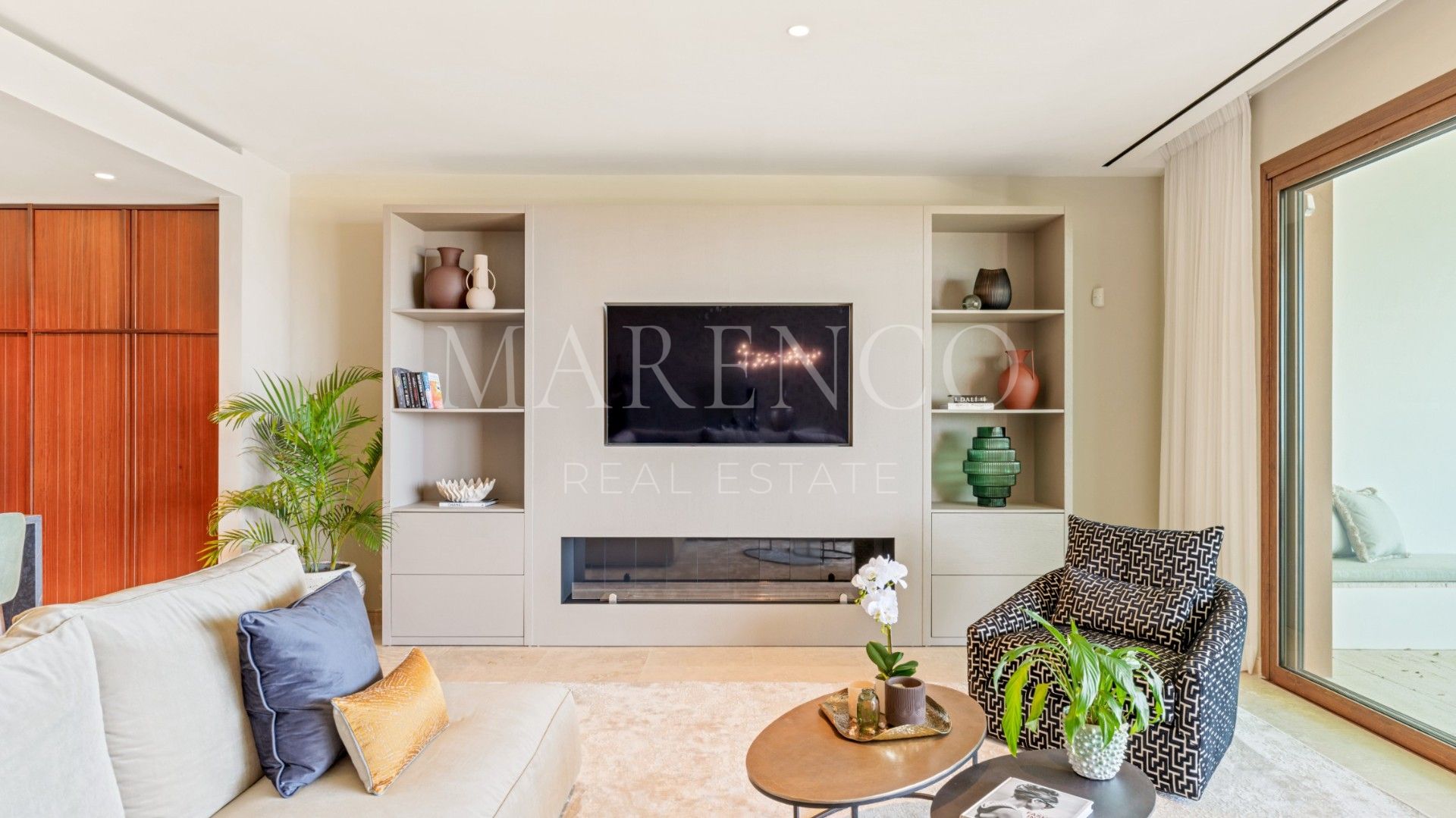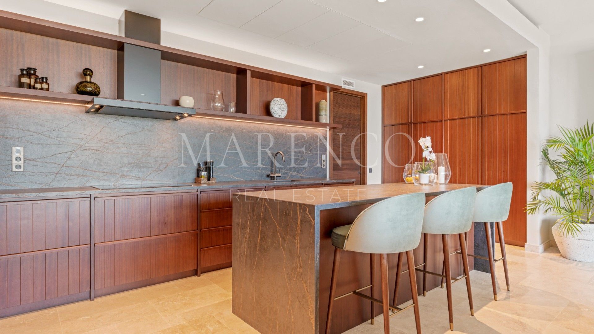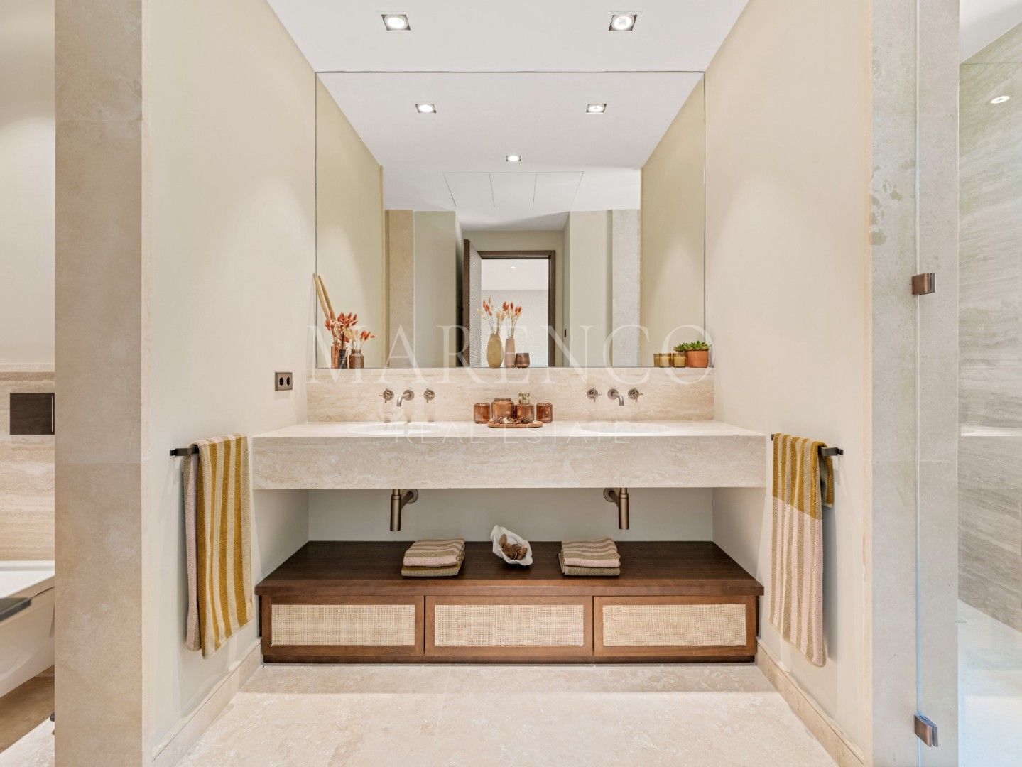 El interior del piso se distingue por su elegancia y atención al detalle. Cuenta con tres dormitorios, cada uno con su propio baño en suite, proporcionando privacidad y confort. Además, hay un aseo de invitados adicional. El amplio salón-comedor es perfecto para entretener a los invitados y disfrutar de momentos en familia. La cocina, equipada con materiales de lujo y electrodomésticos de alta gama, es ideal para los amantes de la cocina que buscan un espacio funcional y sofisticado.