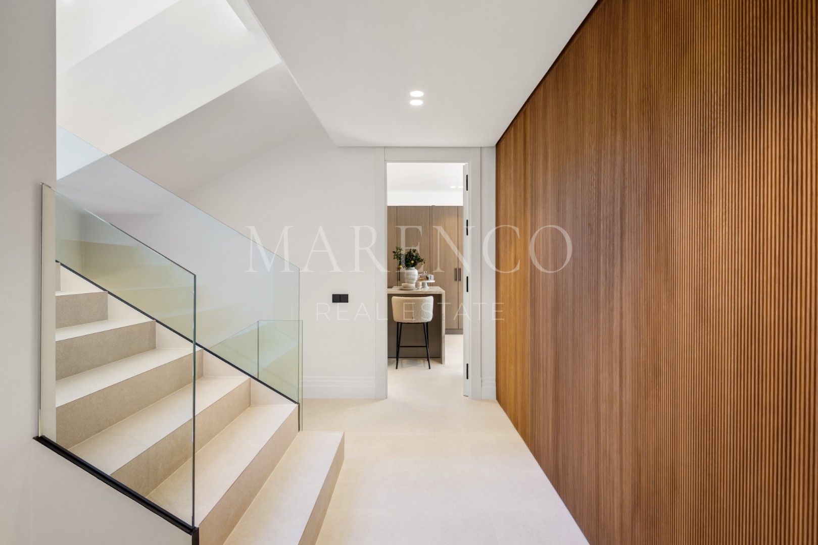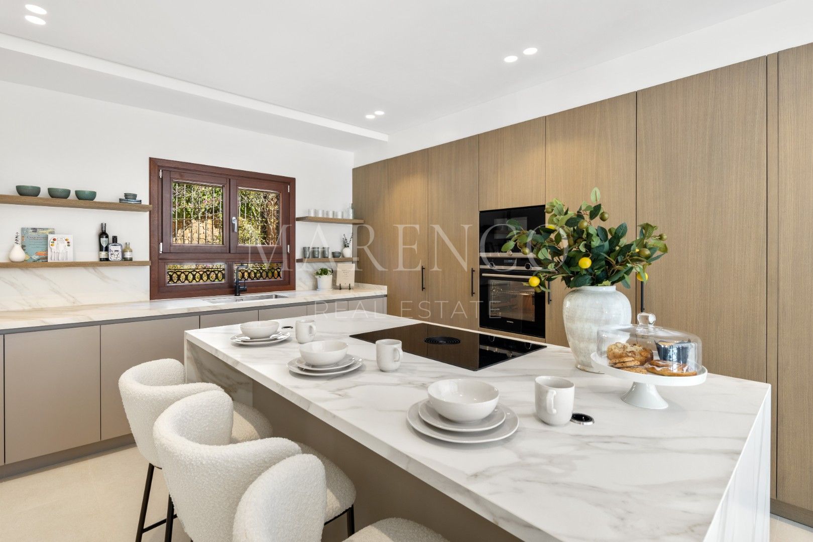 En el interior de La Capellanía 1, se ha llevado a cabo una renovación completa con mobiliario y accesorios contemporáneos. Los interiores desprenden sofisticación y comodidad modernas, con una elegante paleta de colores y toques de mármol y madera repartidos por todo el espacio. La zona de estar cuenta con un diseño de planta abierta que conecta el comedor íntimo con las áreas formales e informales de estar. El acceso directo a la terraza desde esta área permite una transición fluida entre el interior y el exterior. La cocina está conectada al comedor pero permanece separada gracias a las elegantes puertas de cristal. La cocina es ultramoderna, con una maravillosa isla de cocina de mármol y elegantes armarios de madera. Abundante espacio de almacenamiento y encimera añaden un nivel de funcionalidad a la cocina, que también está totalmente equipada con electrodomésticos de última generación.