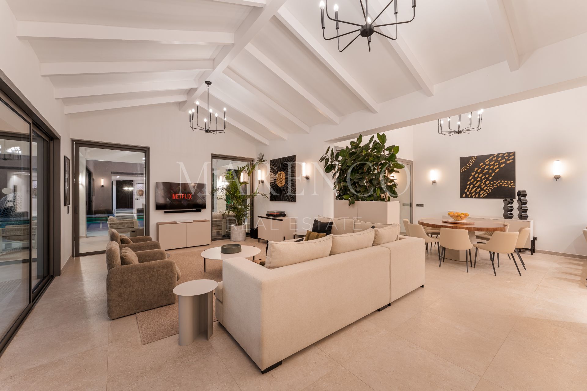Villa Camelia es una villa contemporánea de cinco dormitorios situada en la codiciada zona de La Cerquilla, Nueva Andalucía, donde la comodidad, el diseño y el lujo se fusionan para ofrecer una experiencia única. Renovada en 2025, esta propiedad refleja la esencia de la vida moderna con un diseño elegante y funcional. Imagine vivir en un entorno exclusivo, rodeado de los más prestigiosos campos de golf de la Costa del Sol, con vistas impresionantes al valle y puestas de sol que lo dejarán sin aliento.