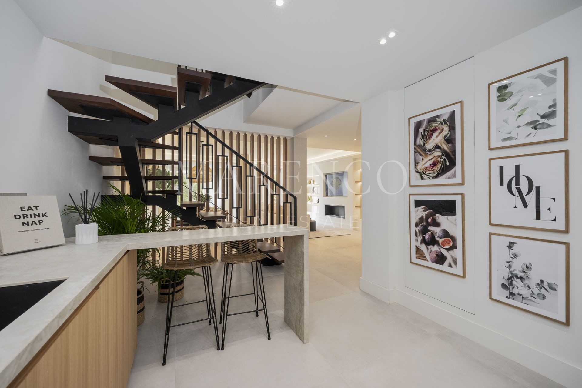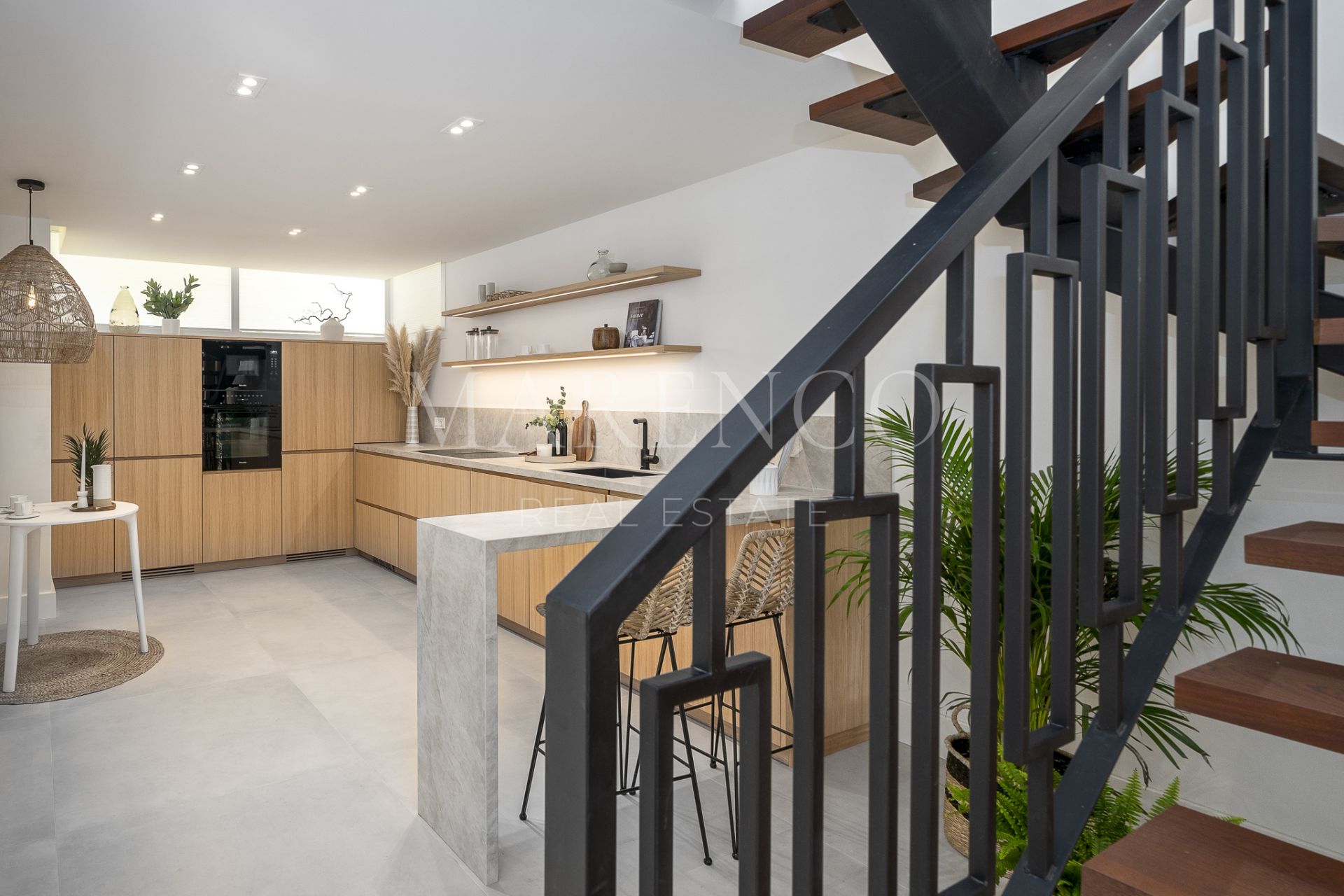 Consta de 3 niveles, el primer nivel es abierto, con un aseo, salón comedor y cocina desde donde se puede acceder a la zona exterior con jardín. Subiendo por las modernas escaleras de madera, se llega a la planta superior. Esta planta cuenta con el dormitorio principal con baño en suite y vestidor, además una terraza privada. Dos dormitorios más y un baño completan este nivel.