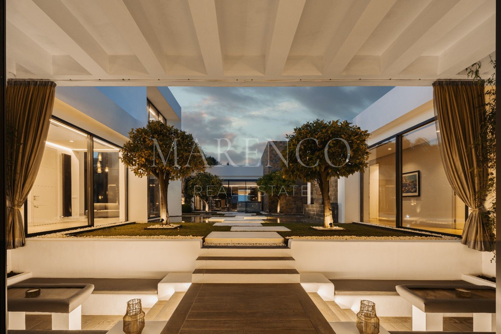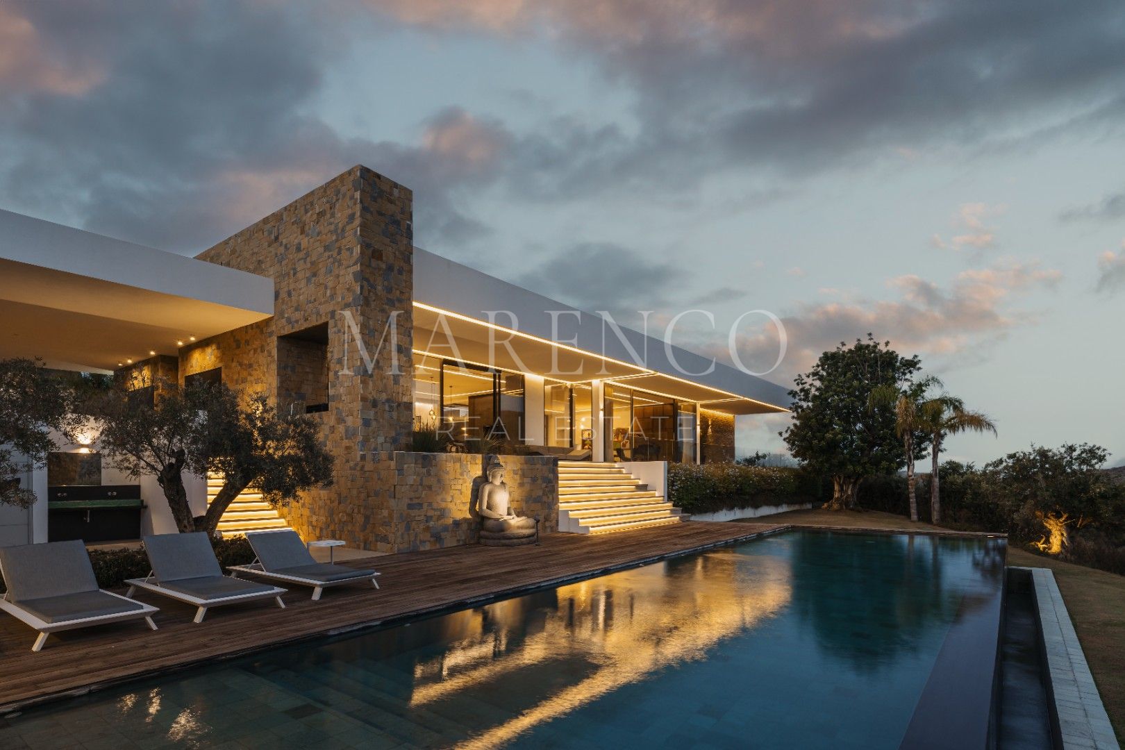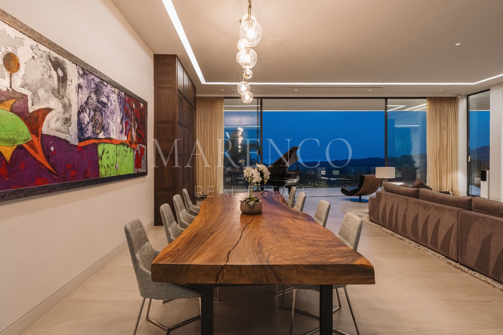 Se encuentra en una parcela de casi 6,000m² , distribuida en una sola planta, esta amplia villa de 1.021m2 .Al llegar a través del camino de entrada privado, te recibirán las vistas enmarcadas por el generoso garaje y la silueta elegante de la propiedad. El espectacular hall de entrada de doble altura, encapsulado en vidrio para maximizar la luz, te dejará sin aliento desde el primer momento. Una de las características más destacadas es el lujoso atrio central, que alberga césped, árboles y una piscina, rodeado por las zonas de estar de una sola planta. Esta moderna mansión marbellí cuenta con seis dormitorios y nueve baños, una sala de cine, gimnasio y spa, piscinas cubiertas y al aire libre, un amplio jardín de siete plantas, una piscina interior y exterior, un garaje para siete coches y dependencias independientes para el personal.