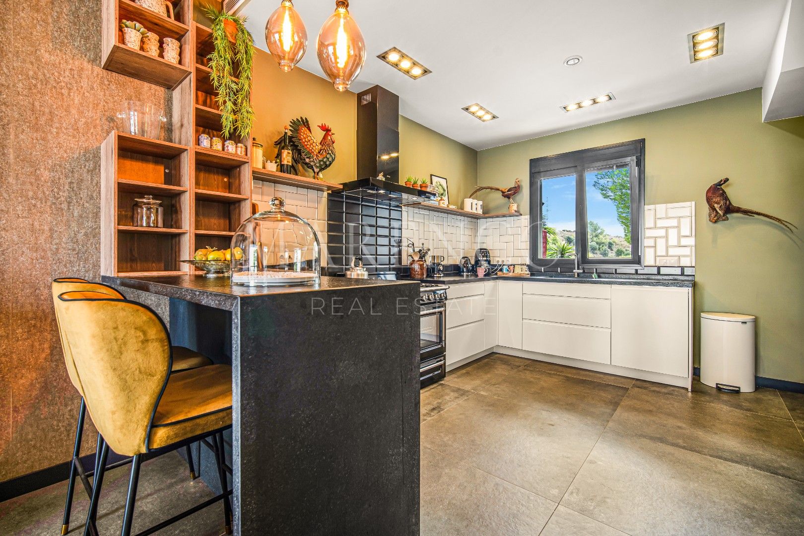 Está distribuida en tres niveles. En la planta baja, se encuentra la zona de estar, el comedor y una cocina de concepto abierto. La sala de estar, con una pared completa de ventanas que se abre a una amplia terraza con zona de barbacoa, presenta una encantadora chimenea central que irradia un ambiente acogedor en toda la estancia.