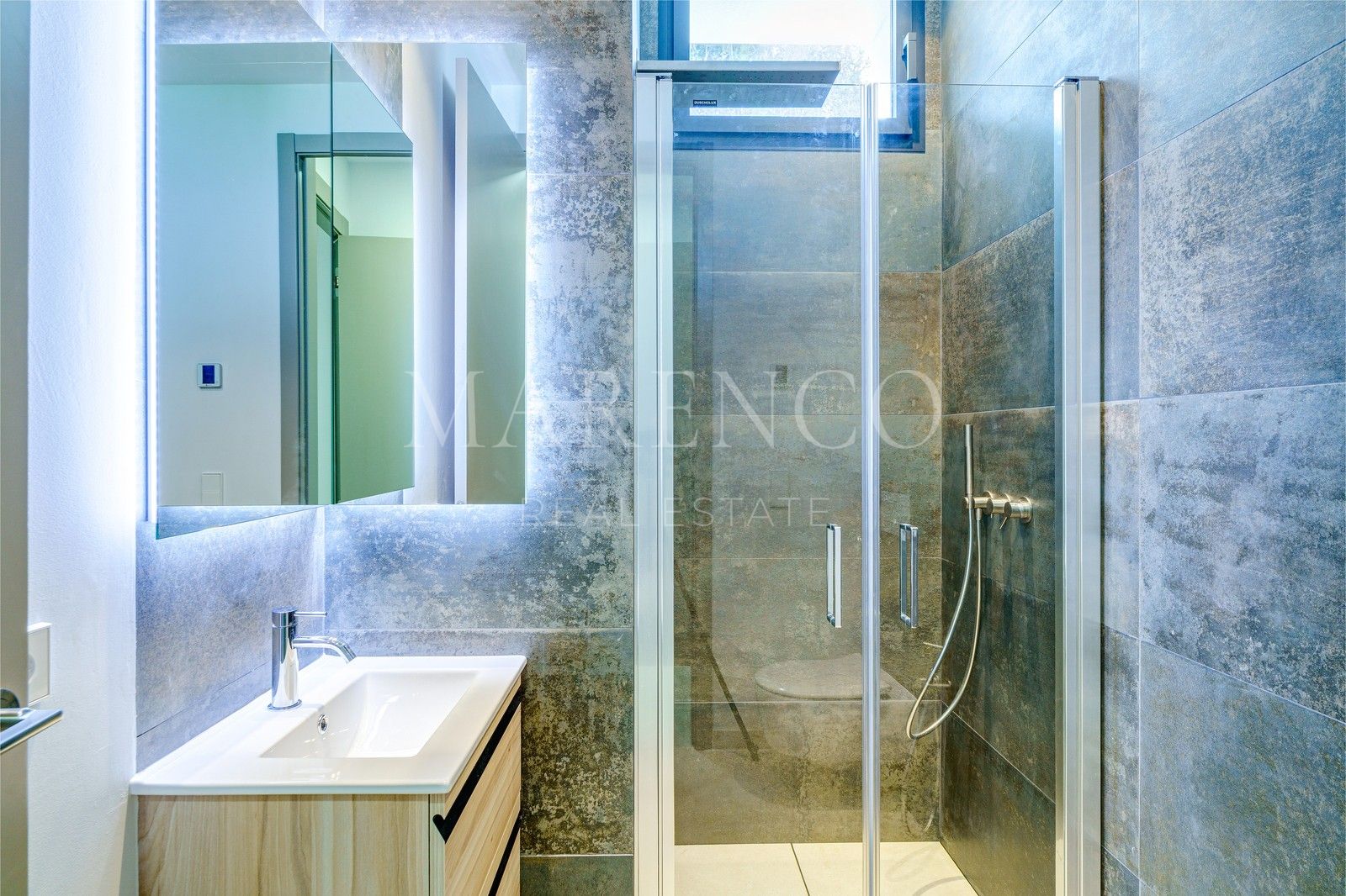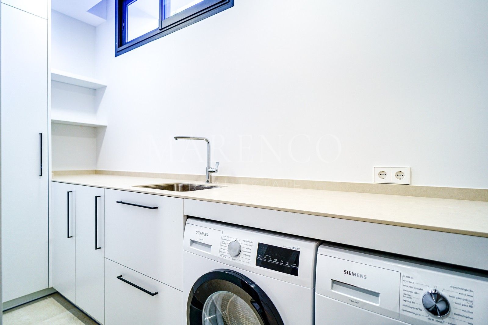 La escalera atractiva con barandilla de cristal nos lleva al primer piso, donde se encuentran dos fabulosas habitaciones con baños en suite, vestidor y acceso a las terrazas, que a su vez conducen a un solarium de 100m2 en la planta superior a través de una escalera especialmente diseñada. El sótano amplio alberga la lavandería, sala de máquinas, baño y tres espacios adicionales para gimnasio, cine, sala de juegos, además de otra habitación extra.