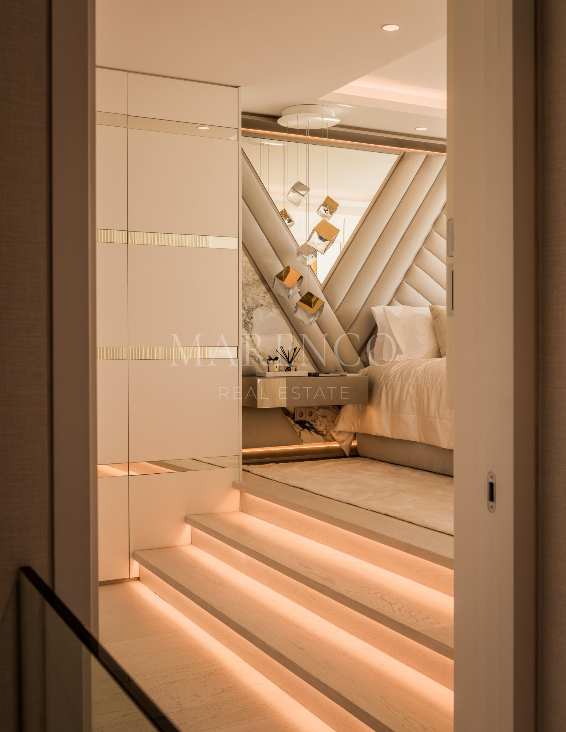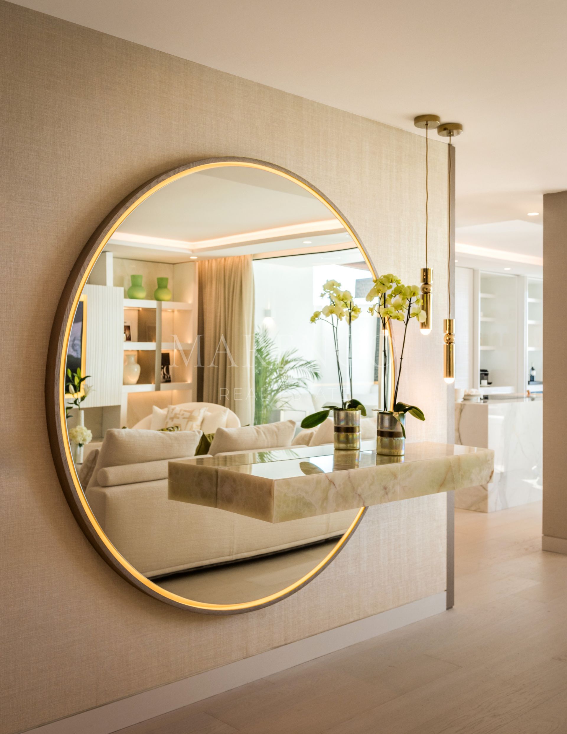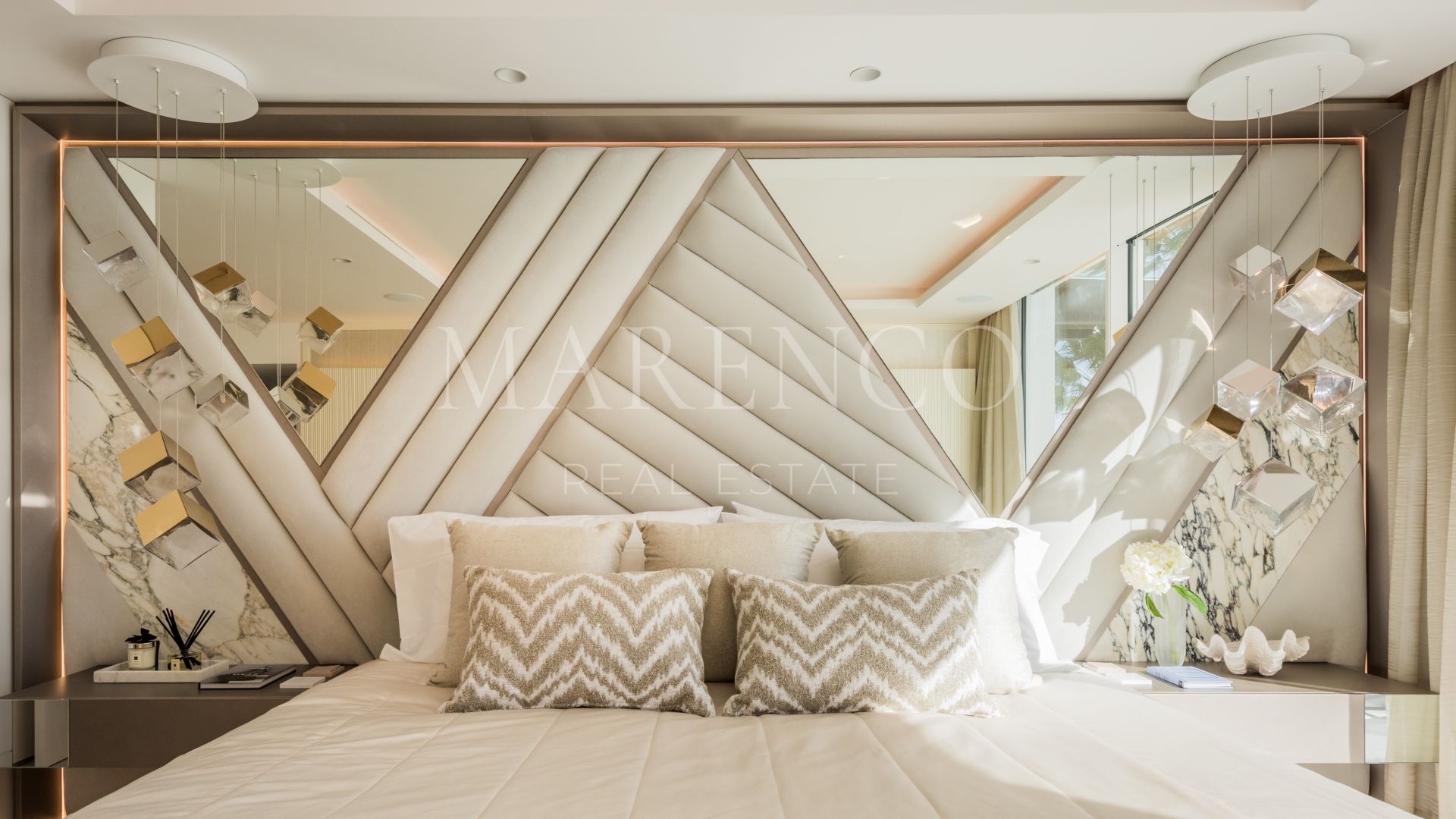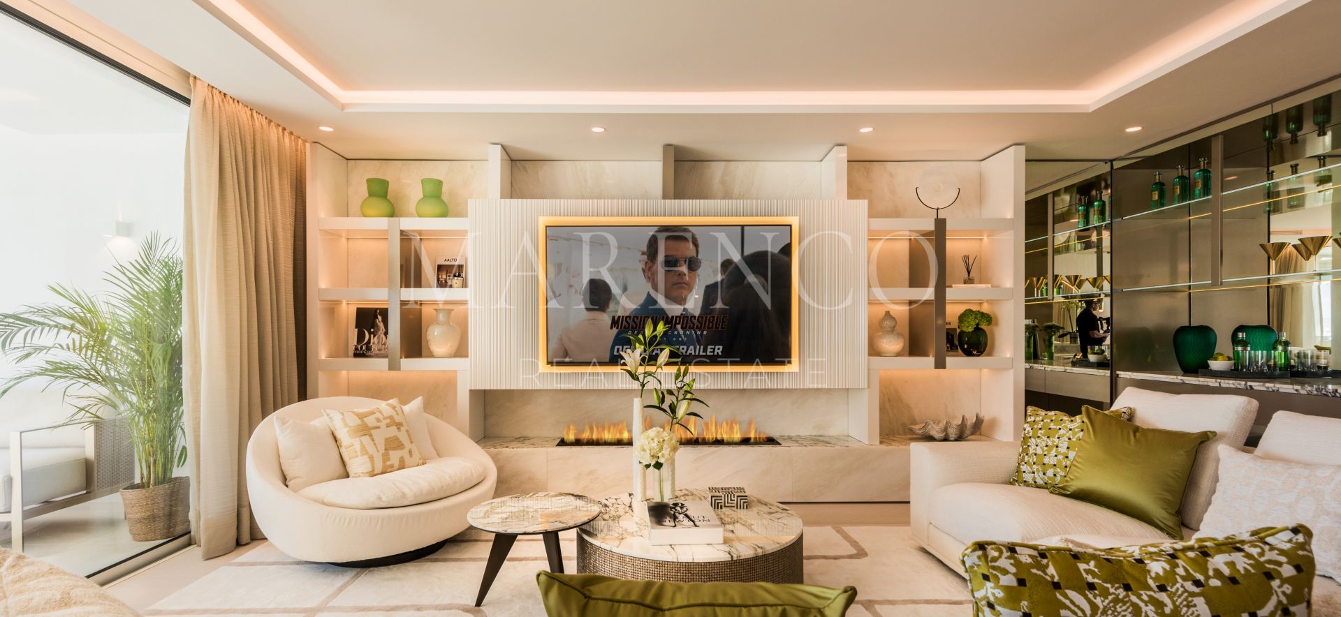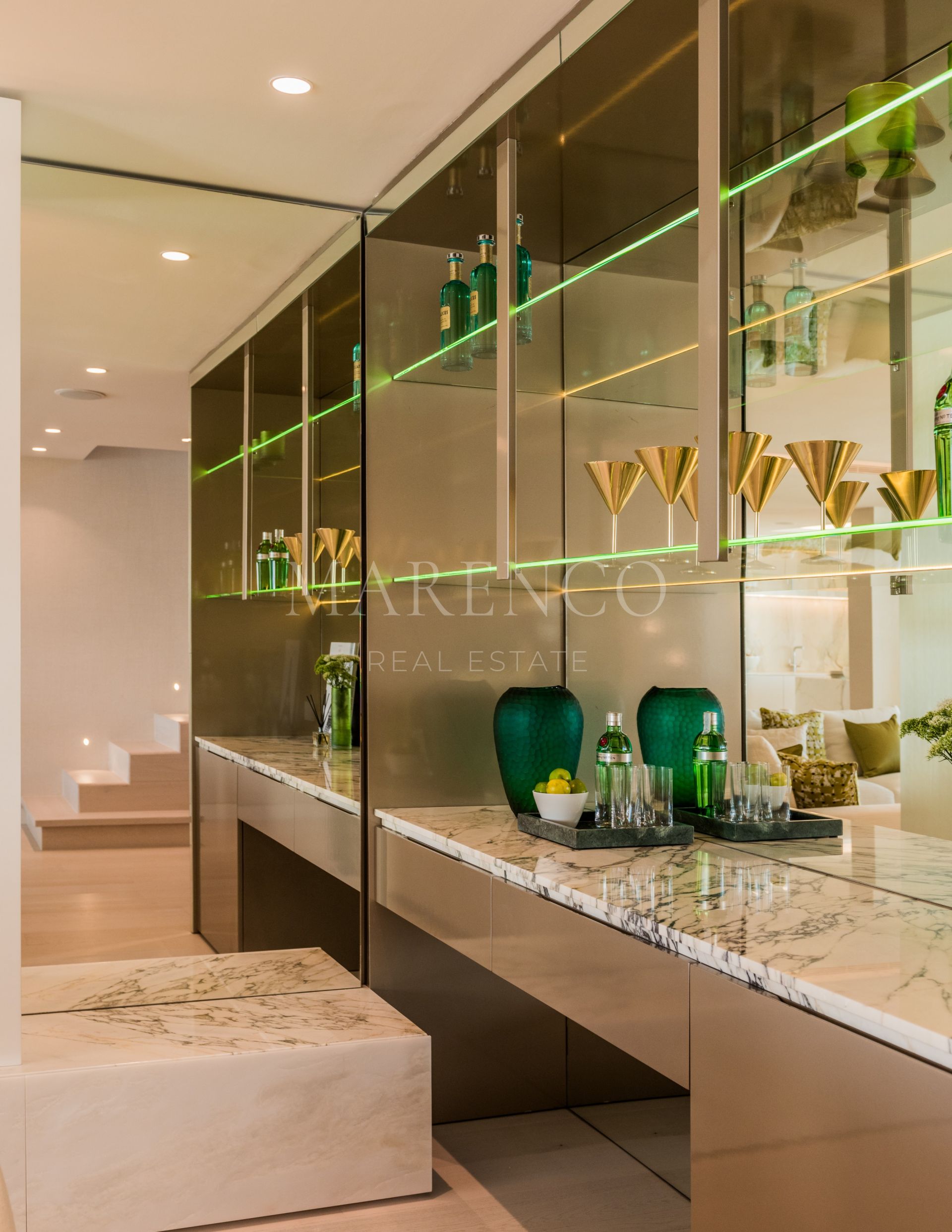 Orientada al sur, la propiedad cuenta con un acogedor hall de entrada que conduce a un impresionante salón de planta abierta con una acogedora chimenea y un elegante bar. La cocina, una creación a medida, está equipada exclusivamente con electrodomésticos Gaggenau y cuenta con una llamativa encimera de mármol que se extiende en una mesa de comedor fuera de la isla. La planta baja consta de dos dormitorios de invitados, cada uno de ellos con su propio cuarto de baño en el que se exhibe su propio mármol exclusivo, meticulosamente seleccionado por los cautivadores motivos que exhibe.