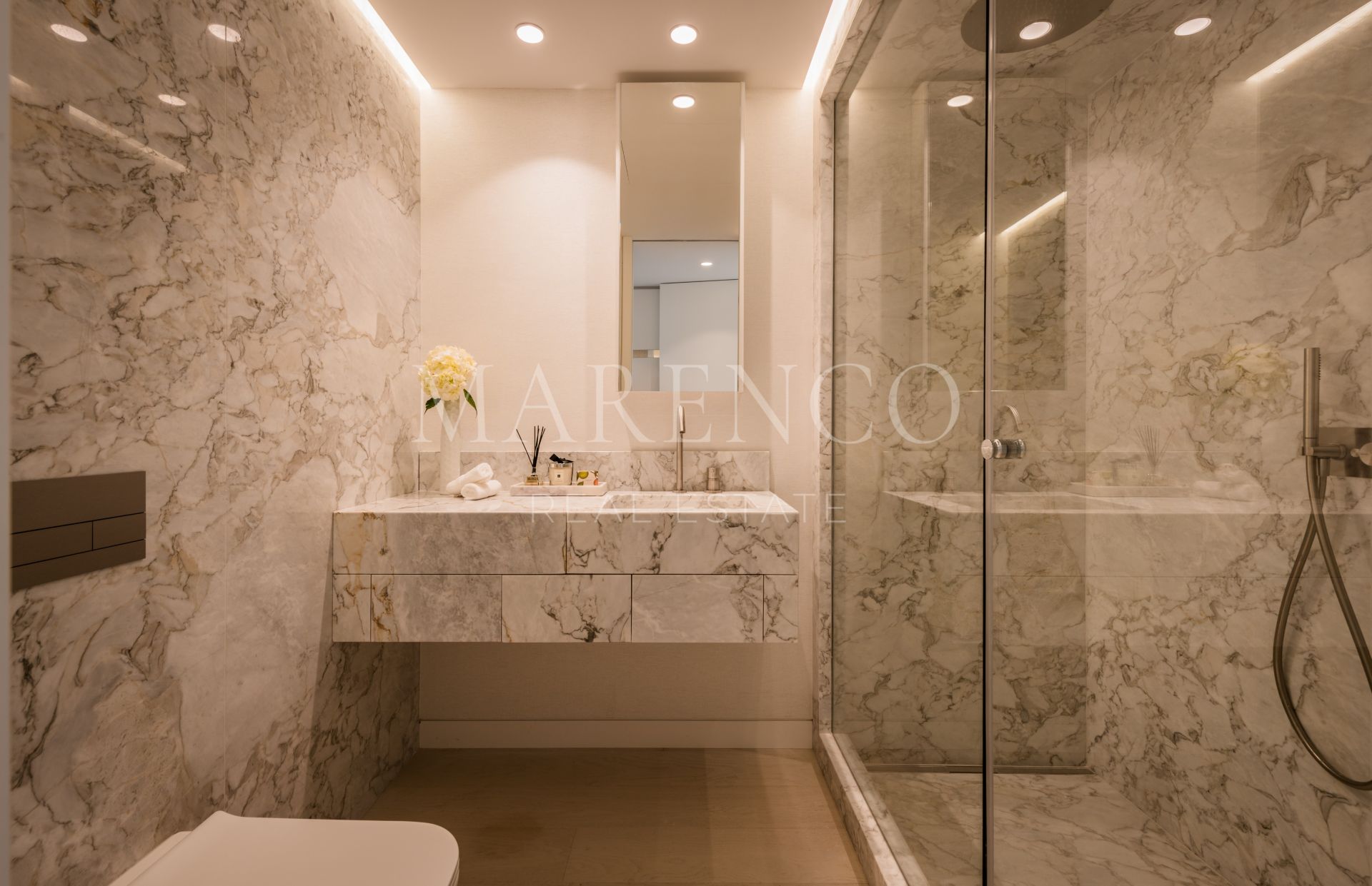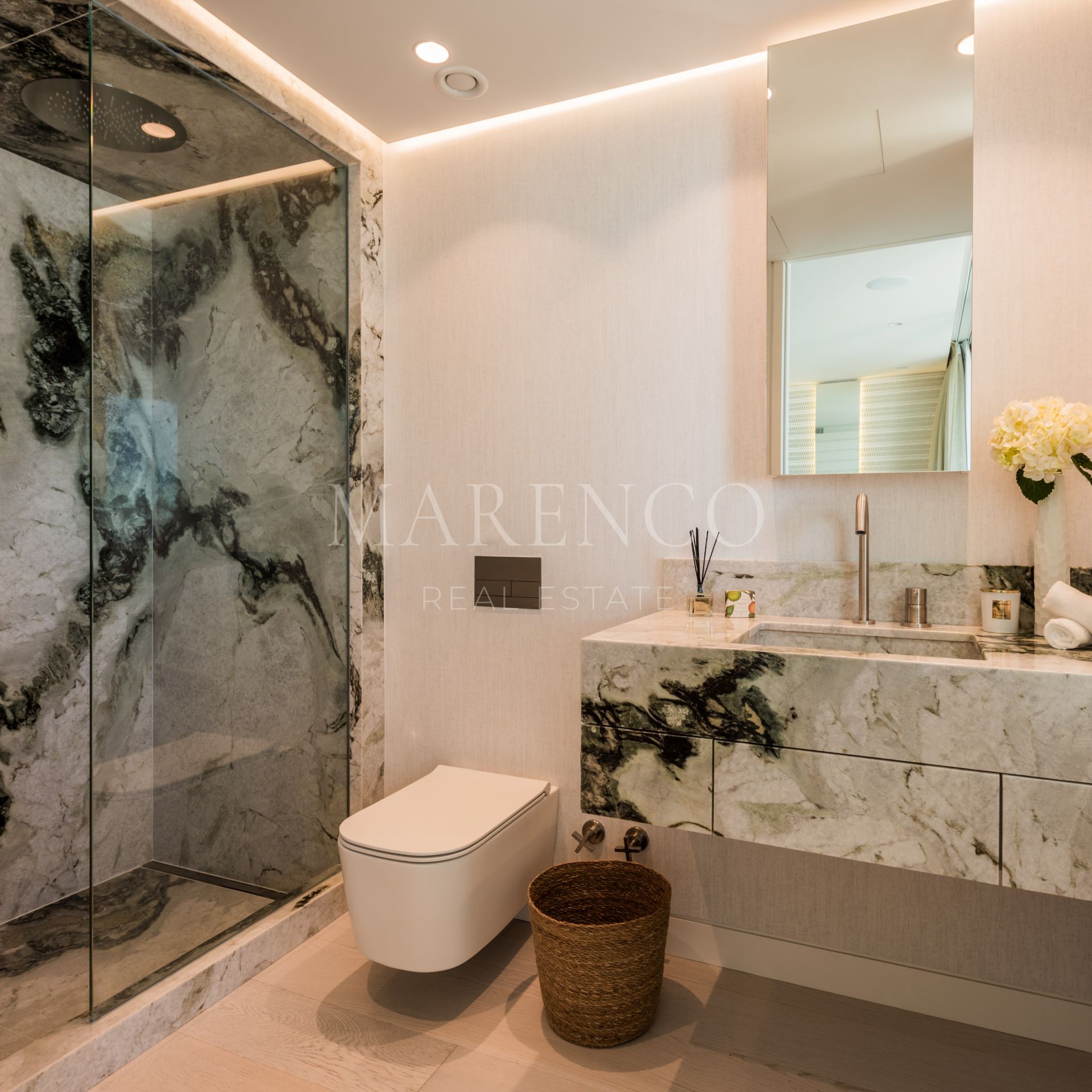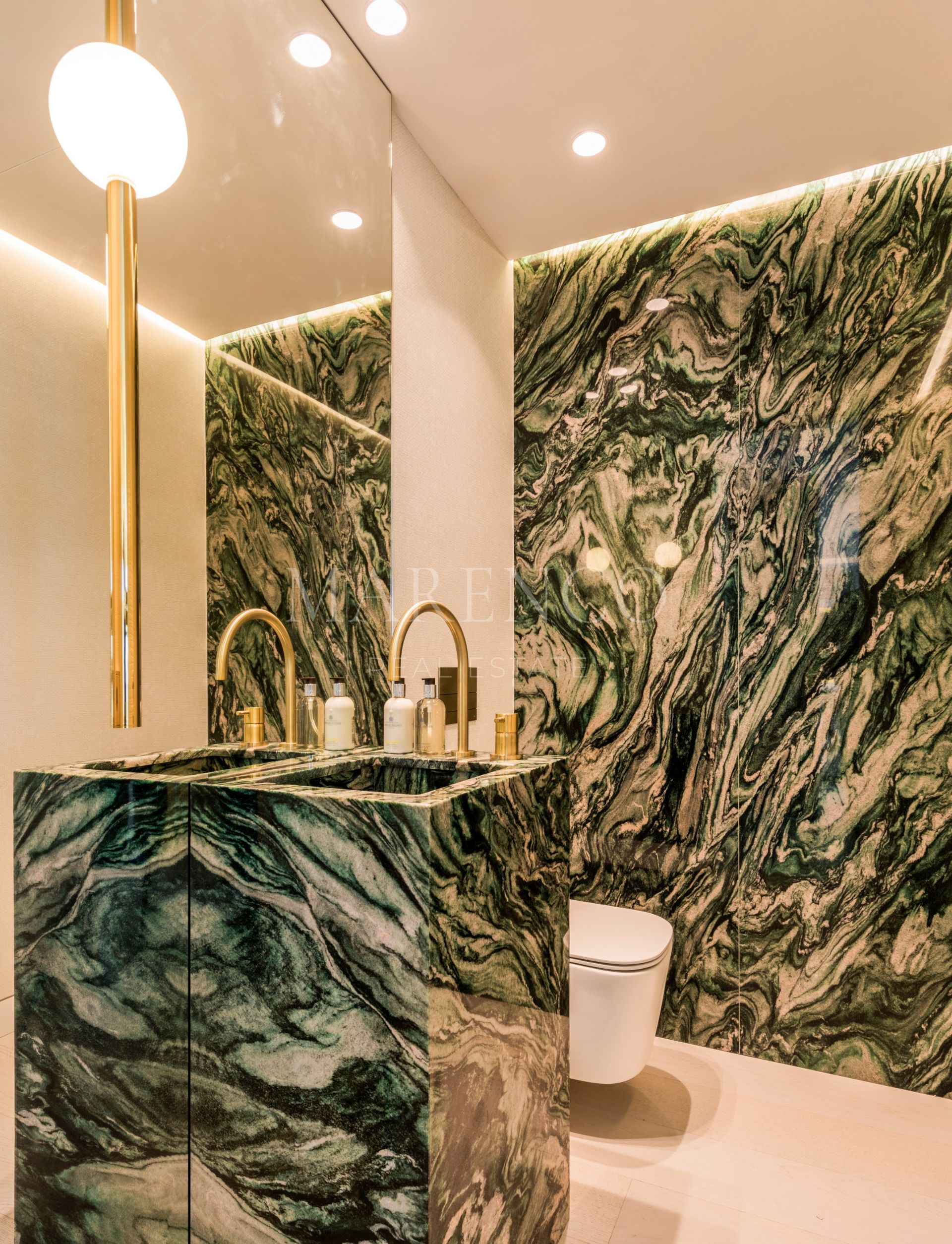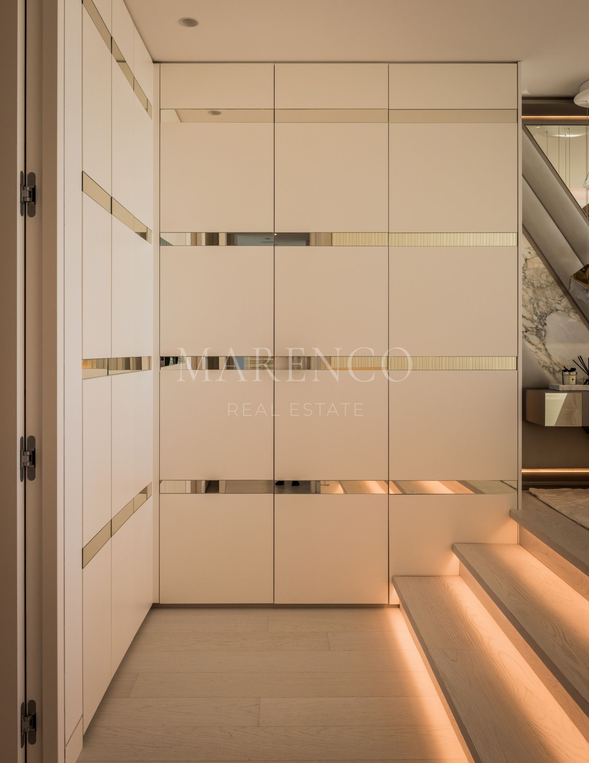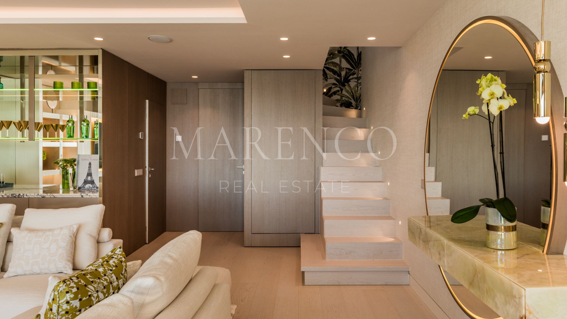 Orientada al sur, la propiedad cuenta con un acogedor hall de entrada que conduce a un impresionante salón de planta abierta con una acogedora chimenea y un elegante bar. La cocina, una creación a medida, está equipada exclusivamente con electrodomésticos Gaggenau y cuenta con una llamativa encimera de mármol que se extiende en una mesa de comedor fuera de la isla. La planta baja consta de dos dormitorios de invitados, cada uno de ellos con su propio cuarto de baño en el que se exhibe su propio mármol exclusivo, meticulosamente seleccionado por los cautivadores motivos que exhibe.