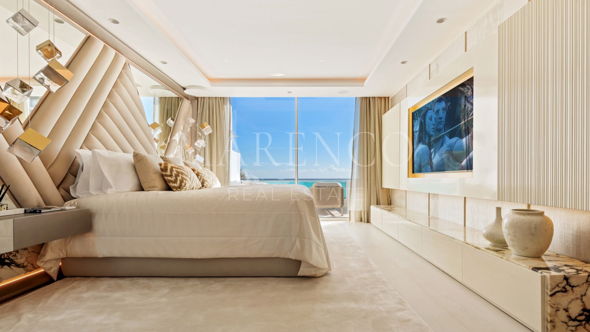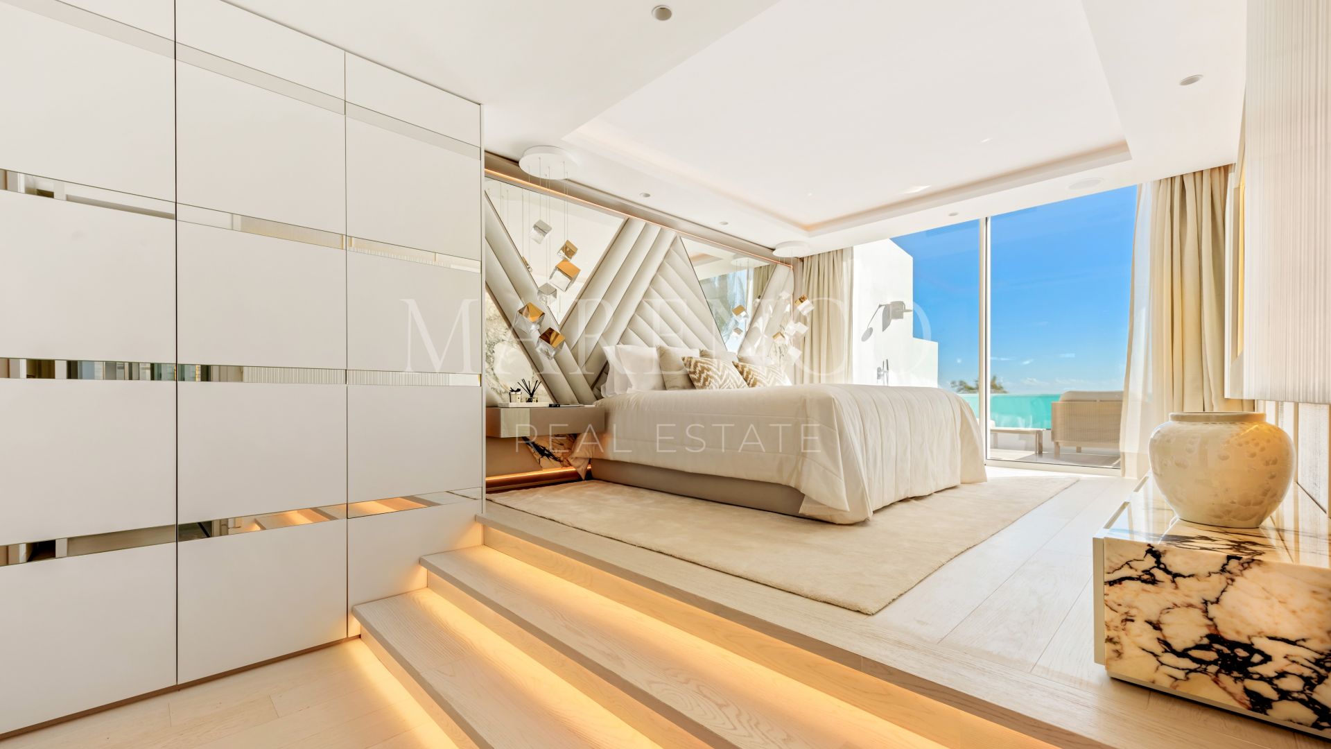 La planta superior cuenta con una sala de estar privada, que puede ser utilizada como una habitación de invitados adicional, además de un baño de invitados y el lujoso dormitorio principal. Esta suite cuenta con un amplio armario y acceso directo a una terraza privada, donde se encuentra una piscina de infinity con jacuzzi, perfecta para relajarse mientras podrás disfrutar de las impresionantes vistas al mar.
