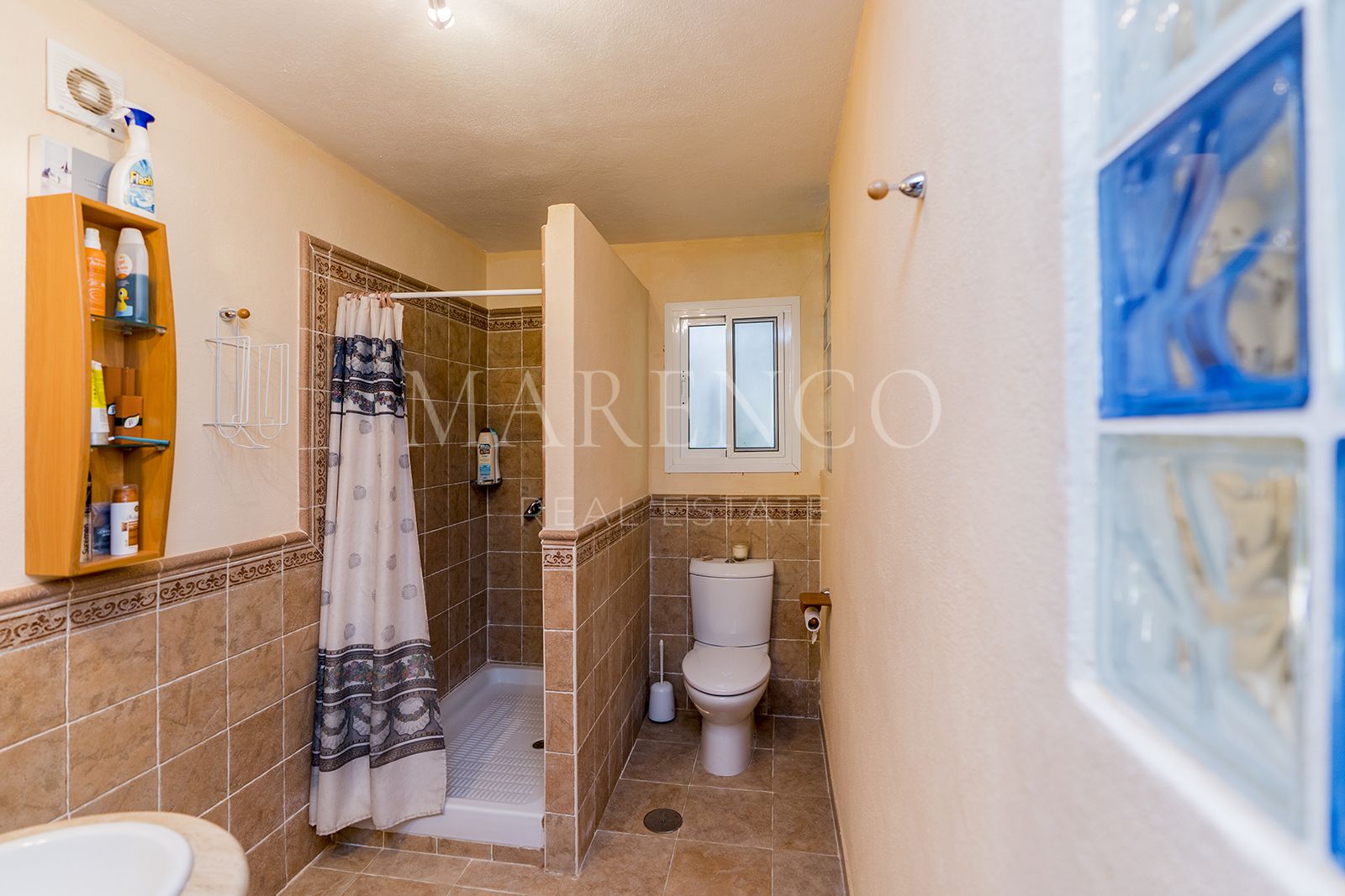 La vivienda de estilo tradicional se distribuye en una sola planta con 5 dormitorios y 4 baños. Ofrece una buena inversión y una generosa parcela con posibilidad de hacer reforma y sacar más m2.