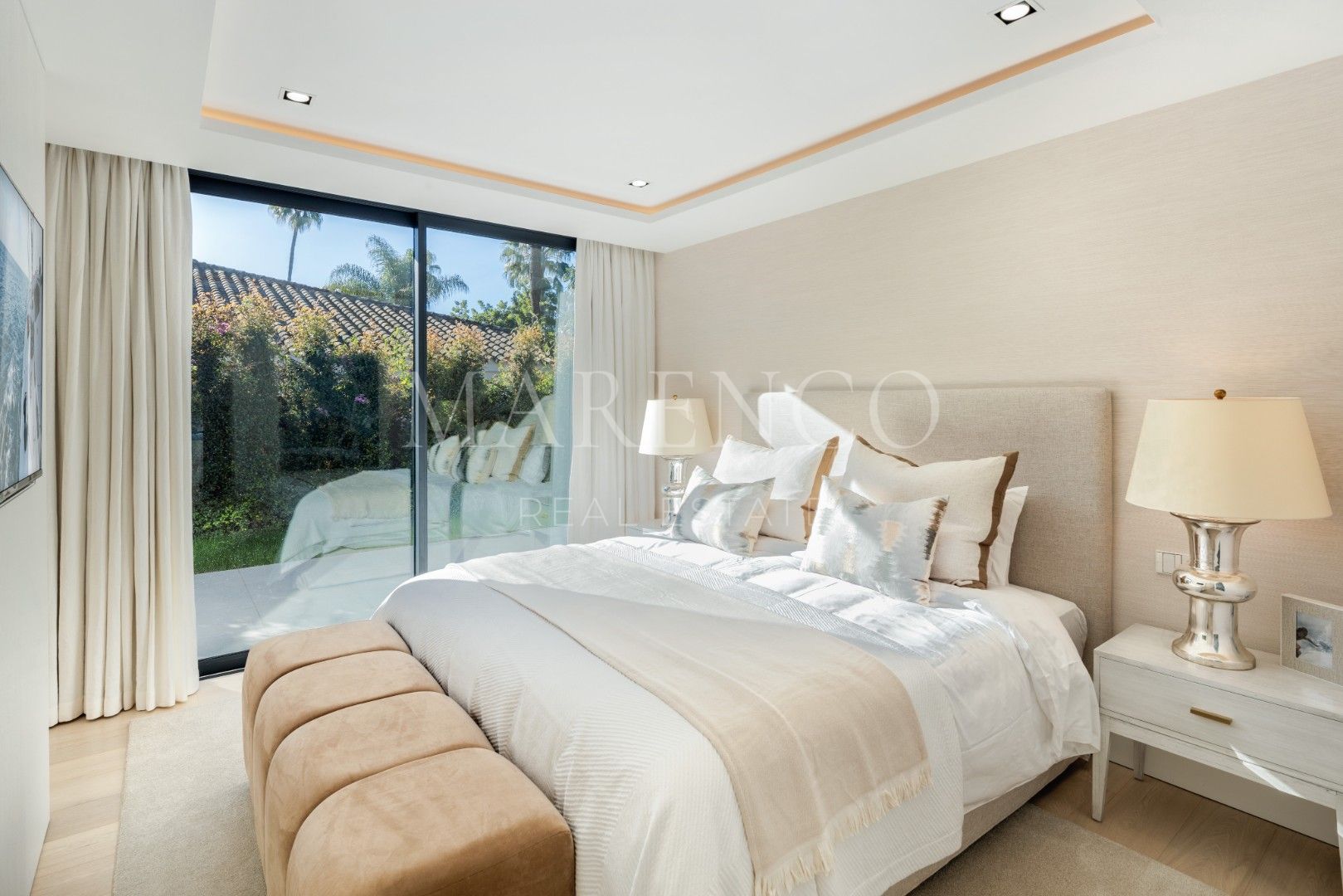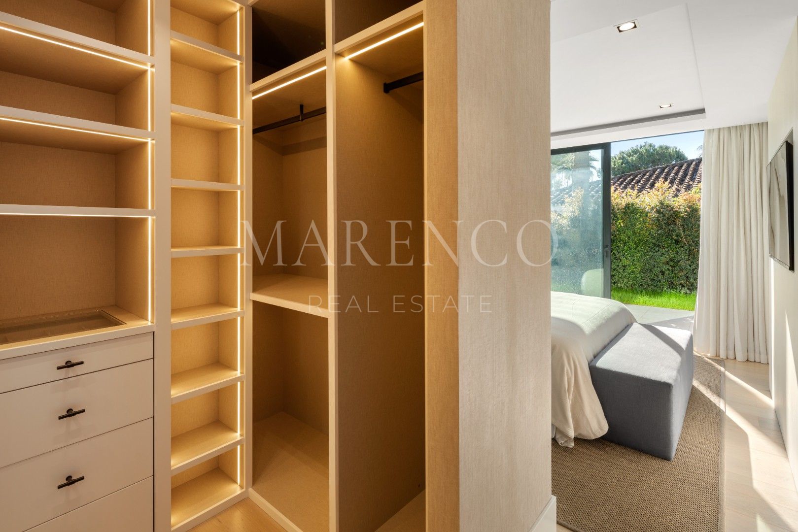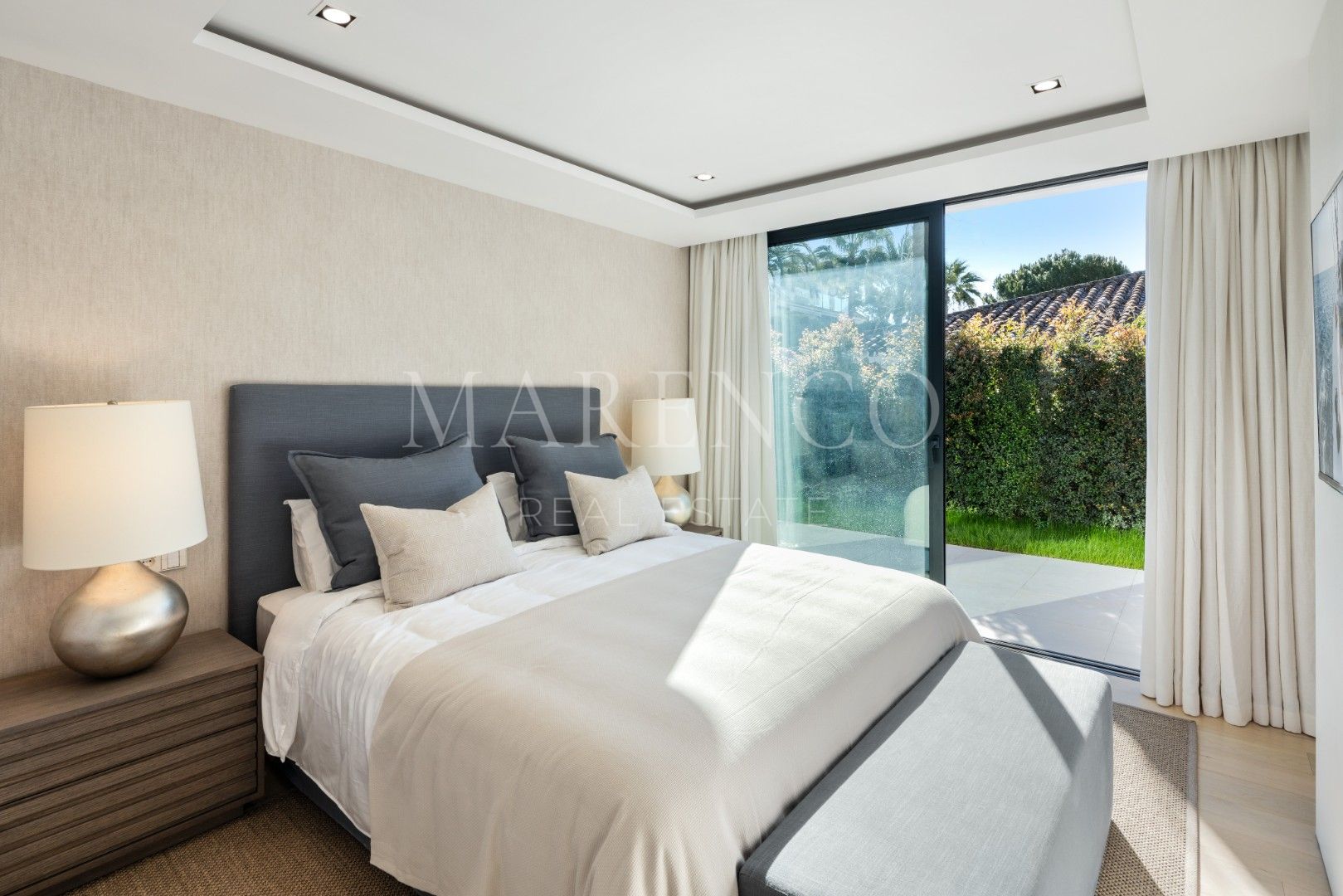 La villa consta de 4 dormitorios, cada uno con su propio baño en suite. El dormitorio principal cuenta con un vestidor espacioso y un baño de lujo que incluye bañera y ducha. Desde este dormitorio, hay acceso directo a una terraza privada con vistas impresionantes al jardín. Además, la villa incluye una sala que se puede usar como oficina, gimnasio o sala de juegos, según sus necesidades.
