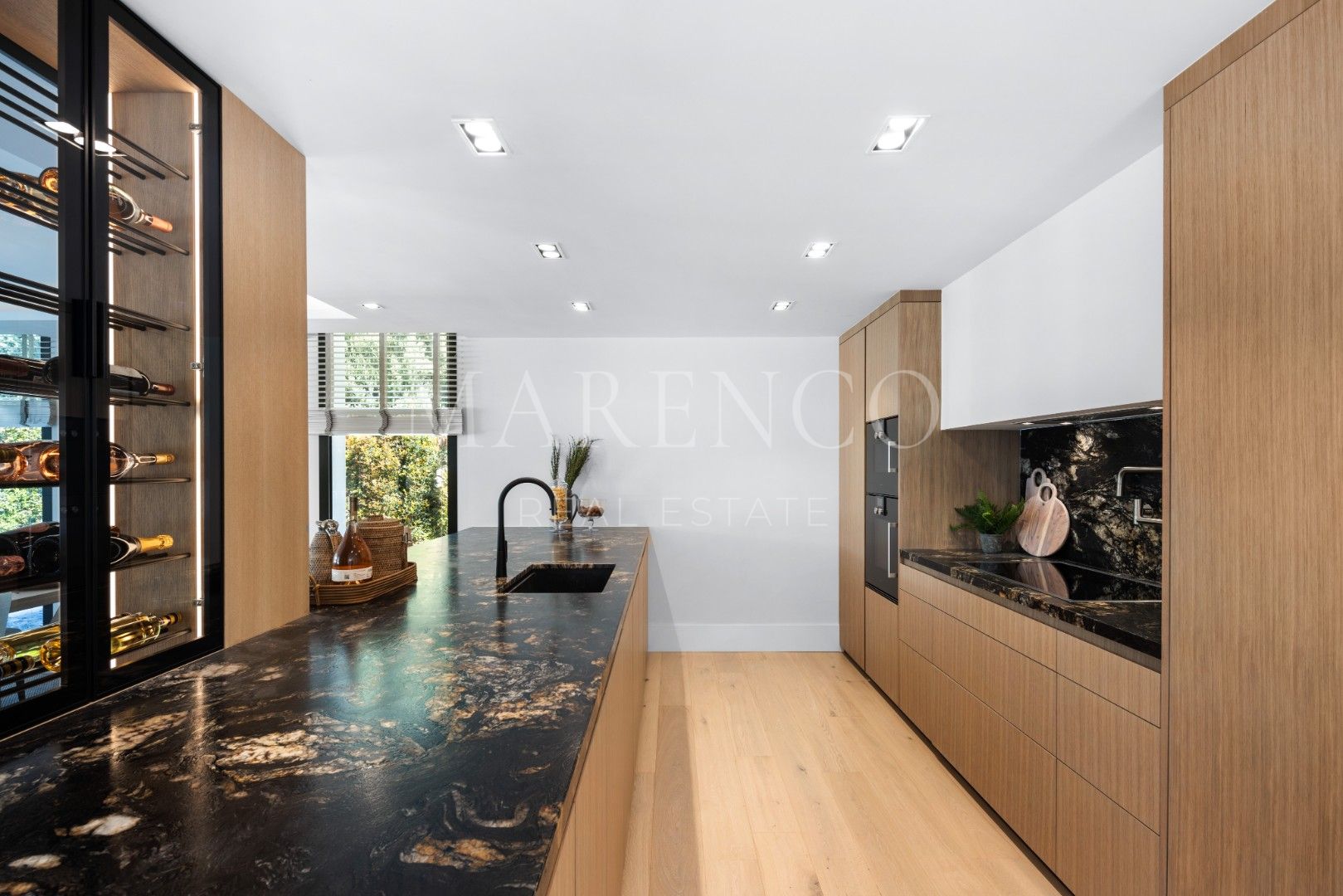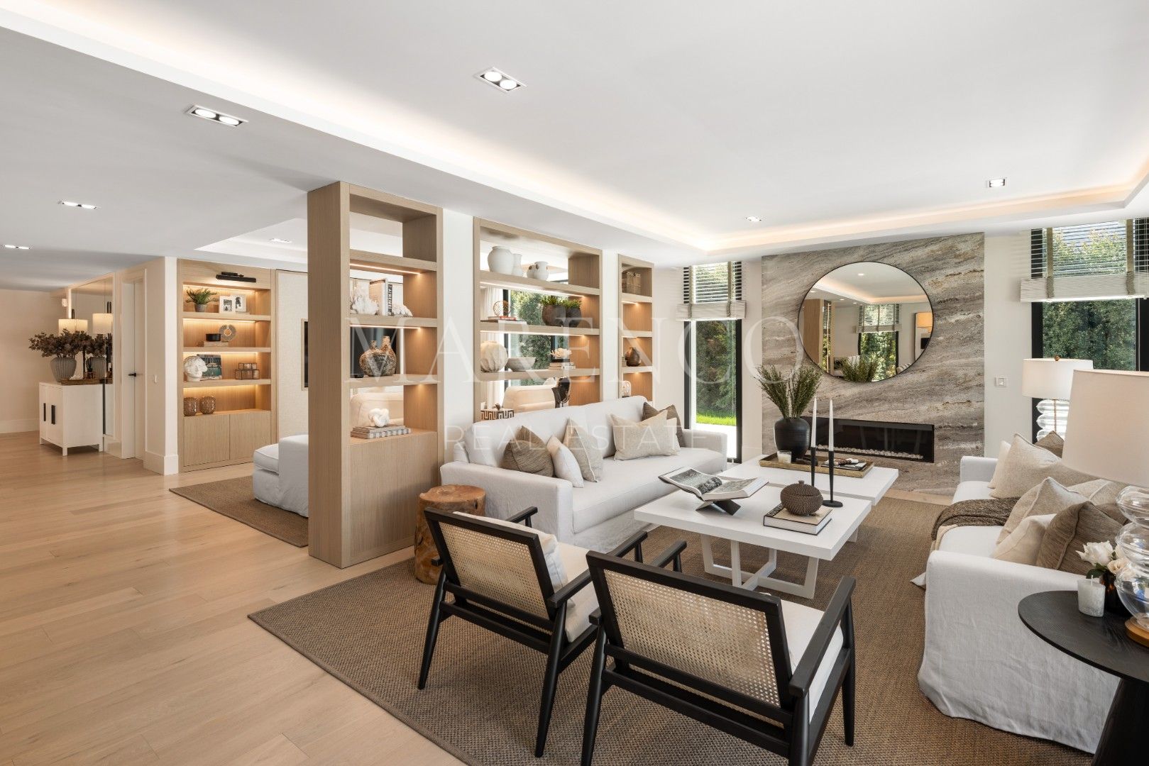 Al ingresar al interior de la villa, te encontrarás una sala de estar amplia y luminosa, con techos altos y grandes ventanales que dejan entrar mucha luz natural. Una elegante chimenea da un toque acogedor, y las puertas corredizas permiten un fácil acceso a la terraza y el jardín. La cocina es de última generación, con electrodomésticos de alta calidad y una isla central, también cuenta con una zona de comedor espaciosa ofrece el espacio ideal para cenas con amigos y familiares.