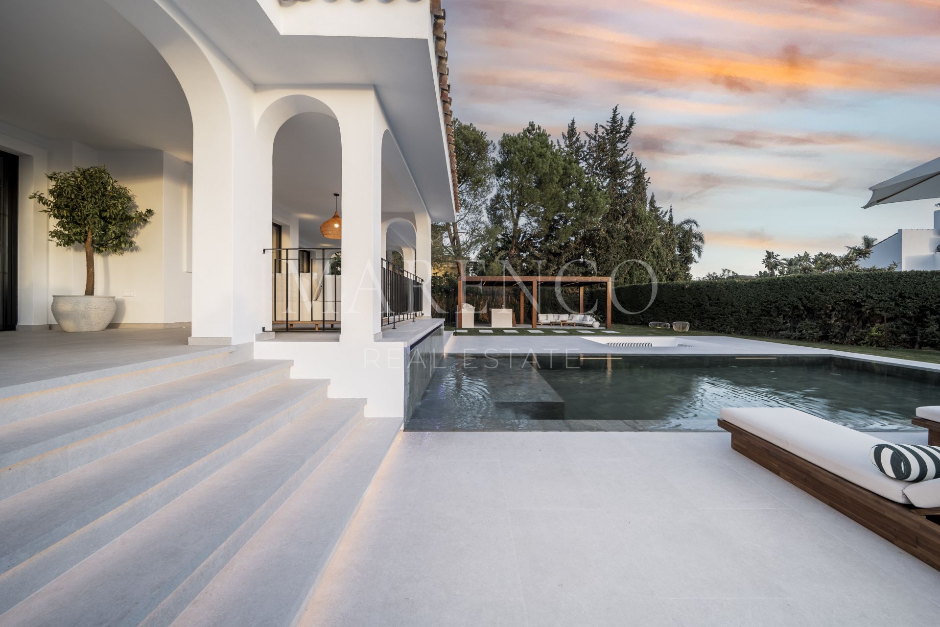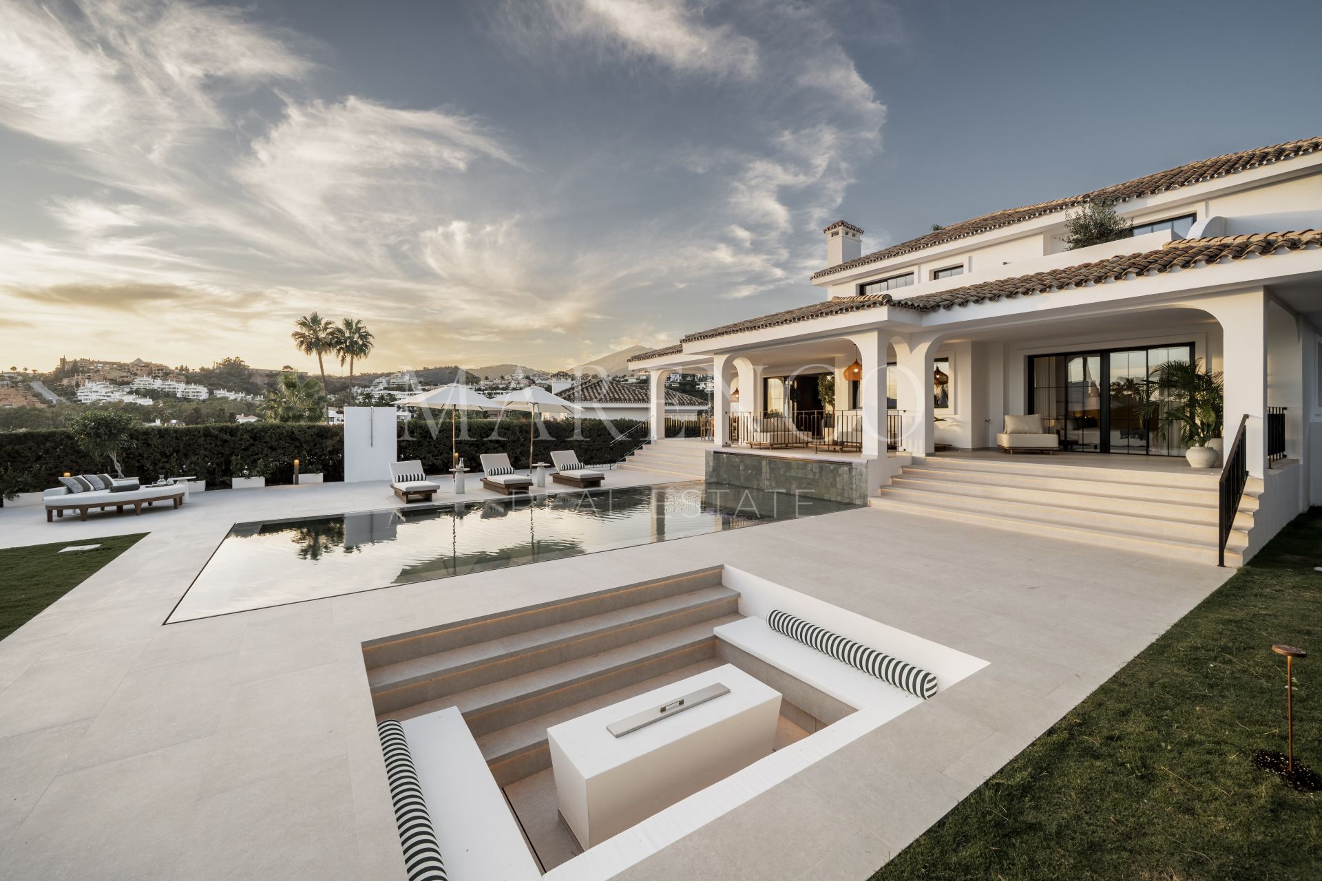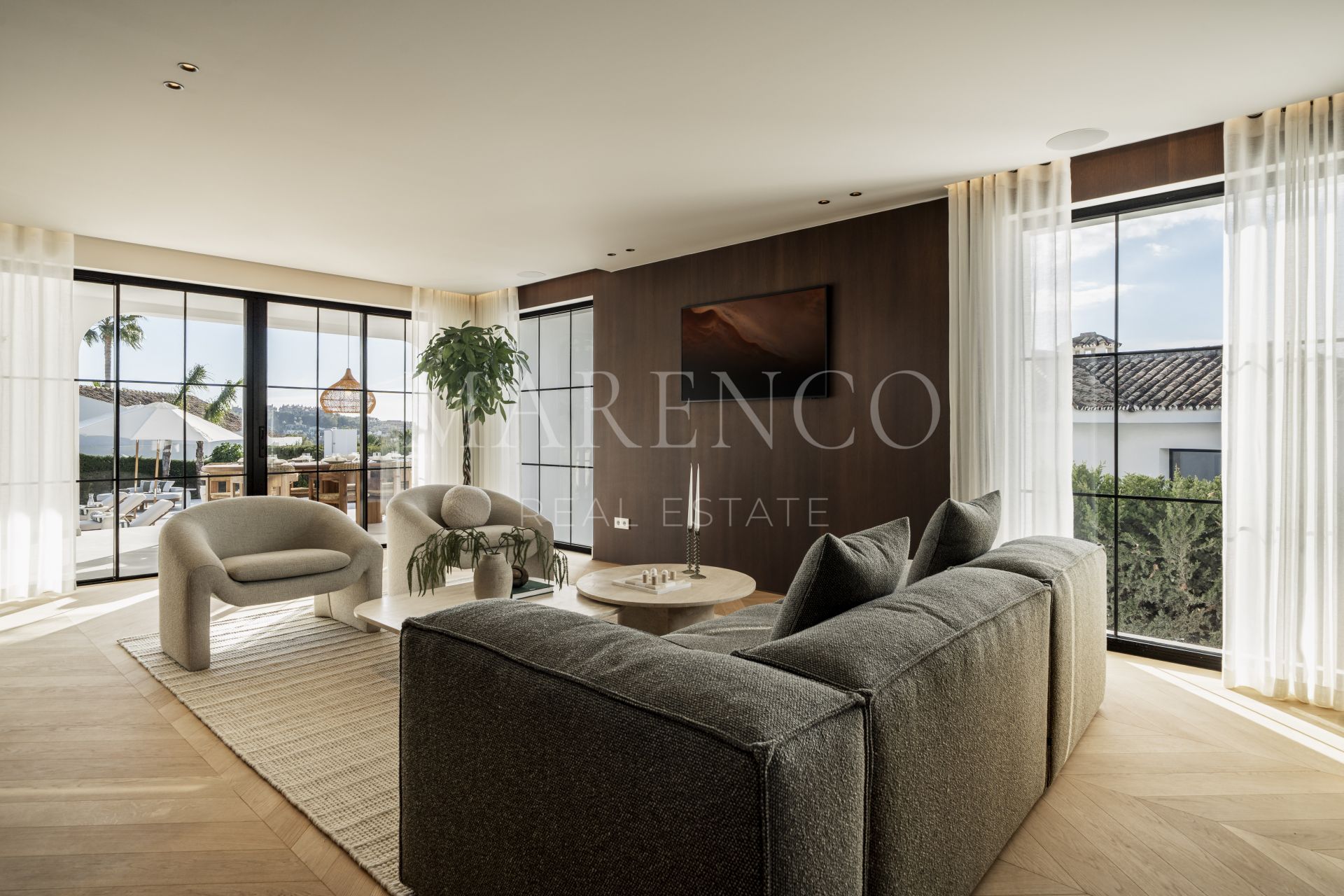 Las zonas exteriores han sido concebidas para disfrutar plenamente del clima mediterráneo, con amplias terrazas de 125 m² y un jardín muy generoso que ofrece múltiples espacios para relajarse, compartir comidas al aire libre o recibir invitados. Grandes ventanales refuerzan la conexión interior-exterior, permitiendo que la luz natural y las vistas formen parte constante de la vivienda. Esta villa de lujo en Nueva Andalucía también incorpora un completo spa interior con piscina climatizada, sauna y baño de vapor, creando un auténtico refugio de bienestar dentro de la propiedad.