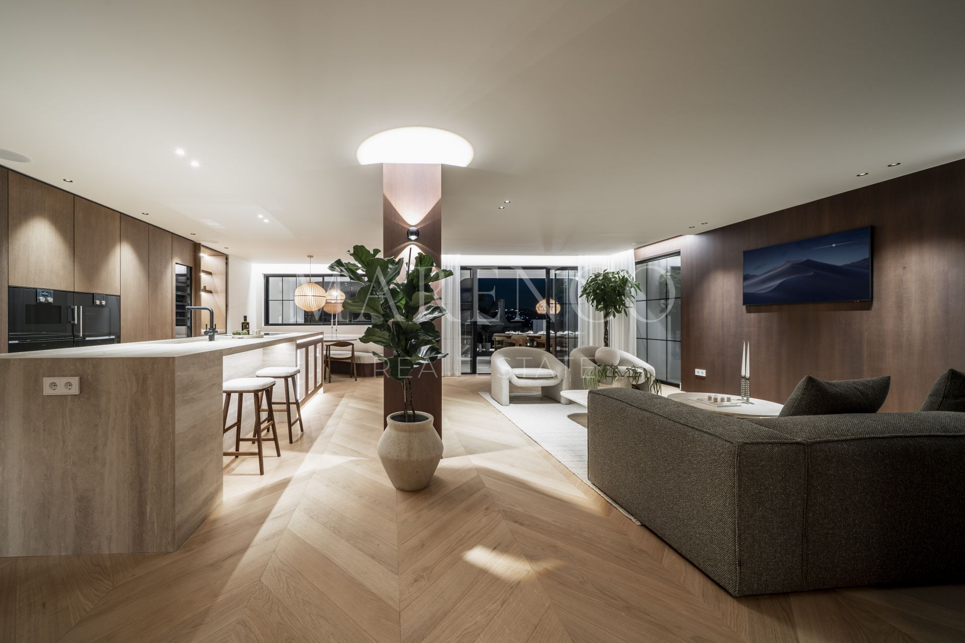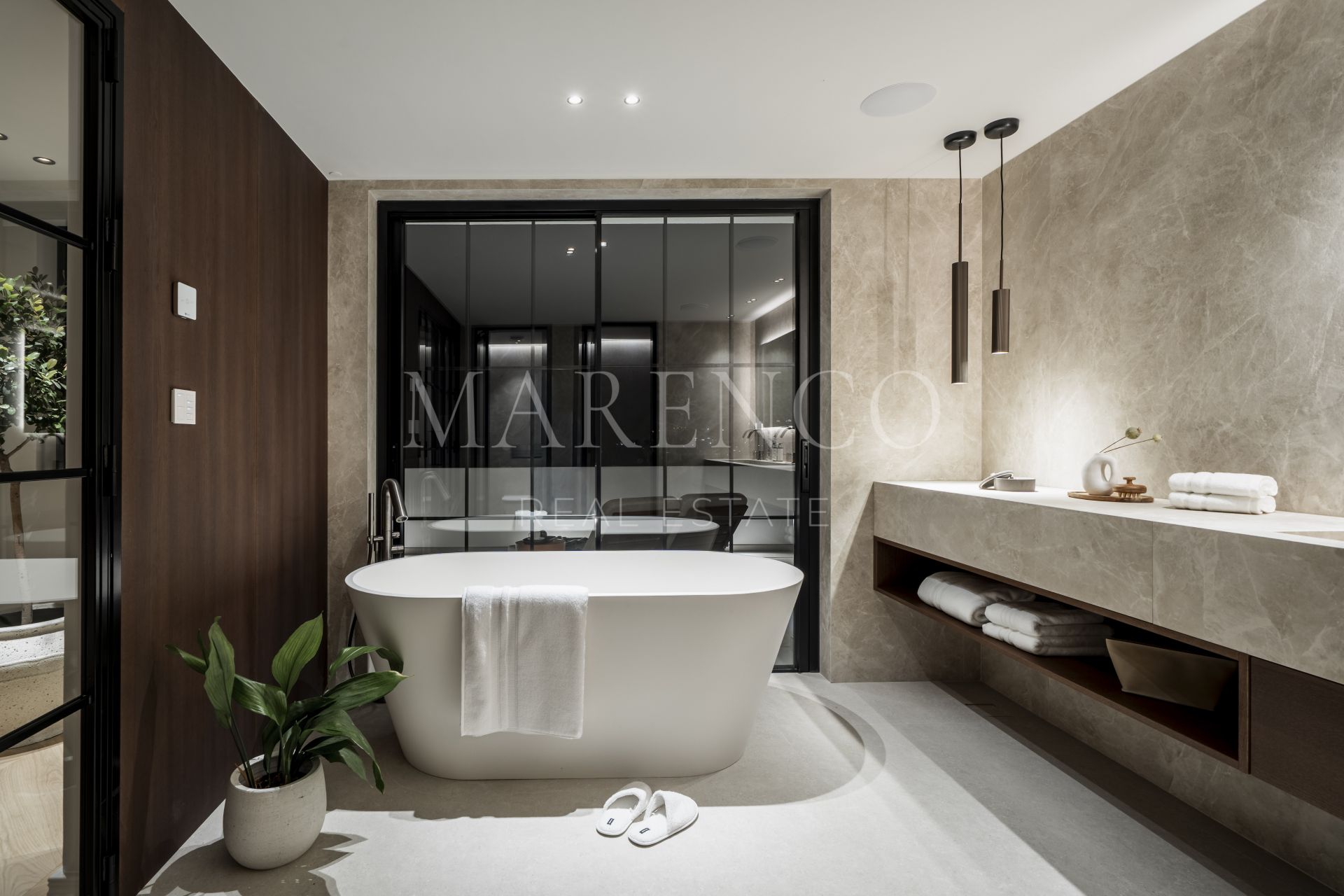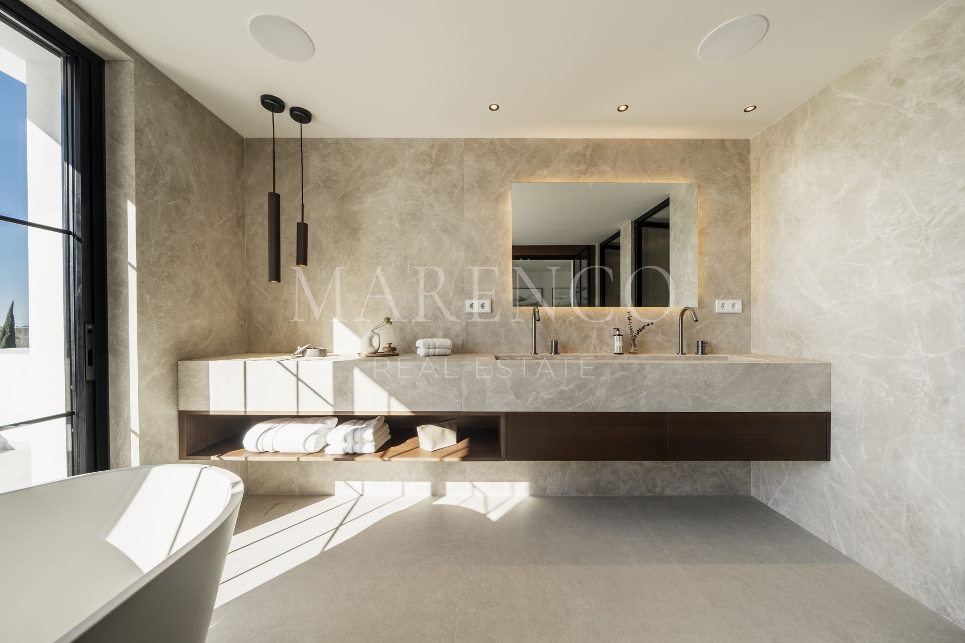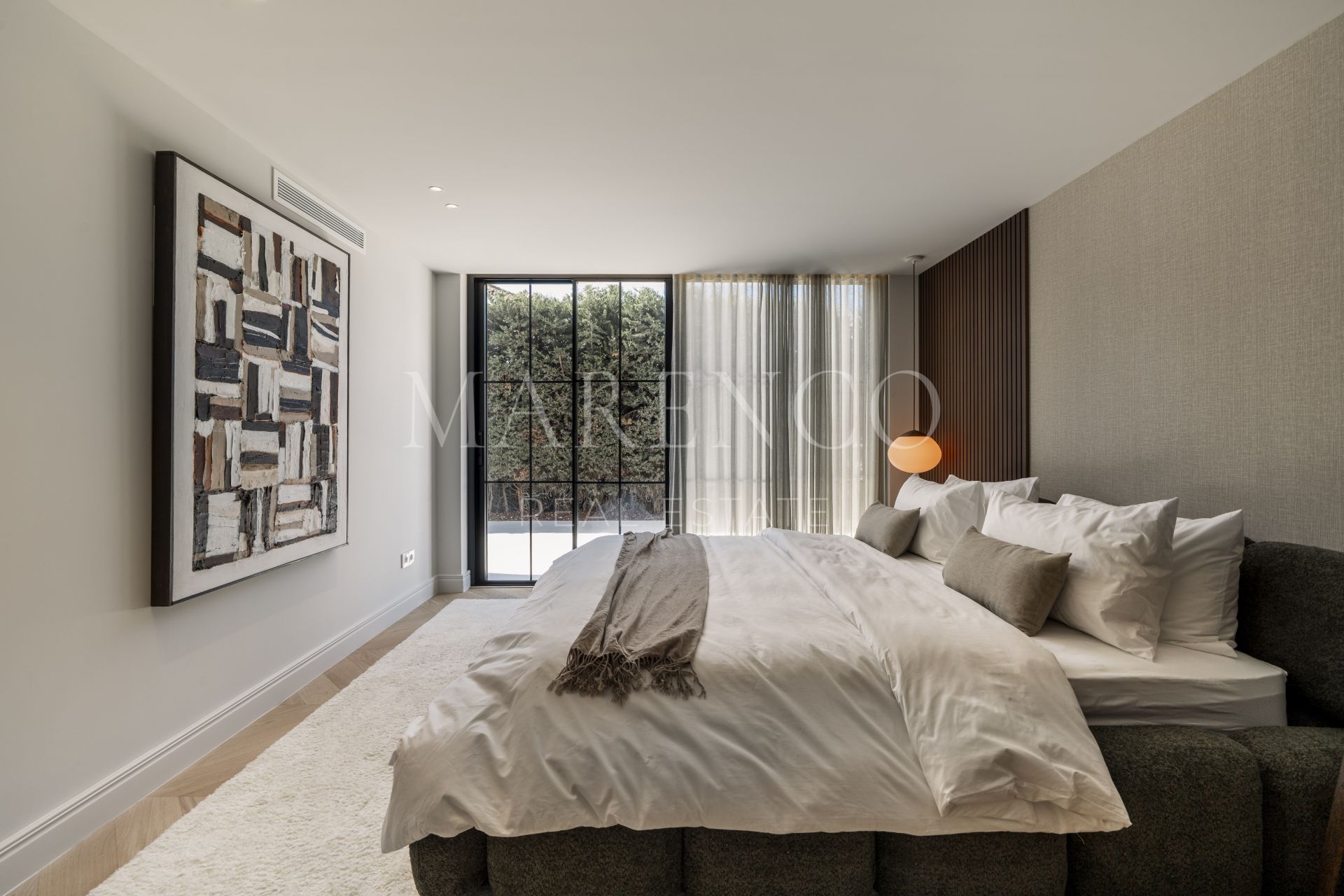 Las zonas exteriores han sido concebidas para disfrutar plenamente del clima mediterráneo, con amplias terrazas de 125 m² y un jardín muy generoso que ofrece múltiples espacios para relajarse, compartir comidas al aire libre o recibir invitados. Grandes ventanales refuerzan la conexión interior-exterior, permitiendo que la luz natural y las vistas formen parte constante de la vivienda. Esta villa de lujo en Nueva Andalucía también incorpora un completo spa interior con piscina climatizada, sauna y baño de vapor, creando un auténtico refugio de bienestar dentro de la propiedad.