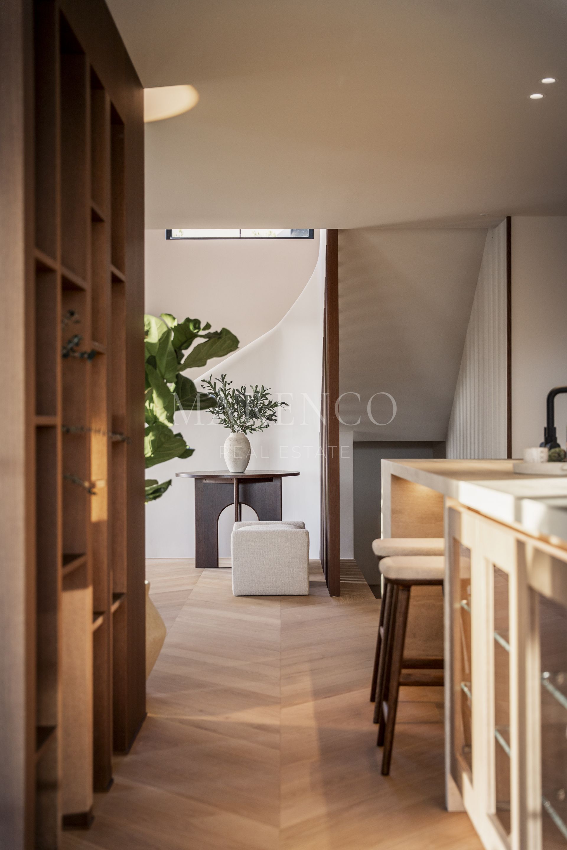 La villa se asienta sobre una parcela de 1.013 m² y cuenta con 390 m² construidos, distribuidos en espacios amplios y bien proporcionados. Dispone de cinco dormitorios y cuatro baños más un aseo de cortesía, diseñados para ofrecer confort tanto a la familia como a invitados. Los interiores destacan por su calidez y coherencia estética, con suelos de madera en espiga que aportan carácter y continuidad, y una cocina Danespan que actúa como corazón de la vivienda, combinando diseño limpio y funcionalidad para el día a día y el entretenimiento.