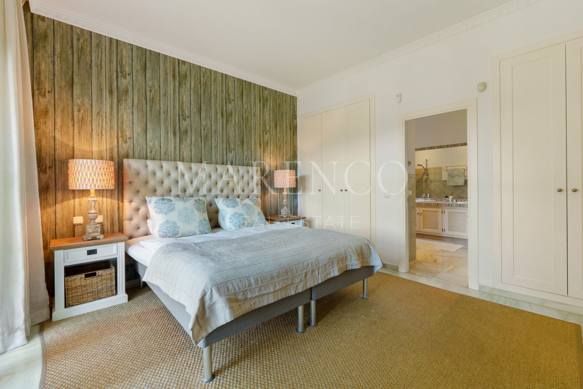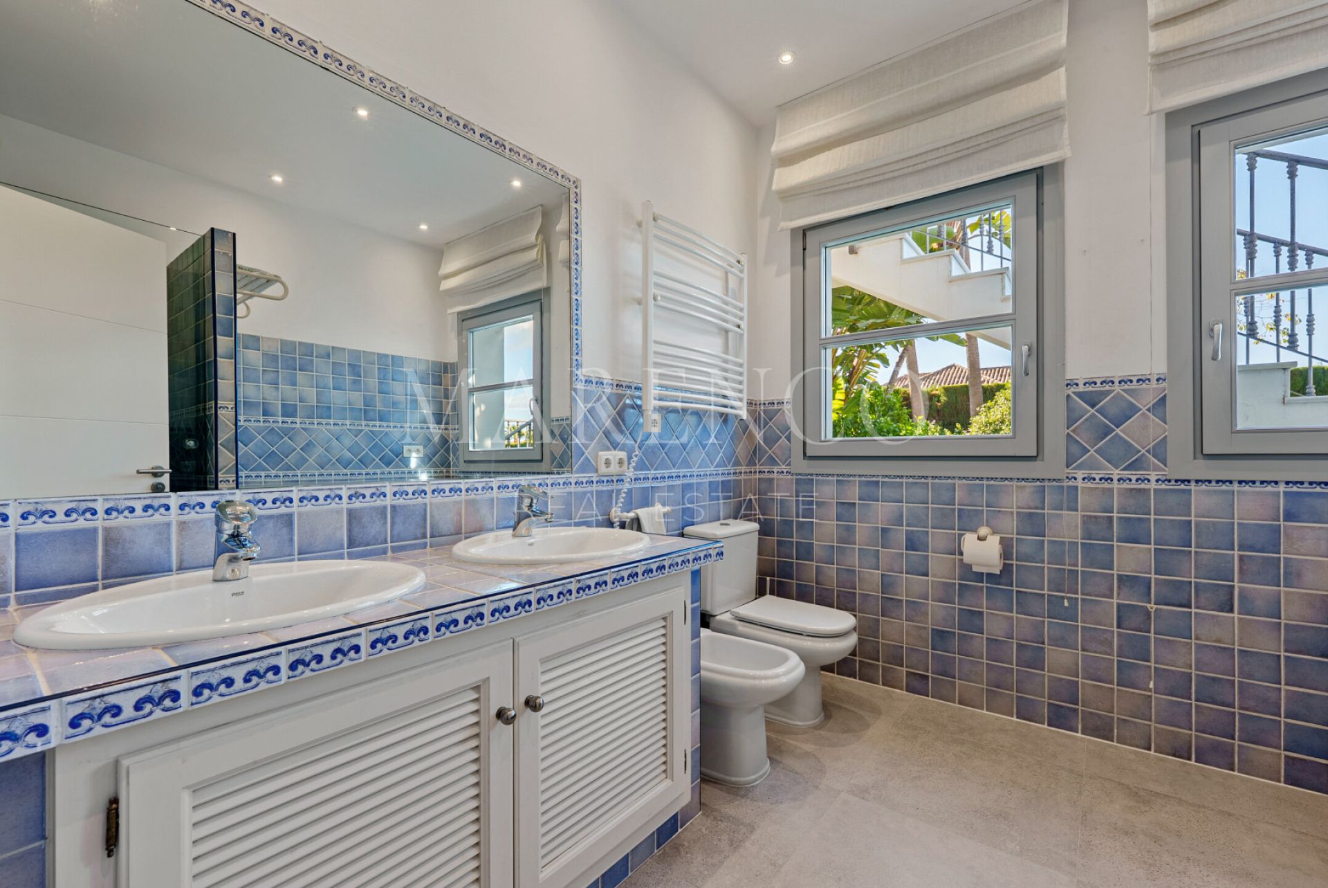 Los dormitorios son amplios y luminosos, con el dormitorio principal ofreciendo vistas al jardín y acceso directo al exterior. Los baños conservan un encanto andaluz, con detalles artesanales y acabados tradicionales. En el exterior, el solárium ofrece vistas abiertas al mar y a la emblemática montaña de La Concha, aportando un espacio adicional para relajarse o disfrutar de reuniones al aire libre en un entorno privilegiado.