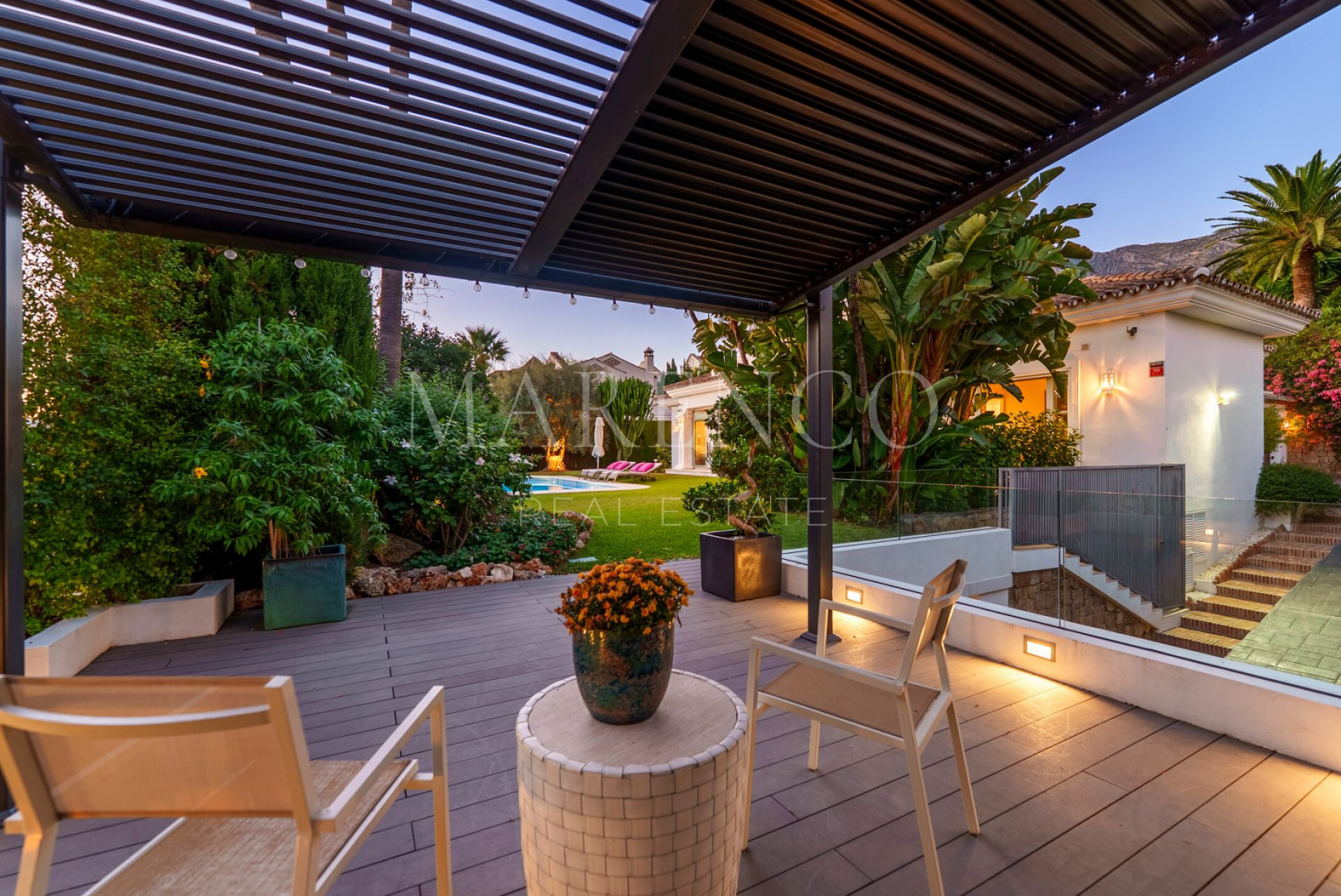 Entre las características más destacadas de esta propiedad se encuentran la piscina de agua salada, el cuidado jardín privado y las distintas zonas exteriores pensadas para el descanso y el entretenimiento. La vivienda ha sido objeto de varias mejoras recientes, incluyendo nuevas ventanas, sistema de aire acondicionado actualizado, una amplia terraza de travertino en la parte trasera y una elegante terraza frontal con pérgola y cochera cubierta. Todo ello refuerza el carácter de esta villa de lujo en Sierra Blanca, Marbella Golden Mile, concebida para disfrutar del estilo de vida mediterráneo con total privacidad.