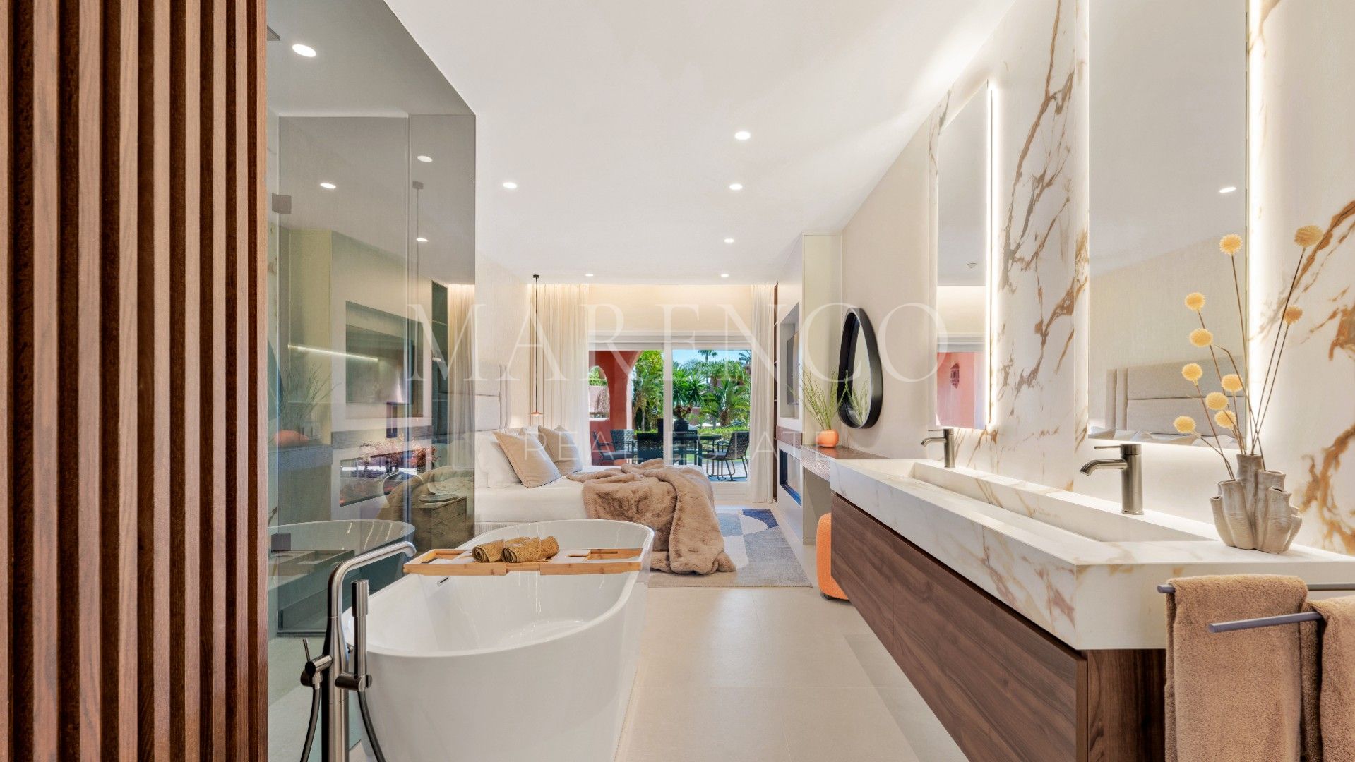 Este apartamento en planta baja, orientado al sur, cuenta con 3 dormitorios y 3 baños y ha sido completamente renovado con los más altos estándares. Ofrece vistas encantadoras a los exuberantes jardines paisajísticos. Con una superficie construida total de 142 m² y una amplia terraza privada de 60 m², este apartamento proporciona un espacio de vida abierto, amplio y lujoso.