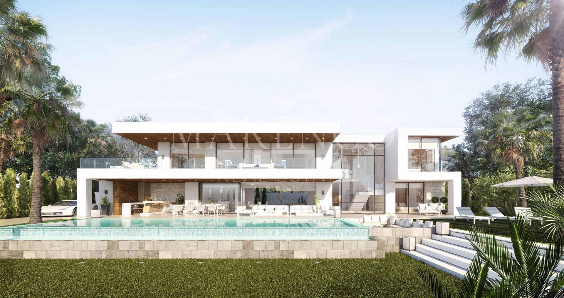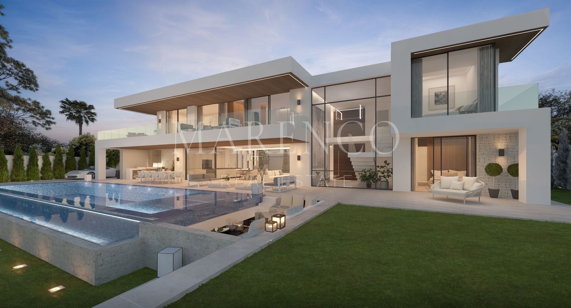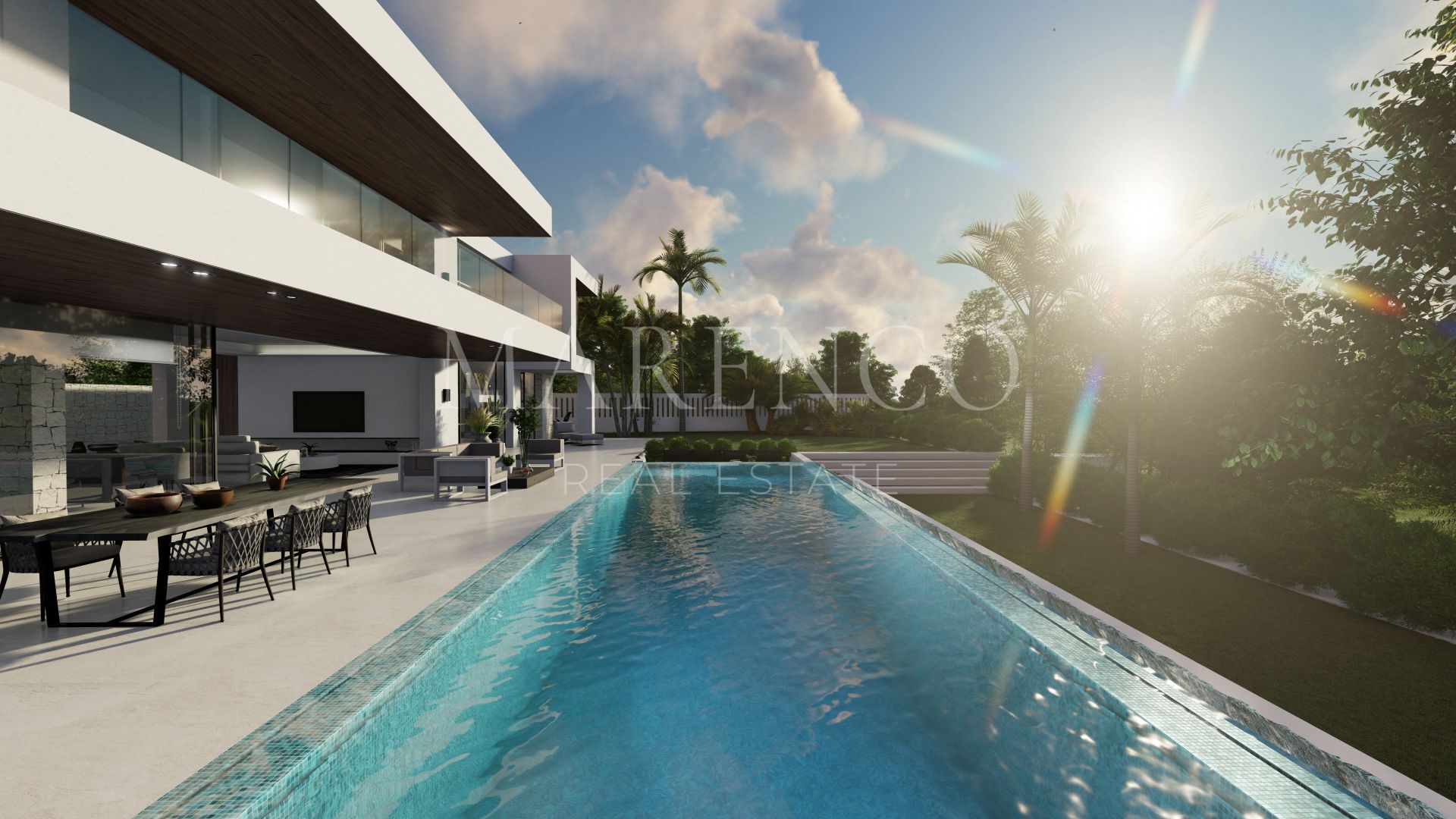 Villa à vendre à Guadalmina Baja, San Pedro de Alcantara avec 5 Chambres, 5 Salles de bain, 5 salles de bain en-suite, 2 toilets, construit 2024 et a piscine (privé), garage (abri voiture) et garden (privé). Dimensions: 460m² construit et 1016m² Parcelle.
