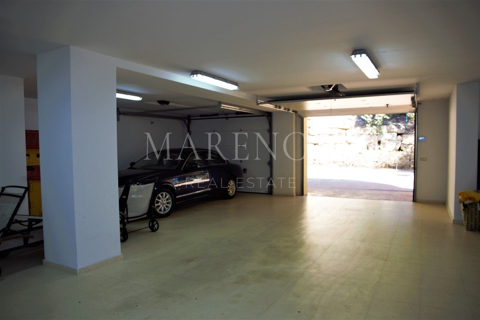 Le niveau du jardin offre un salon spacieux avec une sortie vers le jardin, une grande quatrième chambre avec salle de bain attenante, un sauna, une cave à vin, un garage pour 3 voitures et une chambre de personnel avec salle de douche.