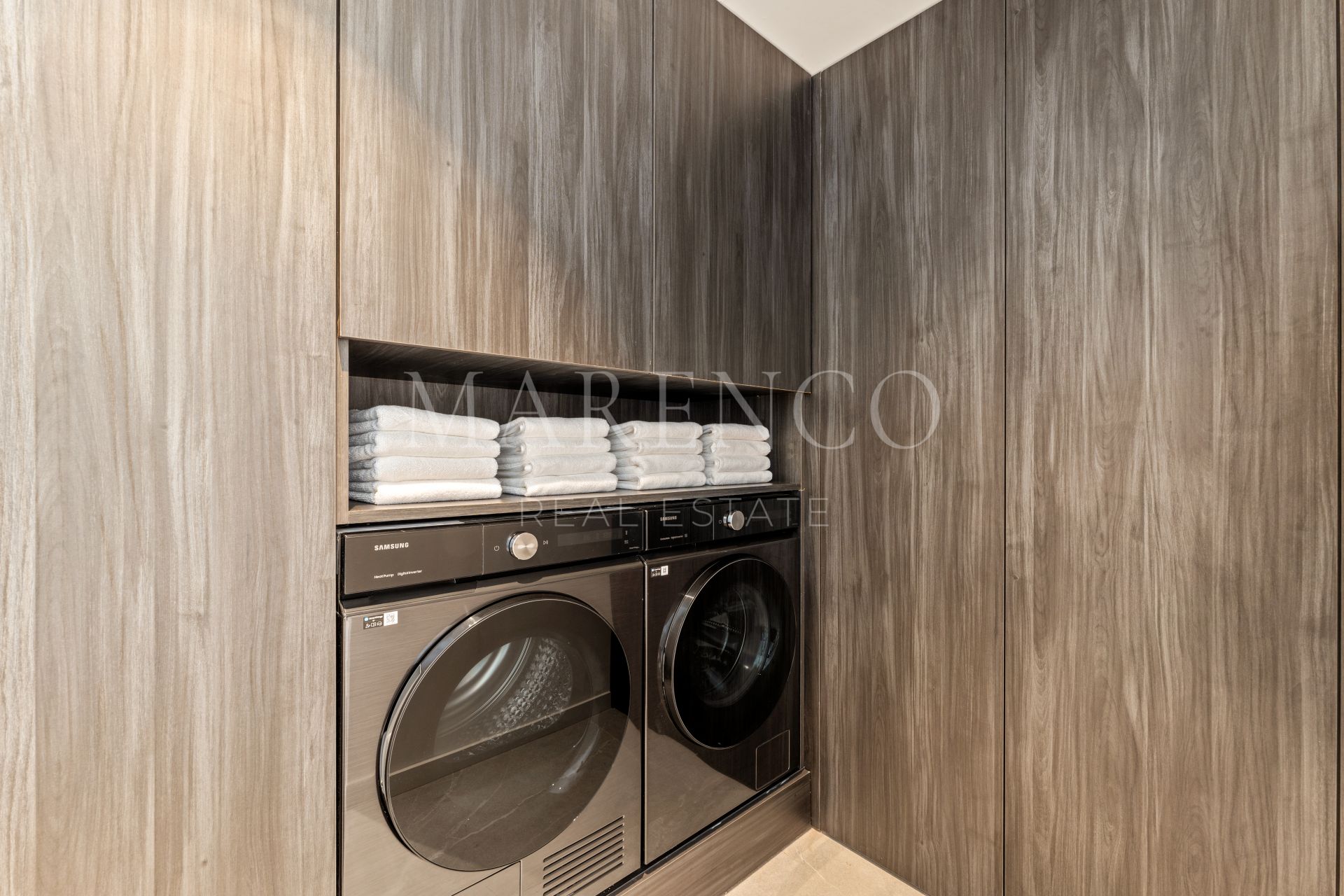 La propriété bénéficie de l’apport architectural d’un designer renommé et a été récemment rénovée par Casa Renovo, améliorant finitions et matériaux. Les intérieurs présentent actuellement un mobilier élégant en bois, mettant en avant chaleur et qualité tout en complétant l’architecture moderne. Bien que non inclus dans le prix de vente, ce mobilier soigneusement sélectionné peut être acquis séparément. À l’extérieur, une vaste terrasse accueille une salle à manger, une cuisine extérieure et un barbecue intégré, le tout face à la vallée et à la mer. Les installations communes incluent une grande piscine et des jardins paysagers, renforçant le sentiment d’intimité et de communauté.
