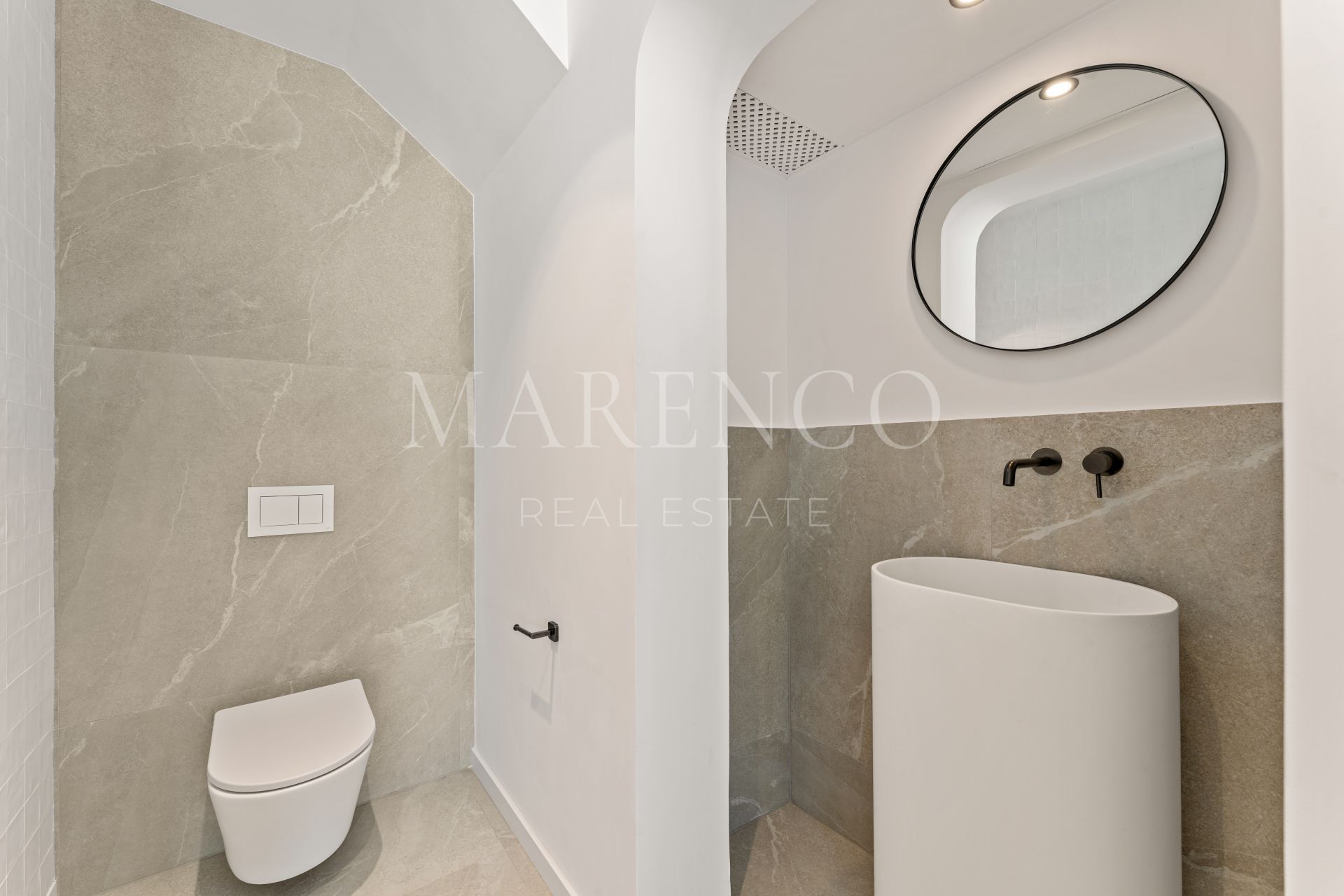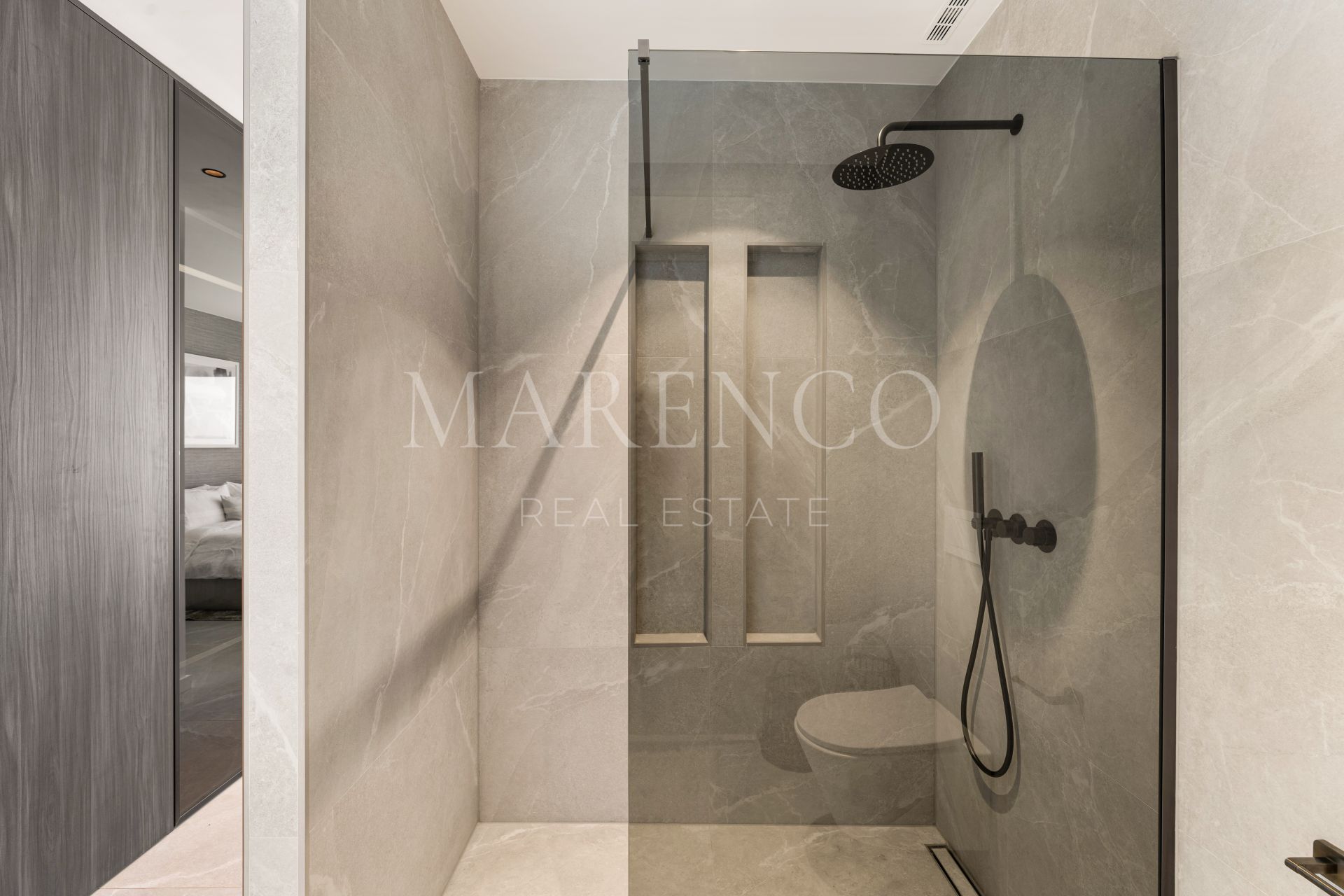 À l’étage, les trois chambres sont conçues pour offrir intimité et confort. Chacune dispose d’une salle de bains privative et d’un accès direct à une terrasse, créant des espaces extérieurs privés avec de superbes vues sur la mer et les montagnes. La suite parentale se distingue par une terrasse plus vaste, de grandes proportions et une ambiance intérieure raffinée. Ces éléments offrent un équilibre parfait entre fonctionnalité et détente.