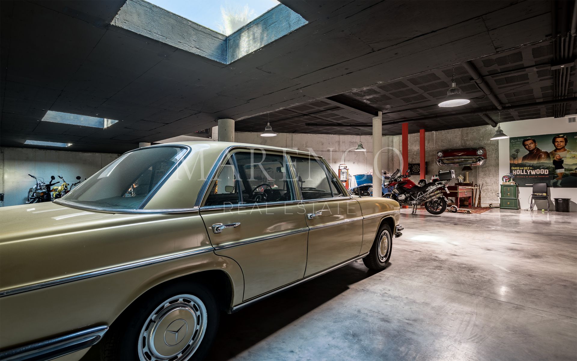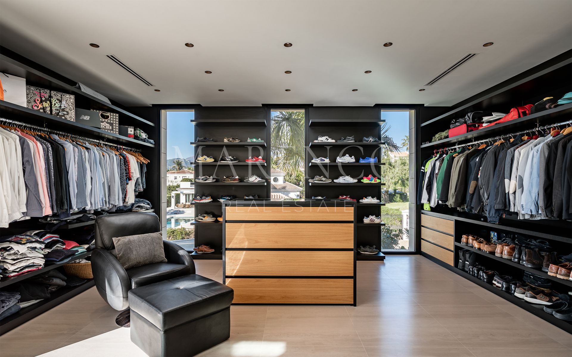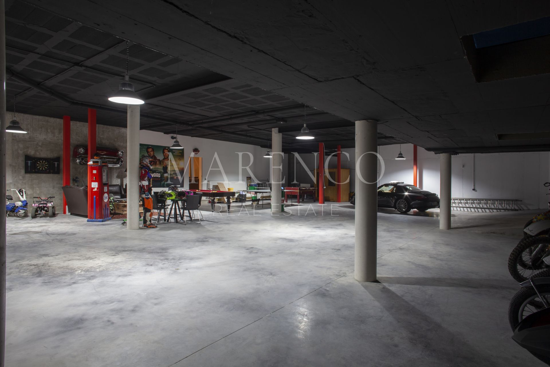 La propriété est répartie sur trois niveaux et dispose de 7 chambres et 6 salles de bains. L’une des chambres est particulièrement unique, avec des fenêtres spéciales permettant de voir directement dans le garage en contrebas. De plus, un ascenseur relie tous les étages de la maison.