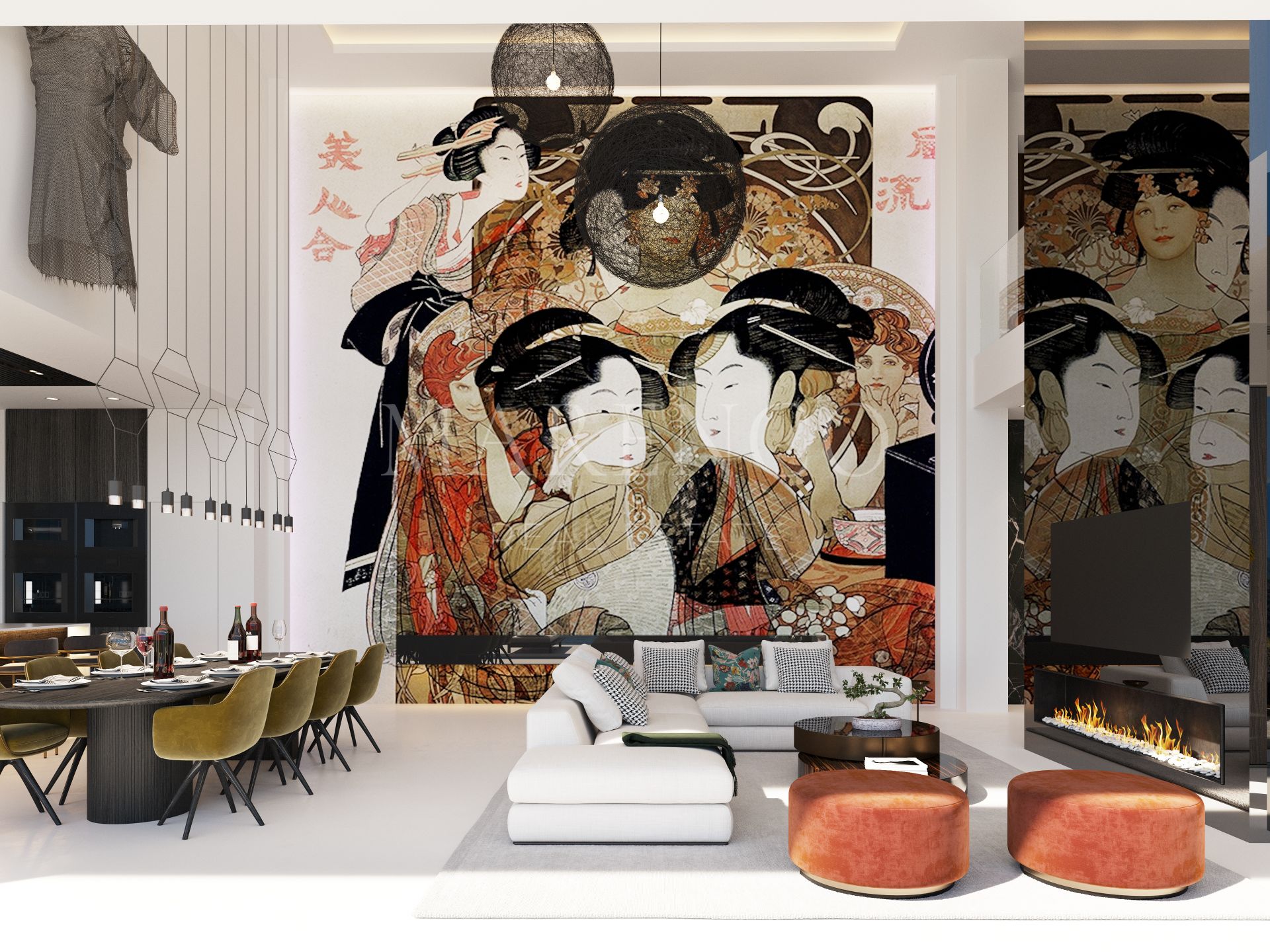 Innen- und Außenleben im Einklang: Dieses Konzept steht im Mittelpunkt des Designs jeder Villa, bei dem das Wohnzimmer und die Terrasse nahtlos in einen großen, offenen Wohnbereich übergehen. An strategischen Stellen verschwinden die Fenster vollständig in den Wänden und rahmen so den ungestörten Panoramablick auf die idyllische Naturlandschaft ein.