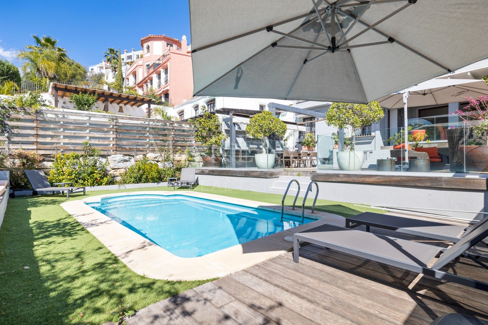 Dieses außergewöhnliche Reihenhaus mit fünf Schlafzimmern befindet sich in der charmanten und sicheren Wohnanlage La Perla de la Heredia und vereint zeitlose mediterrane Architektur mit modernem Wohnkomfort. Ideal gelegen an der prestigeträchtigen Ronda-Straße, nur wenige Minuten von Marbella, dem Stadtzentrum von San Pedro und einigen der besten Golfplätze der Costa del Sol entfernt, bietet dieses Haus die perfekte Balance zwischen Privatsphäre, Komfort und Lebensqualität. Dank der Südwest-Ausrichtung genießt die Immobilie den ganzen Tag über Sonnenlicht und bietet einen offenen Blick auf die privaten Terrassen, den Garten und den Poolbereich.