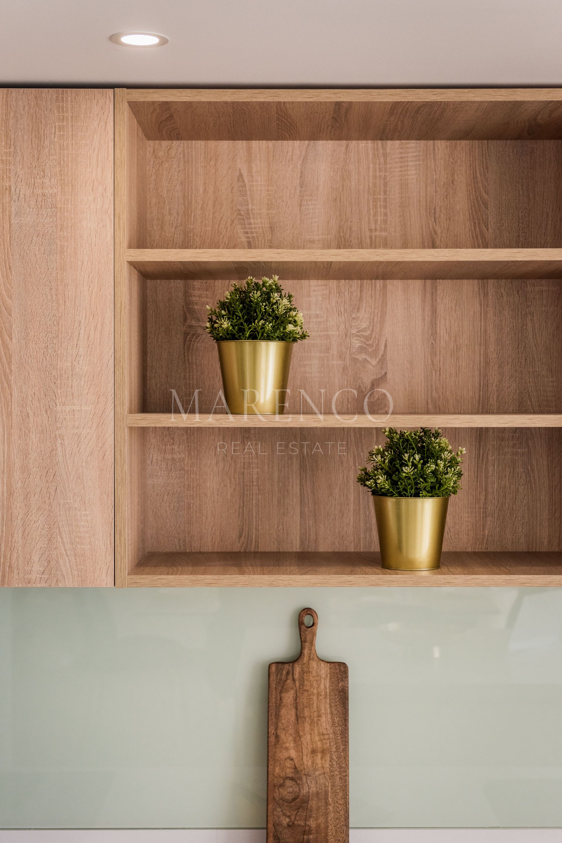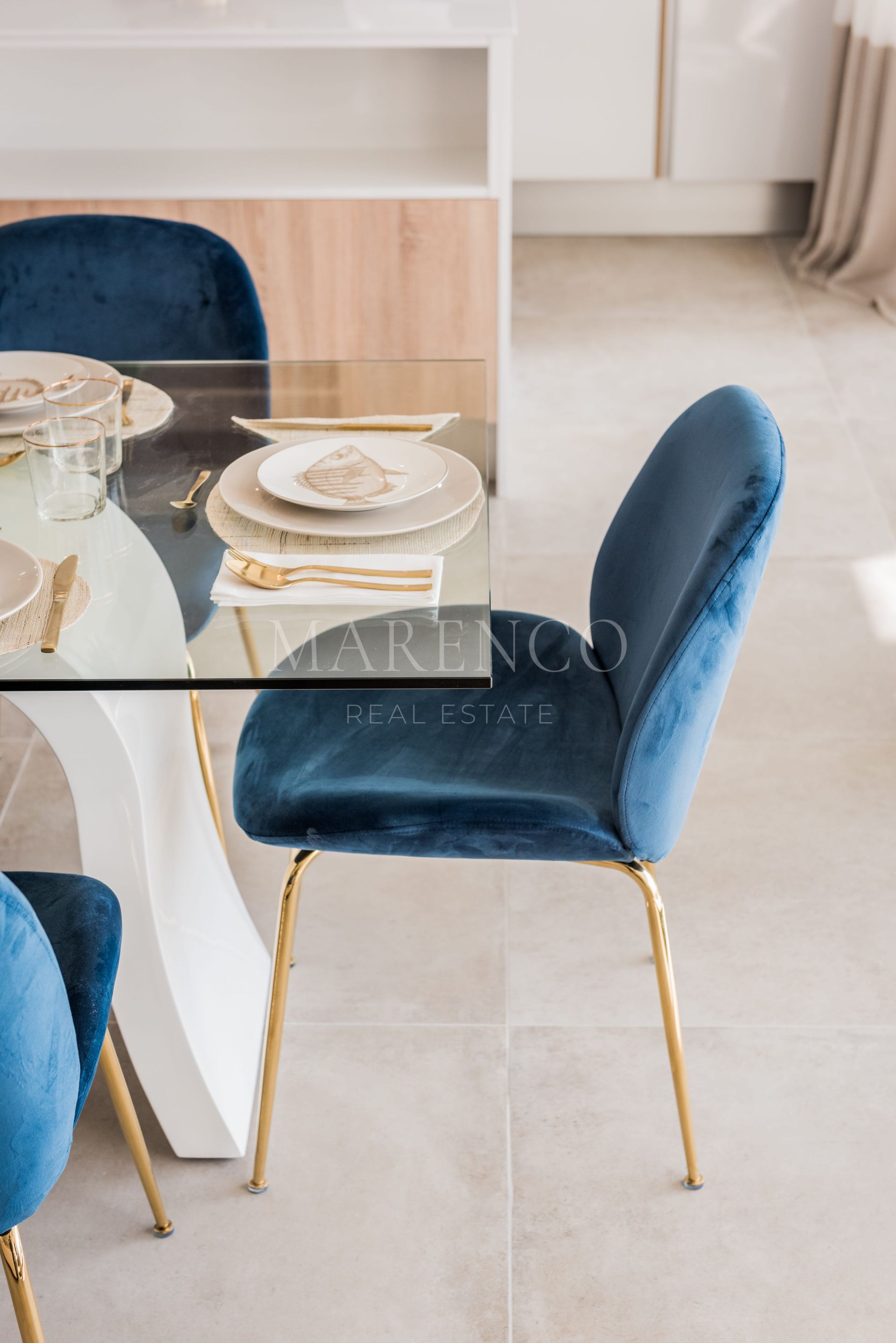 Die Wohnung verfügt über 2 Schlafzimmer und 2 Badezimmer sowie ein großzügiges Wohnzimmer, in dem vier Schiebetüren vollständig hintereinander gleiten, um den Raum vollständig zur Terrasse hin zu öffnen. Die voll ausgestattete Küche mit allen enthaltenen Geräten fügt sich harmonisch in den Wohnbereich ein und schafft eine helle, funktionale Atmosphäre.