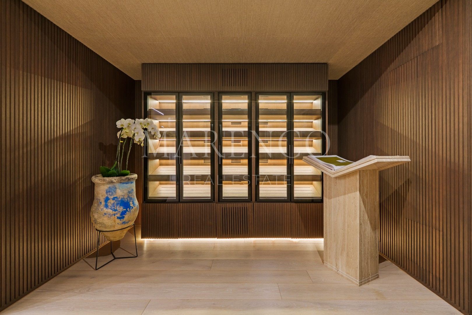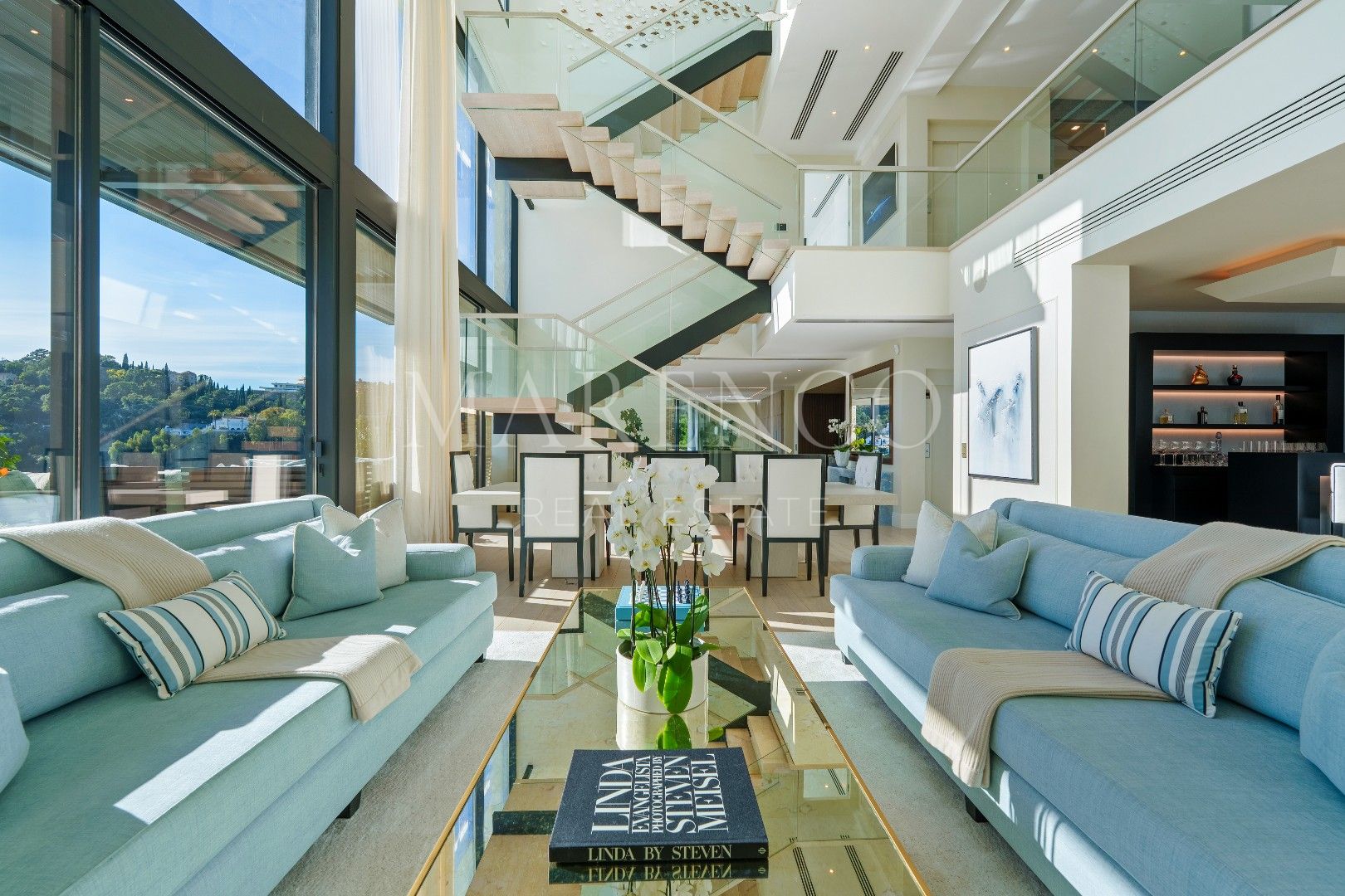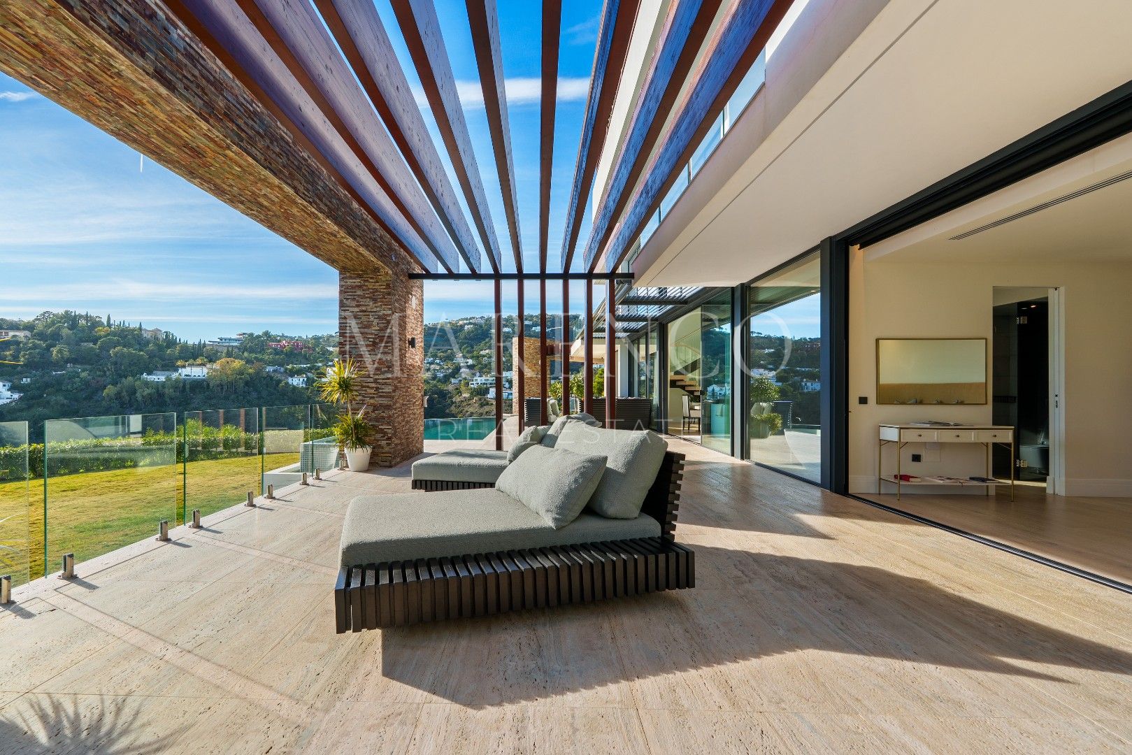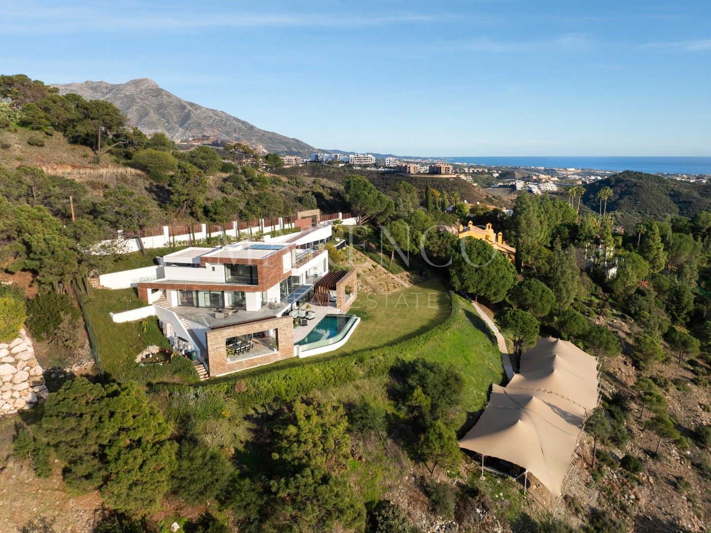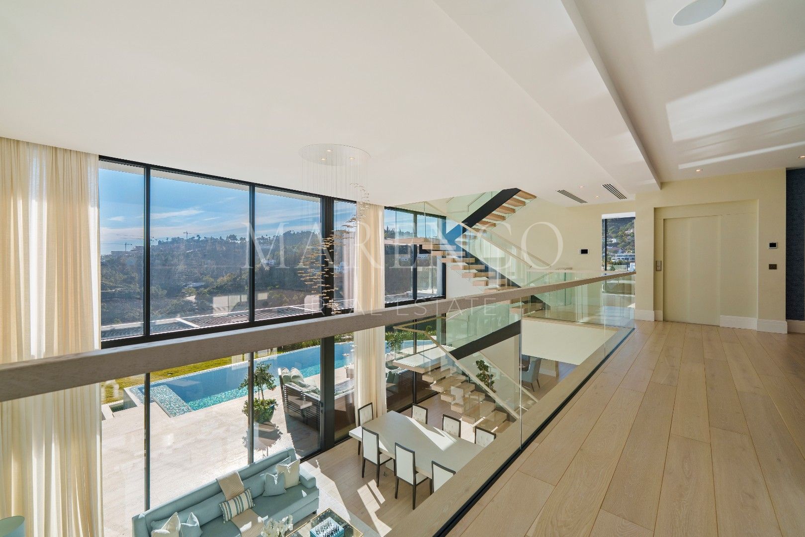 Die Immobilie bietet 715 m² Wohnfläche auf drei Ebenen sowie 453 m² Terrassenflächen. Sie verfügt über fünf Schlafzimmer, fünf Badezimmer und ein Gäste-WC. Die obere Etage ist überwiegend der Master-Suite mit Ankleidezimmer und Bibliothek gewidmet, ergänzt durch ein weiteres Gästezimmer mit eigenem Bad. Auf der Hauptebene befinden sich repräsentative Wohnbereiche, ein separates Esszimmer, eine moderne voll ausgestattete Küche, ein Weinkeller sowie eine Gästesuite mit direktem Zugang zur Terrasse und zum beheizten Salzwasser-Infinity-Pool. Im Untergeschoss befinden sich eine private Garage und ein separates Home-Office.