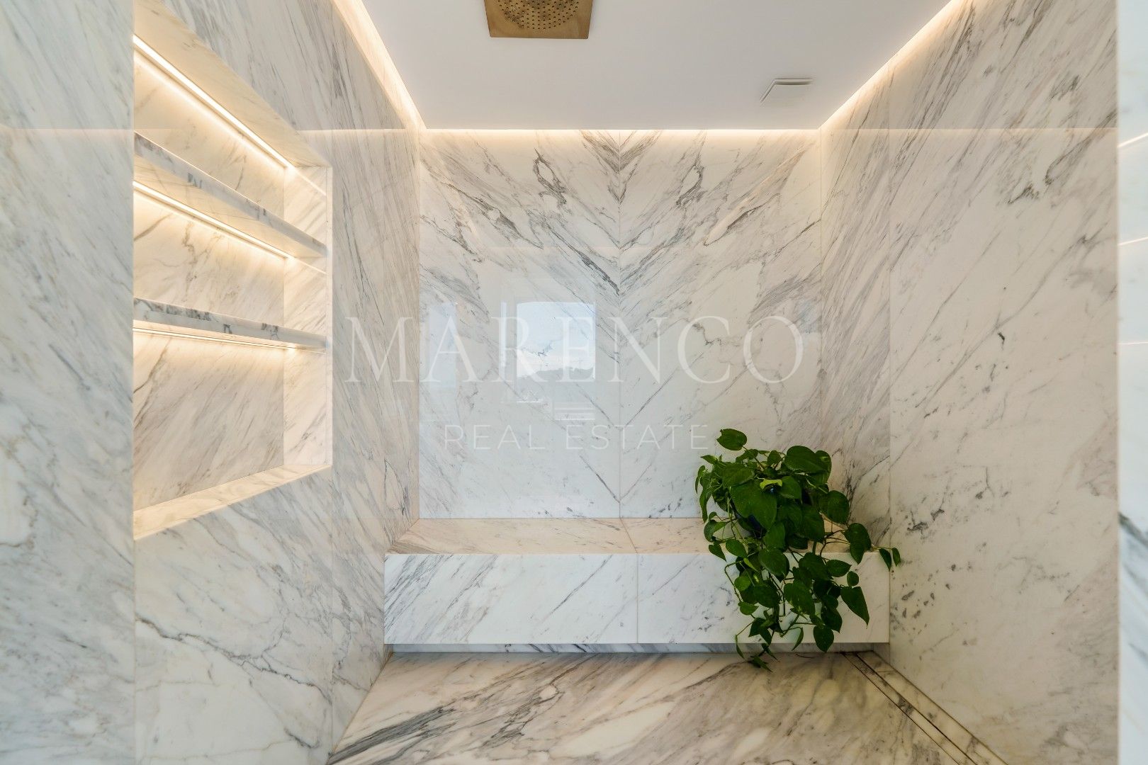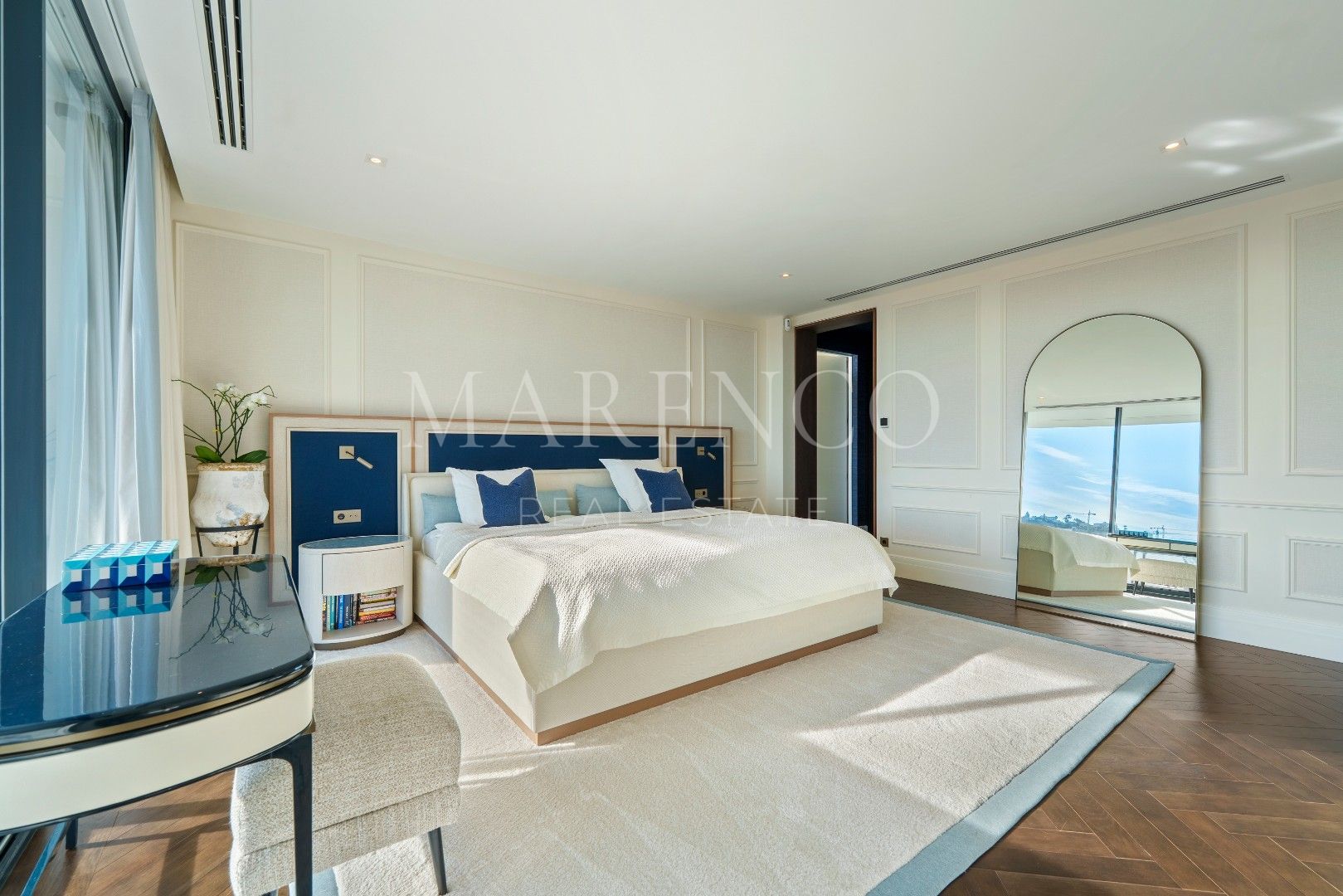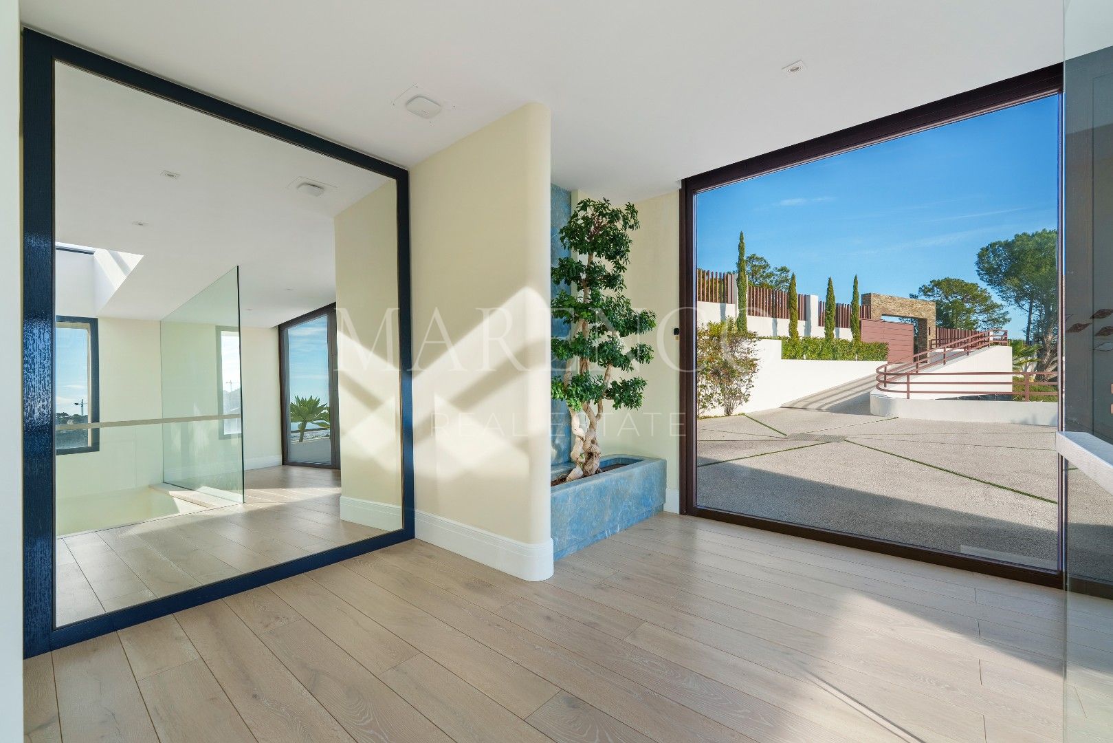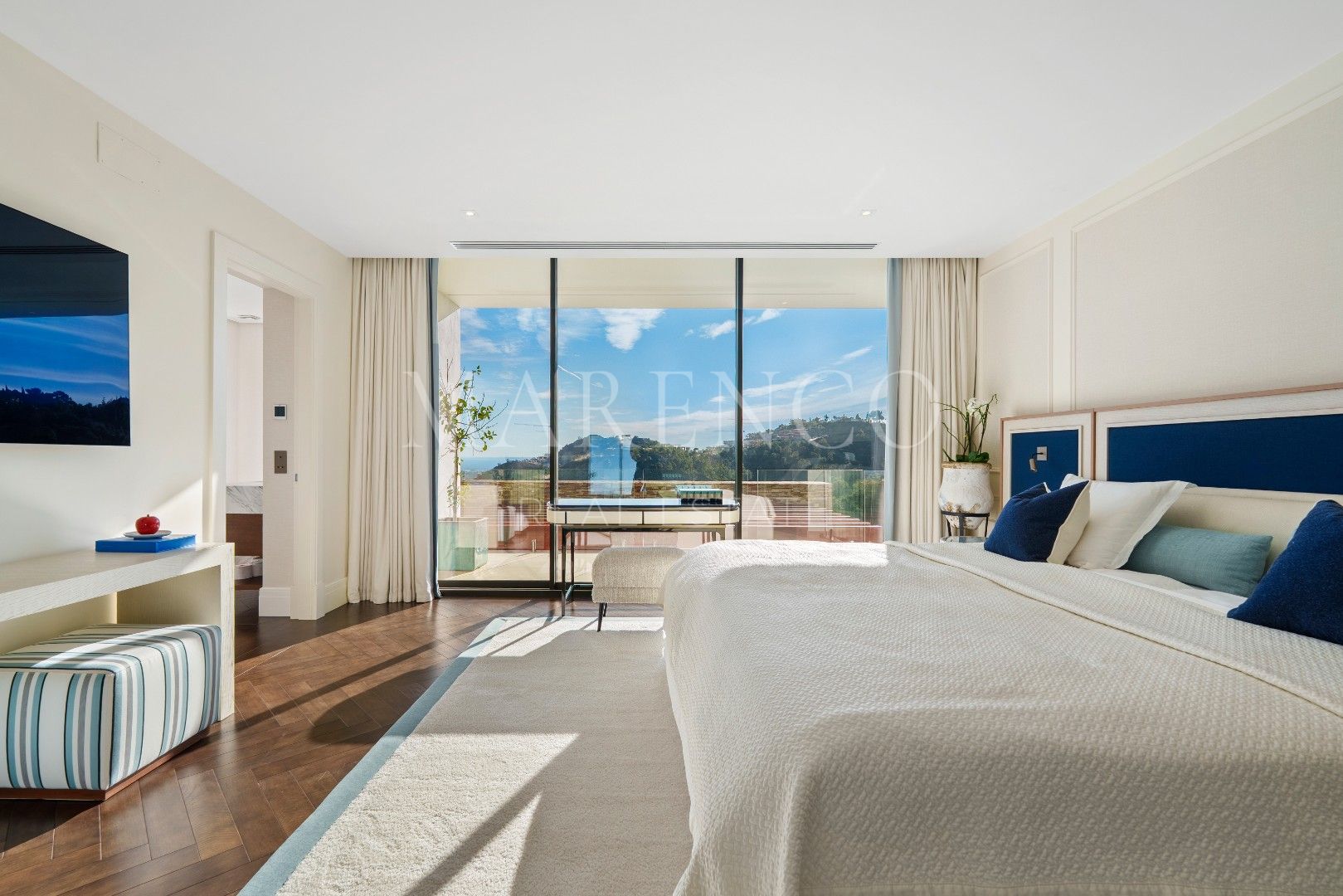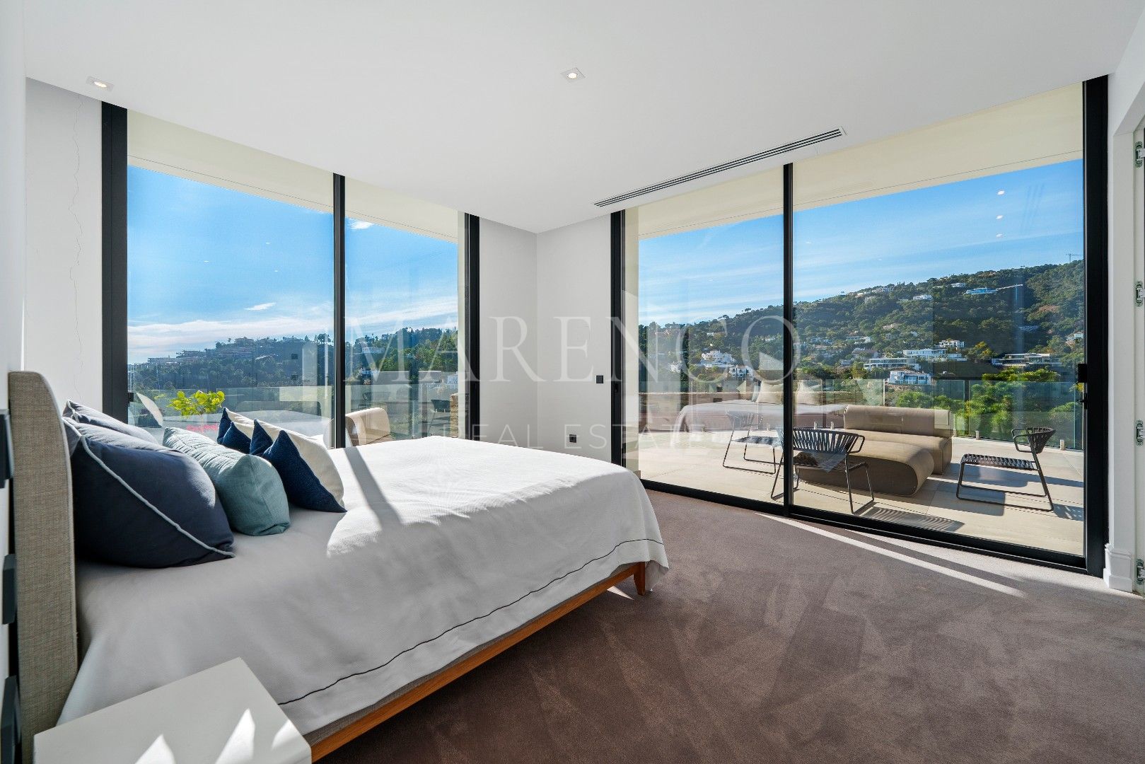 Die Immobilie bietet 715 m² Wohnfläche auf drei Ebenen sowie 453 m² Terrassenflächen. Sie verfügt über fünf Schlafzimmer, fünf Badezimmer und ein Gäste-WC. Die obere Etage ist überwiegend der Master-Suite mit Ankleidezimmer und Bibliothek gewidmet, ergänzt durch ein weiteres Gästezimmer mit eigenem Bad. Auf der Hauptebene befinden sich repräsentative Wohnbereiche, ein separates Esszimmer, eine moderne voll ausgestattete Küche, ein Weinkeller sowie eine Gästesuite mit direktem Zugang zur Terrasse und zum beheizten Salzwasser-Infinity-Pool. Im Untergeschoss befinden sich eine private Garage und ein separates Home-Office.