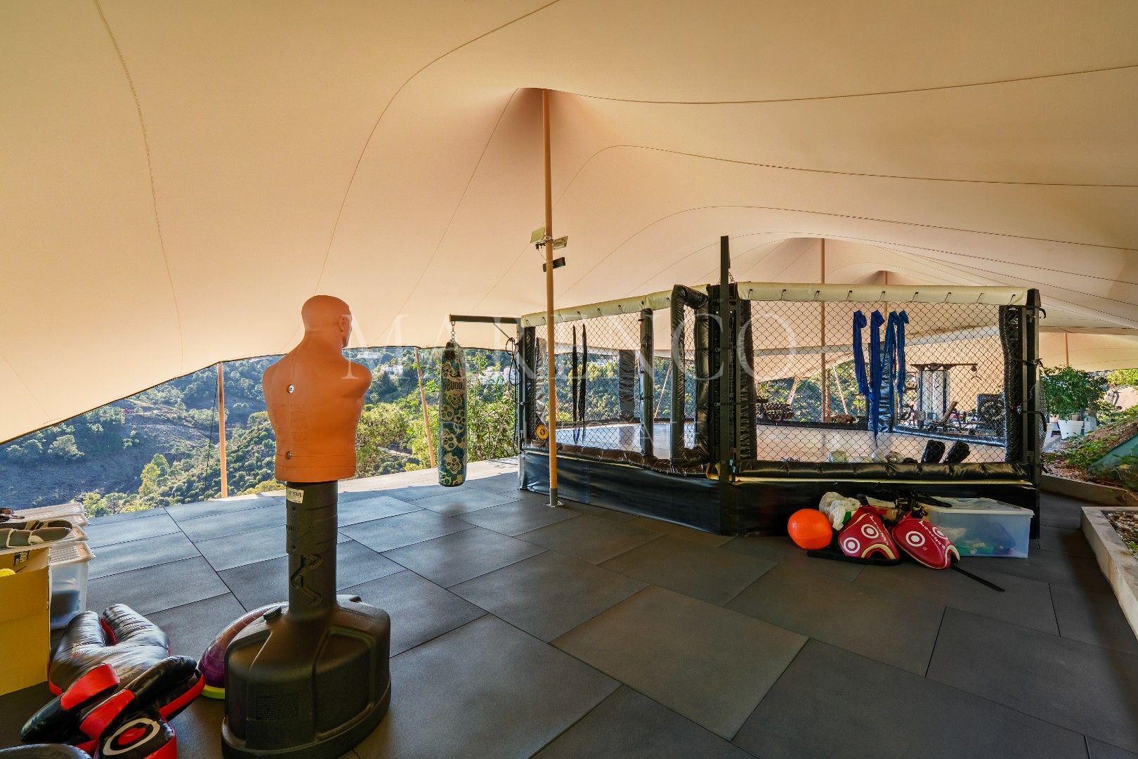 Zu den besonderen Ausstattungsmerkmalen zählen der beheizte Infinity-Pool, ein vollständig ausgestattetes Outdoor-Fitnessstudio mit professionellen Geräten und Boxring, ein umfassendes Smart-Home-System sowie Fußbodenheizung im gesamten Haus.